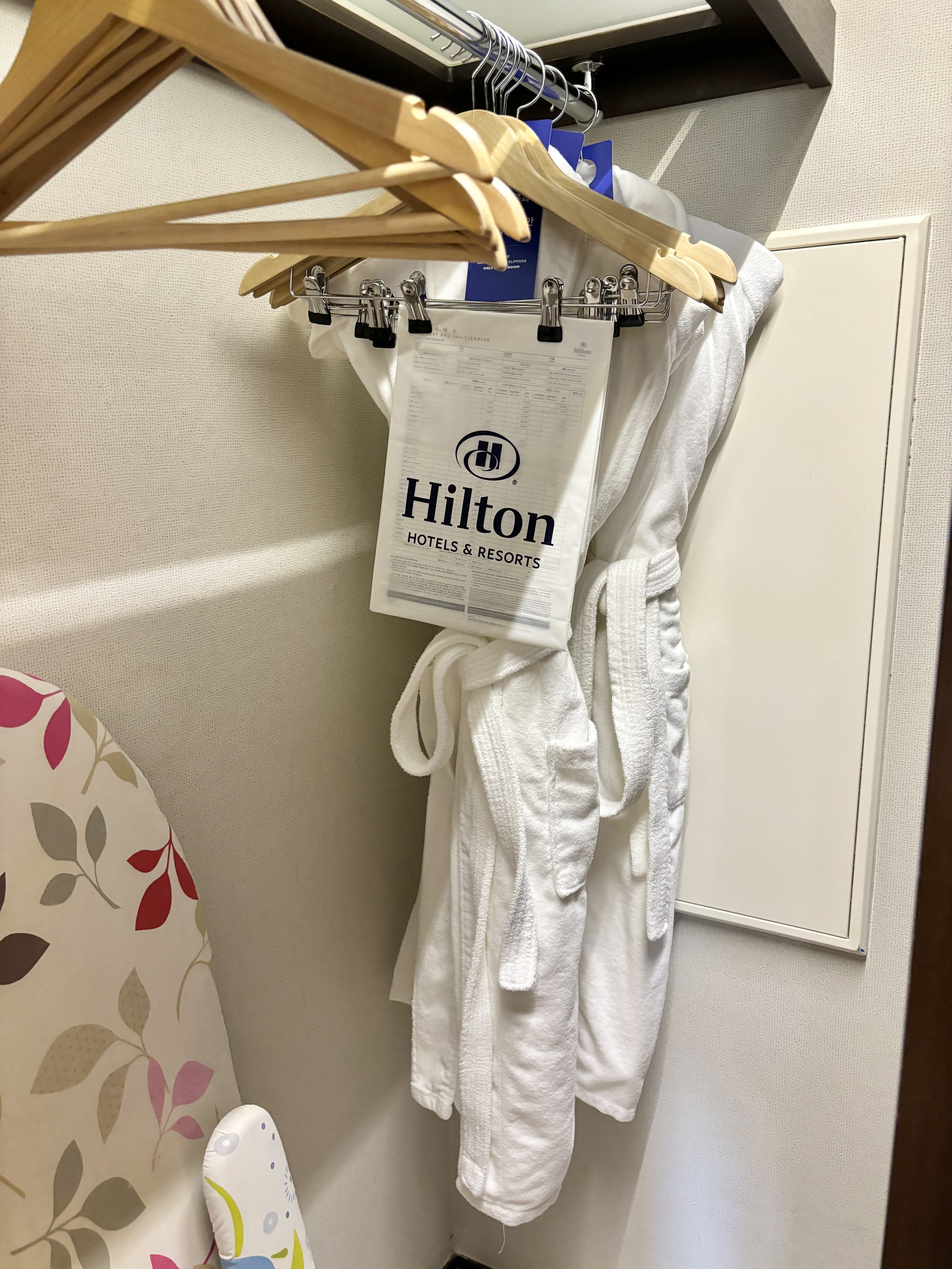 바로 옆에는 옷장이 있고, 옷장 안에 슬리퍼, 가운 등이 구비되어 있습니다.
