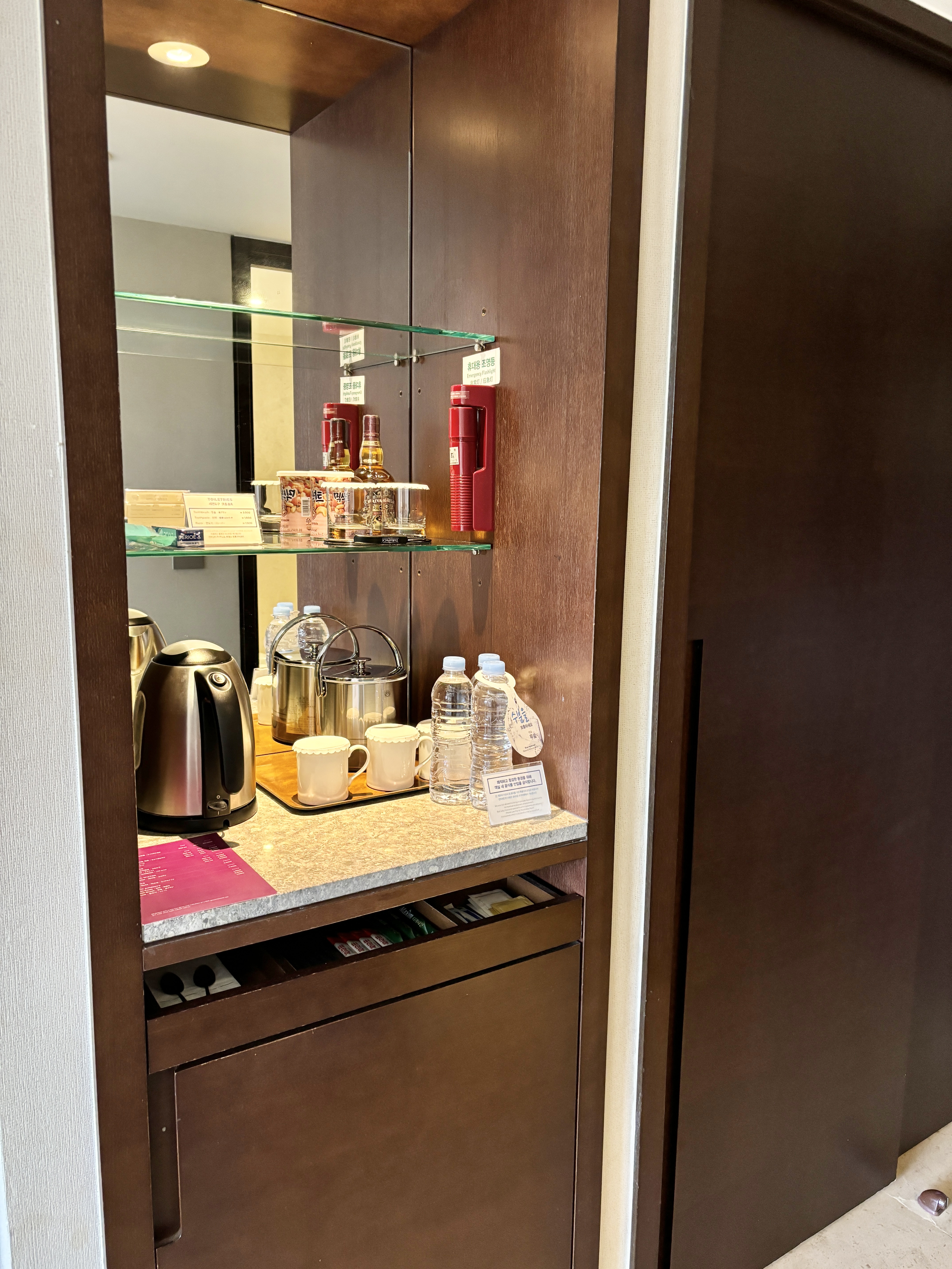 미니바에는 무료 생수와 티백, 커피 등이 준비되어 있어요.
