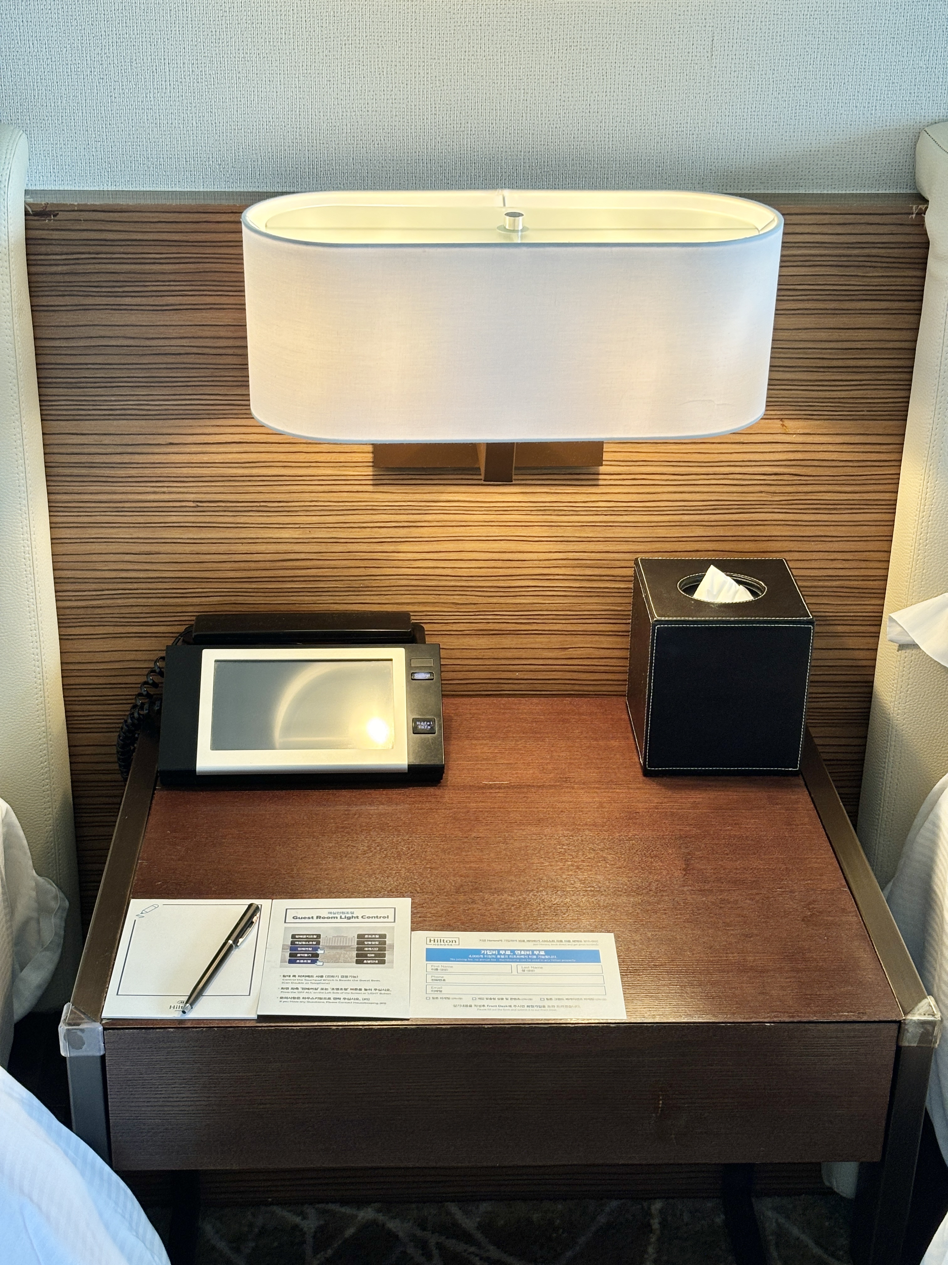 조명과 에어컨 온도 등을 컨트롤할 수 있는 패드 겸 전화기도 침대 옆 협탁에 세팅되어 있어요.