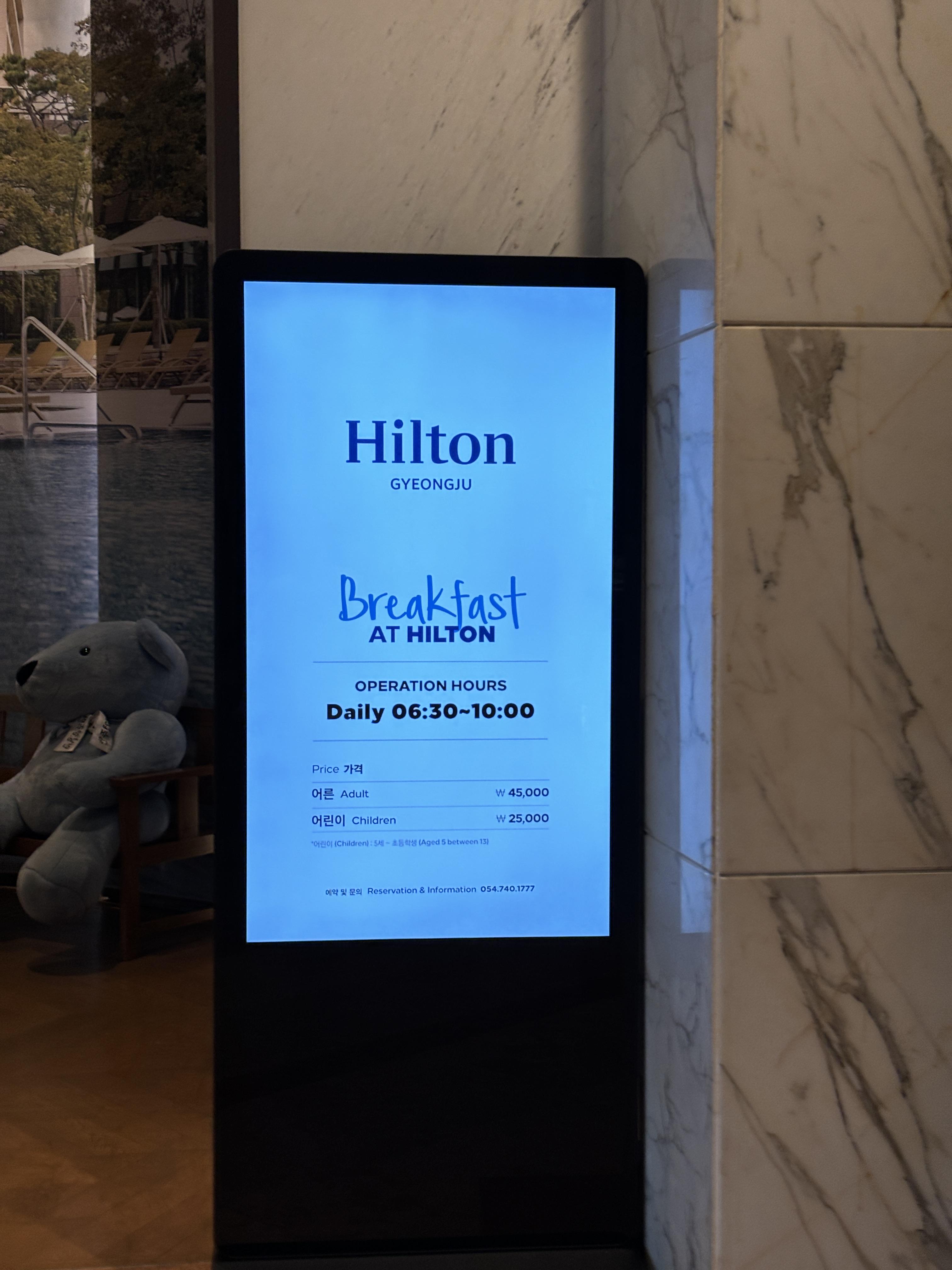 경주 힐튼호텔 조식 가격은 대인 45,000원, 어린이 25,000원입니다.