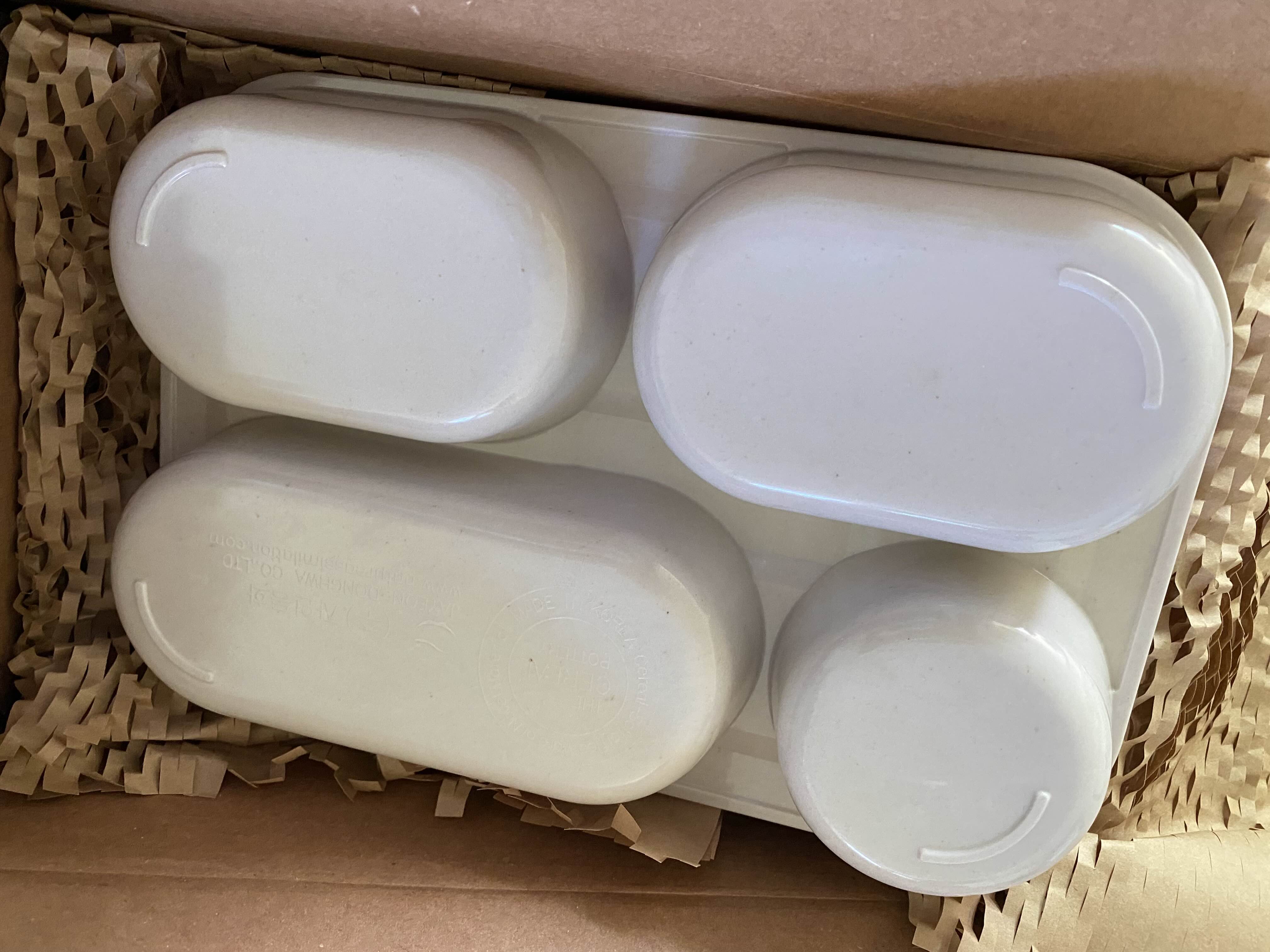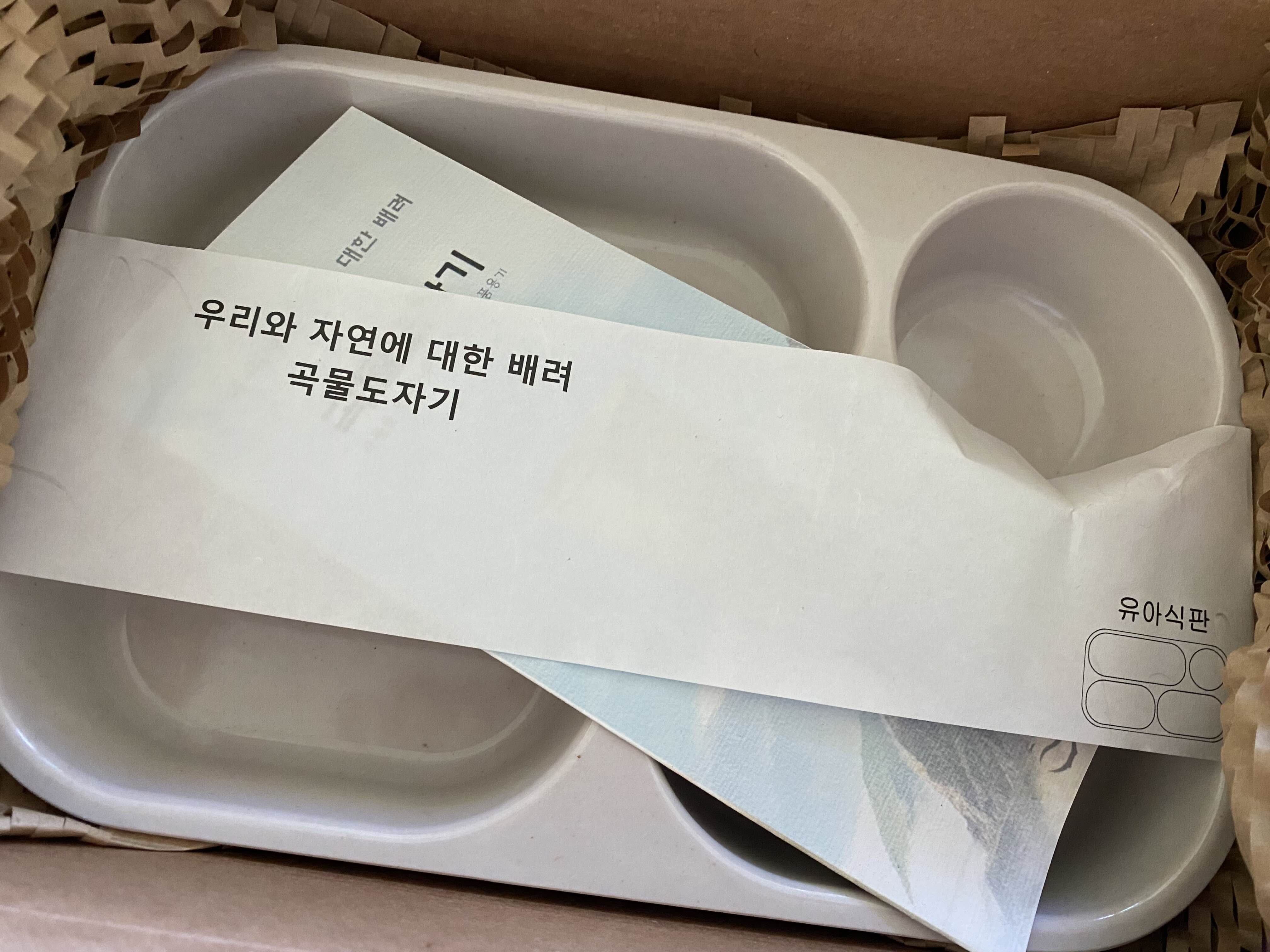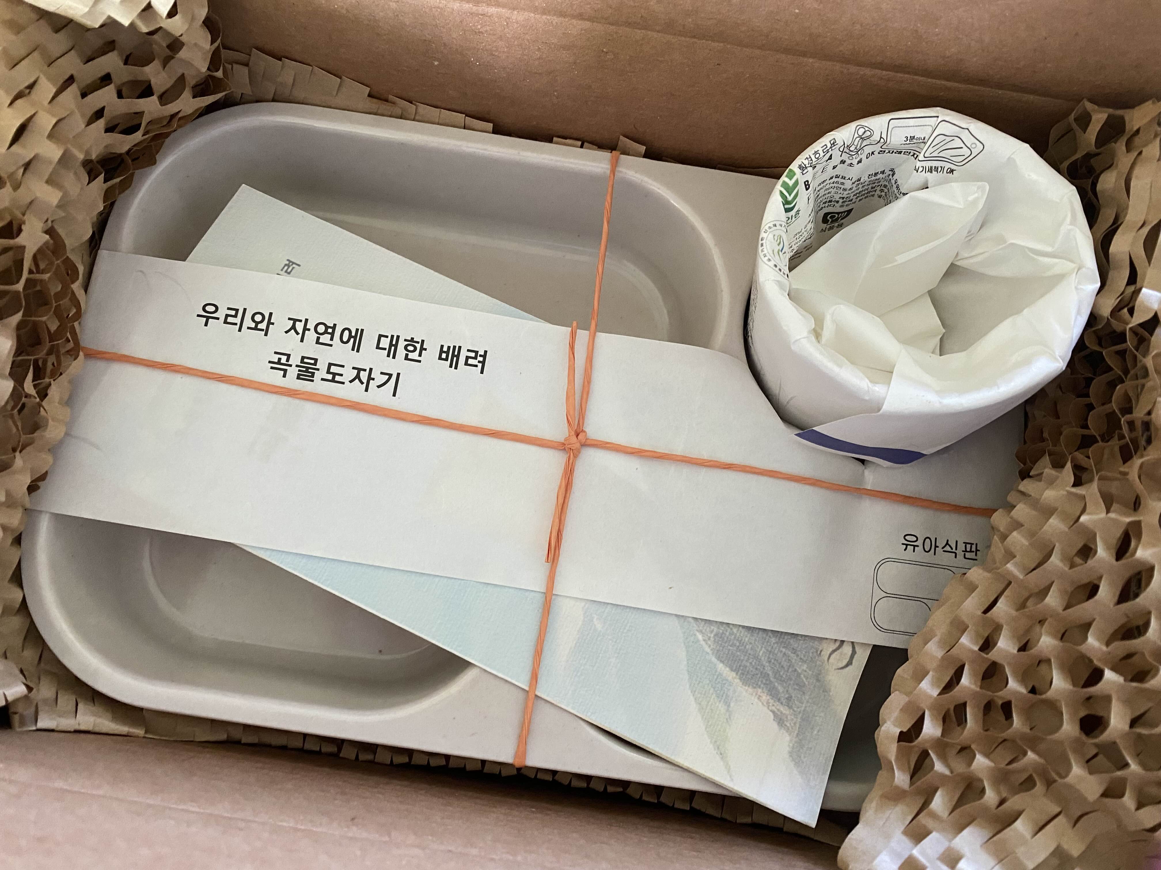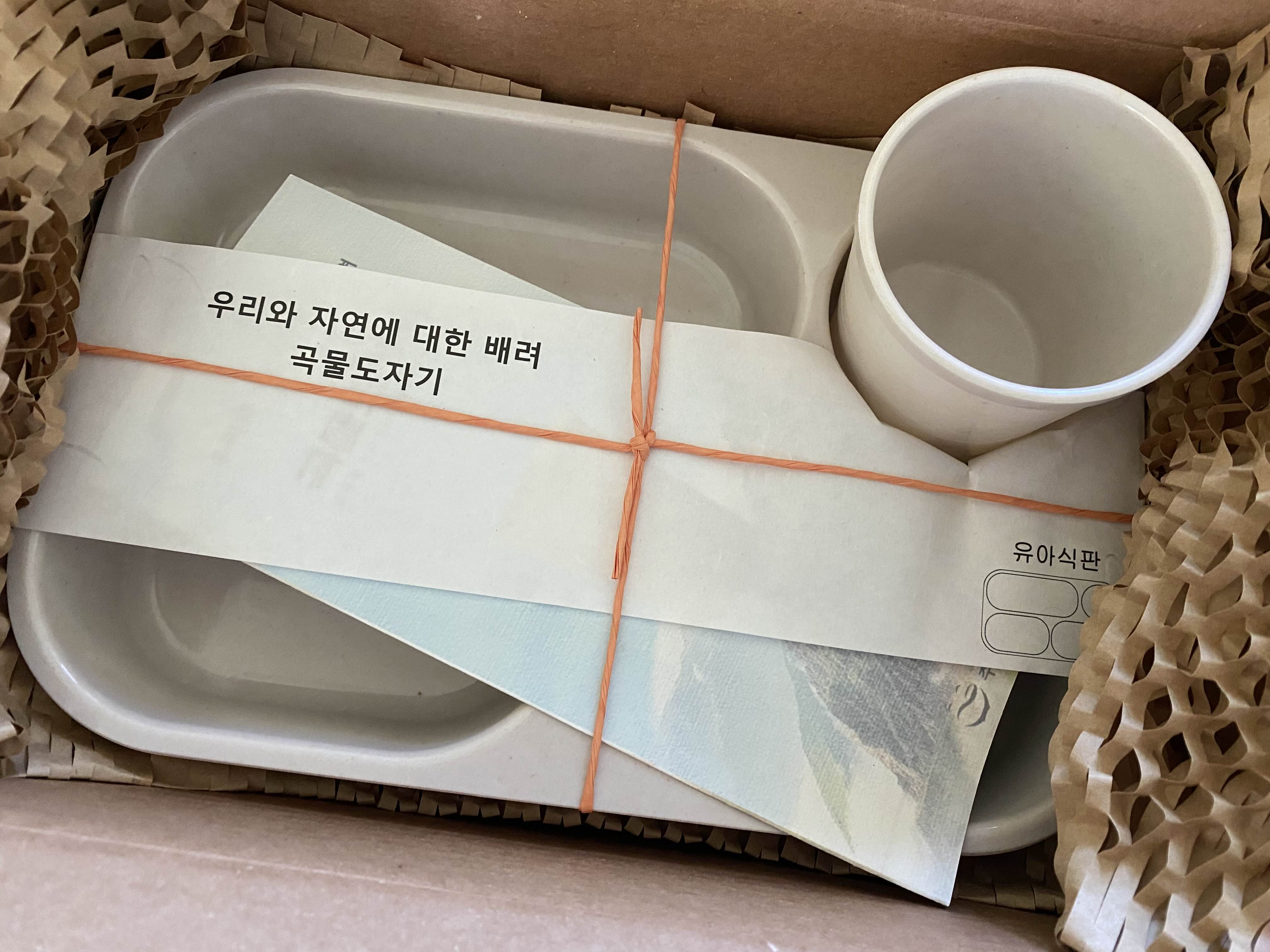 친환경 포장지를 뜯어보면 곡물도자기 유아식판과 컵이 들어있어요.