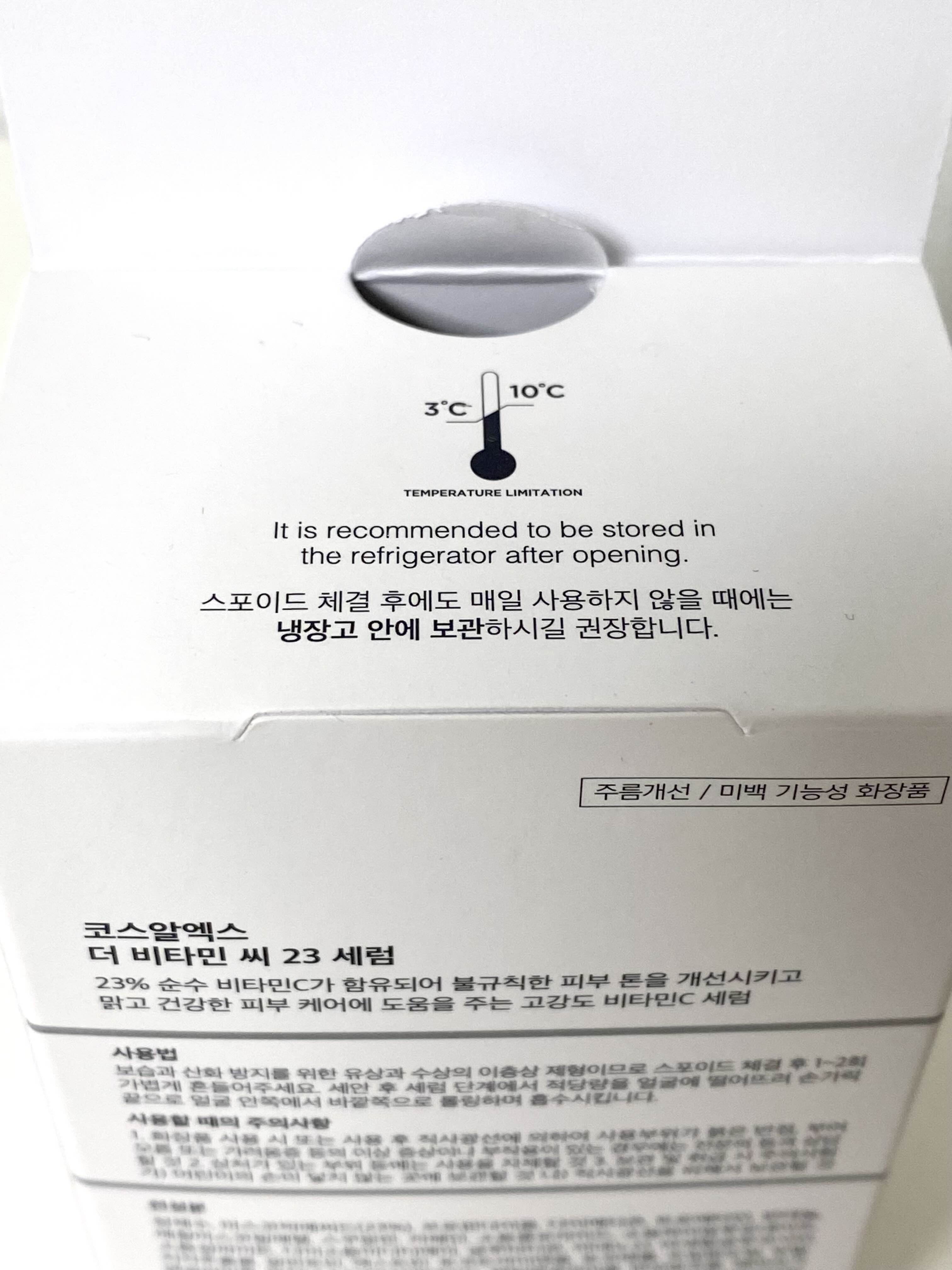코스알엑스 더비타민씨 23 세럼은 주름개선/미백 기능성 화장품으로 사용하지 않을 때는 냉장고 보관이 권장되는 제품이다.