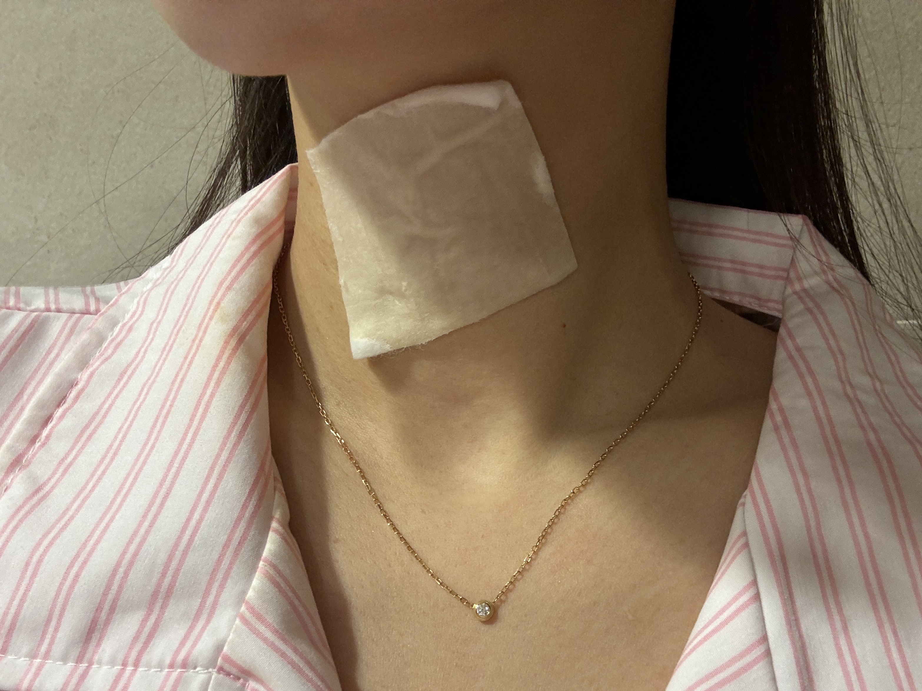 사진으로 보여드리기 위해 얼굴이 아닌 목에 부착해보았지만,,