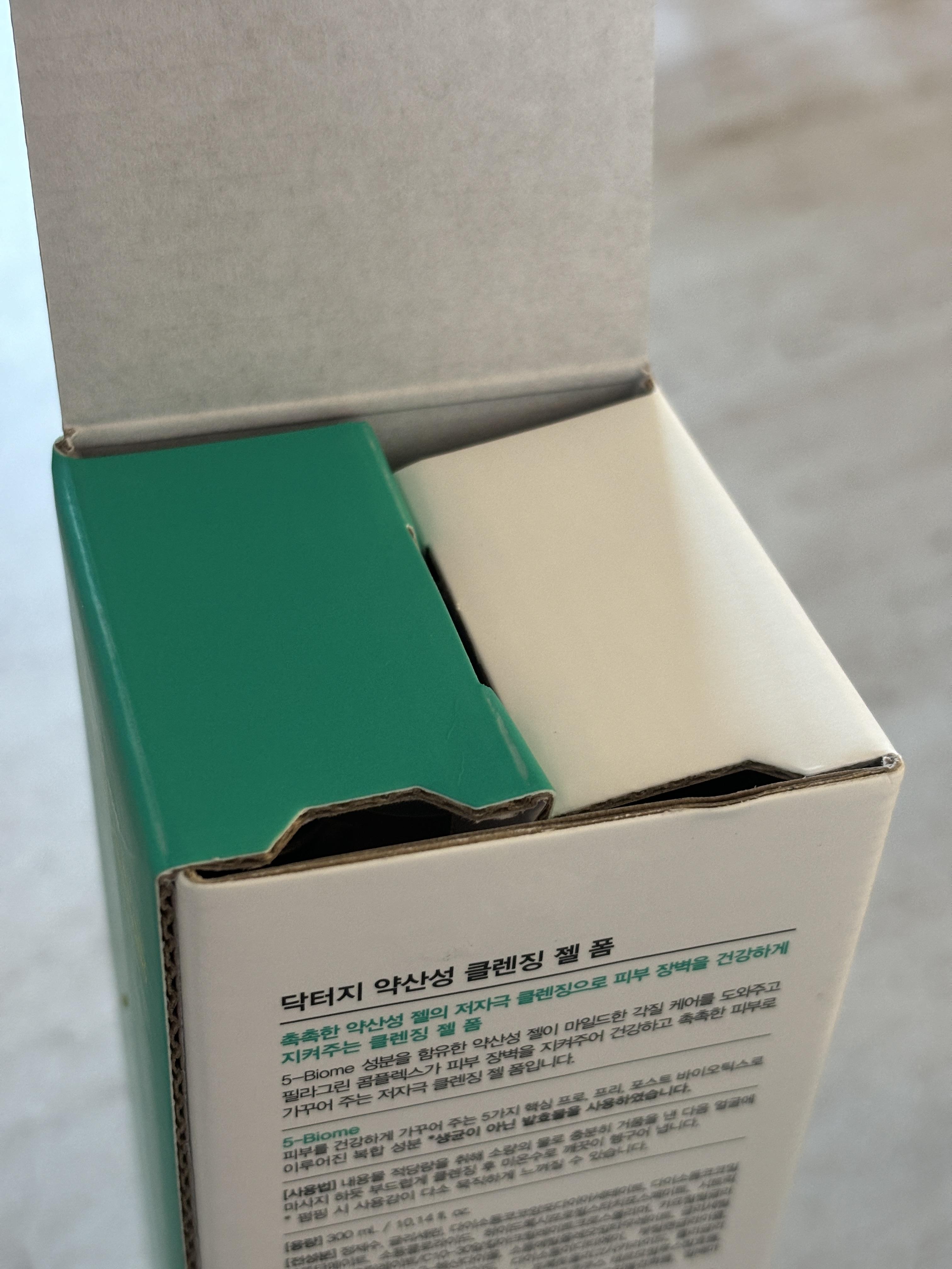 종이와 소이잉크로 제작된 친환경 패키지로 포장되어 온 닥터지 약산성 클렌징 젤 폼!