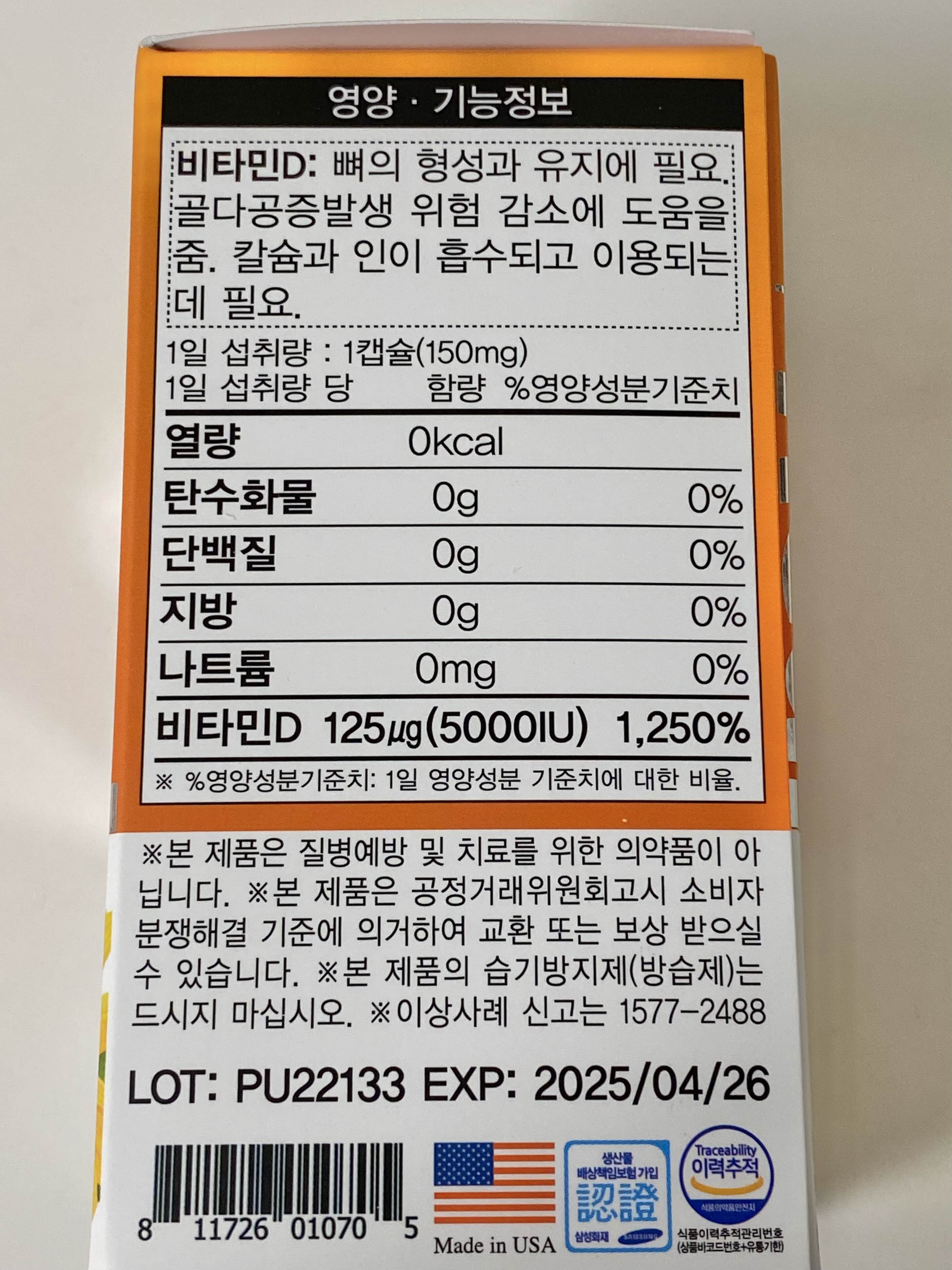 더리얼 비타민D 5000IU는 180캡슐이 들어 약 6개월간 섭취할 수 있는 영양제이다.