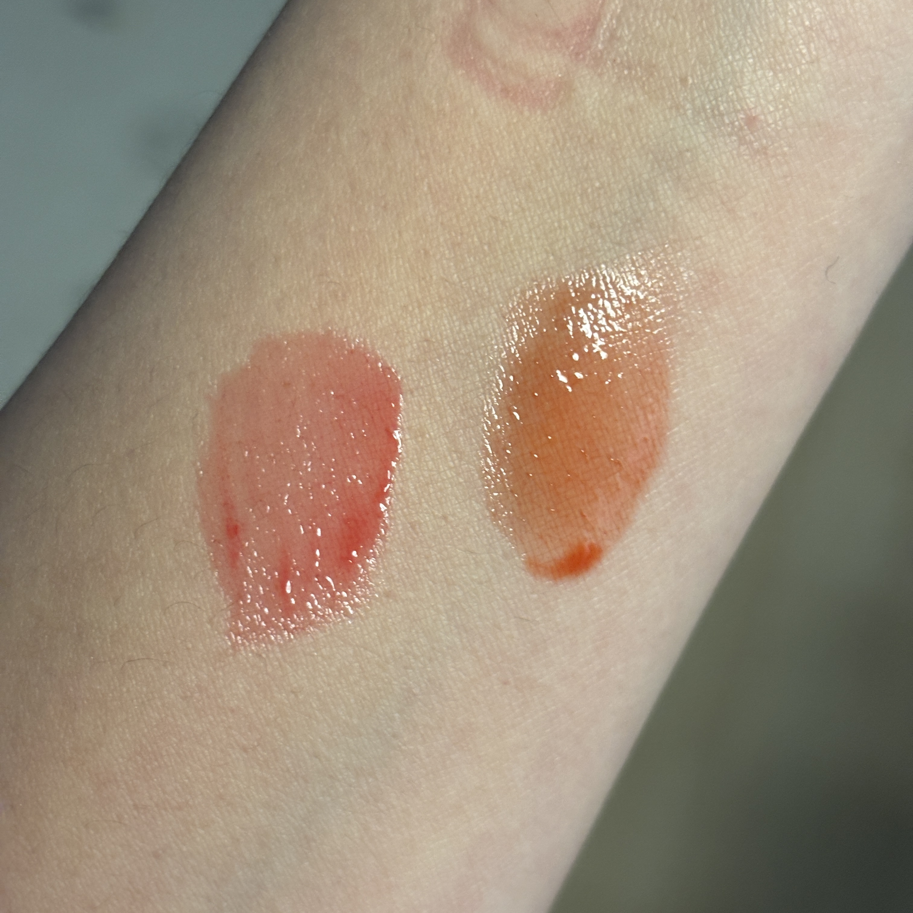 데이지크 쥬시 듀이 틴트 피치크러쉬 컬러와 비교해보았어요. 피치크러쉬 색상은 베리 컬러가 들어간 핑크 피치 컬러로 웜톤에게 어울리는 핑크톤의 컬러인데요. 이에 비해 칠리셔벗 색상은 확실히 주황끼가 더 도는 것을 확인하실 수 있어요.