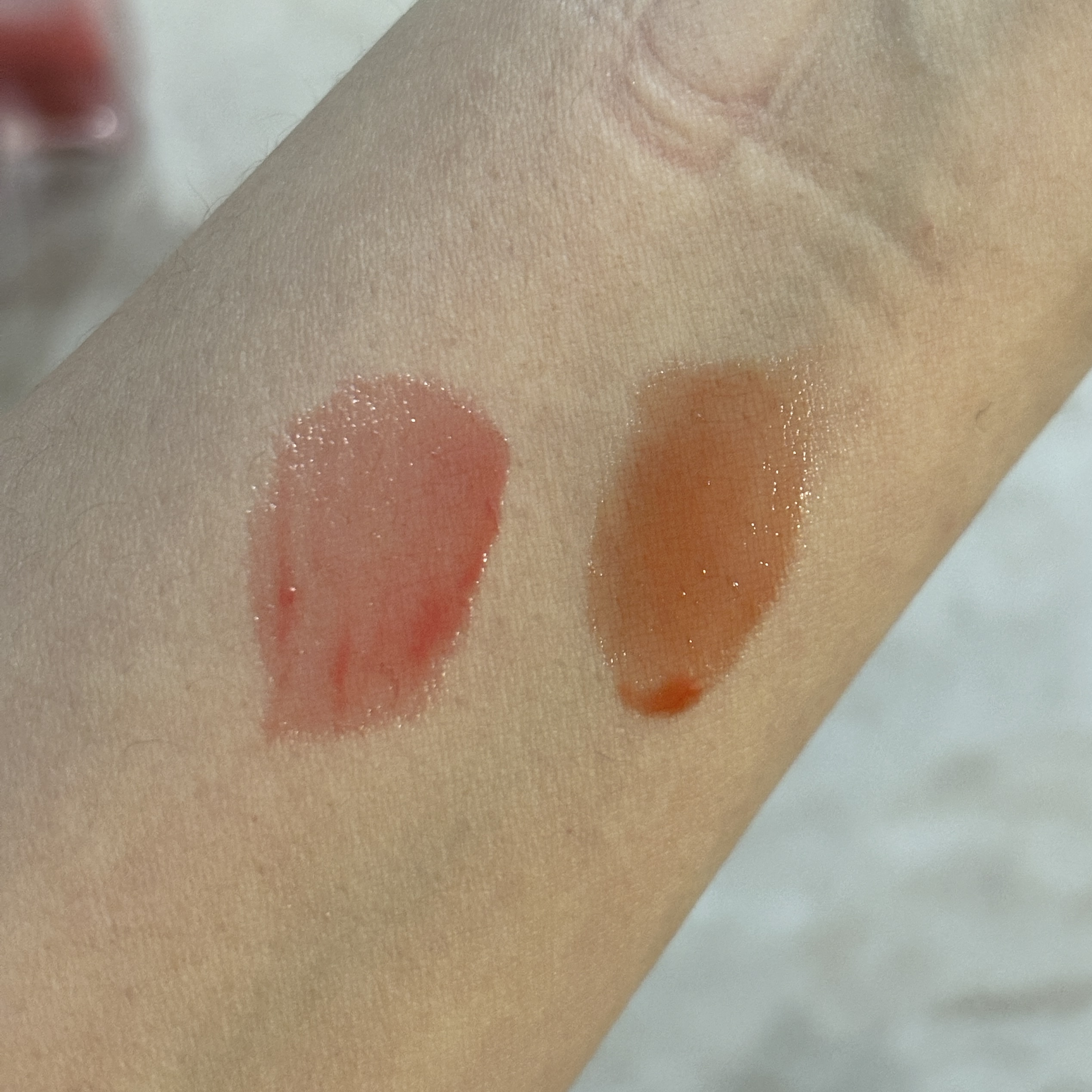 데이지크 쥬시 듀이 틴트 피치크러쉬 컬러와 비교해보았어요. 피치크러쉬 색상은 베리 컬러가 들어간 핑크 피치 컬러로 웜톤에게 어울리는 핑크톤의 컬러인데요. 이에 비해 칠리셔벗 색상은 확실히 주황끼가 더 도는 것을 확인하실 수 있어요.