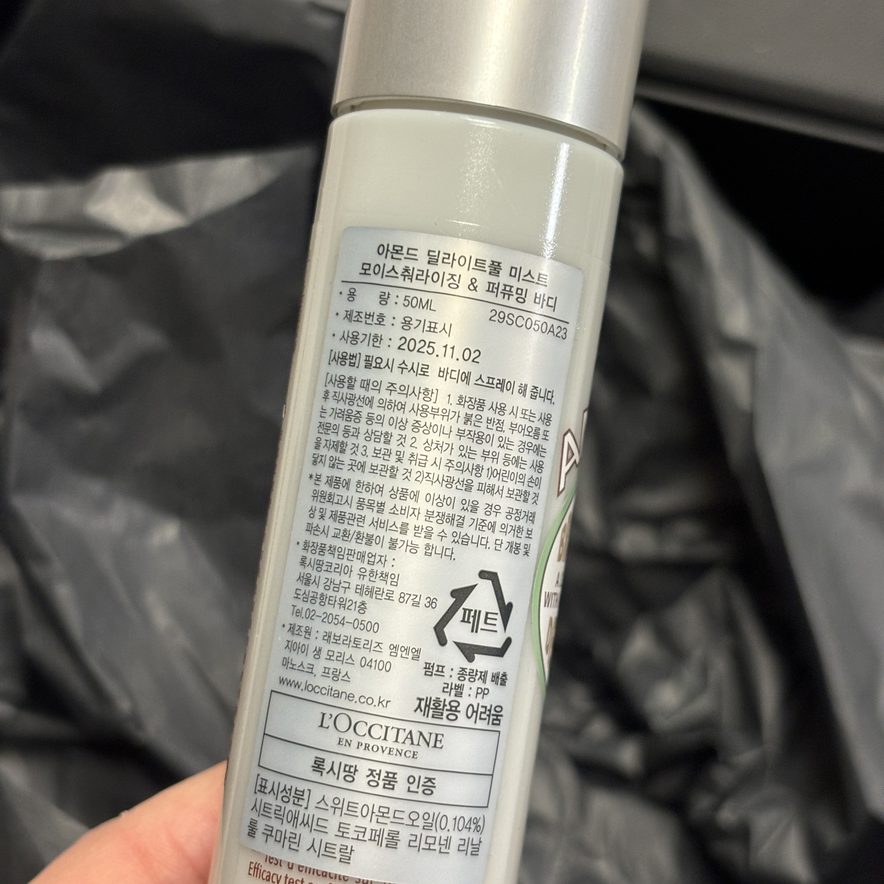 록시땅 아몬드 바디 미스트는 프로방스산 스위트 아몬드 오일이 함유되어 보습, 피부 보호와 향을 선사하는 제품이라고 해요.