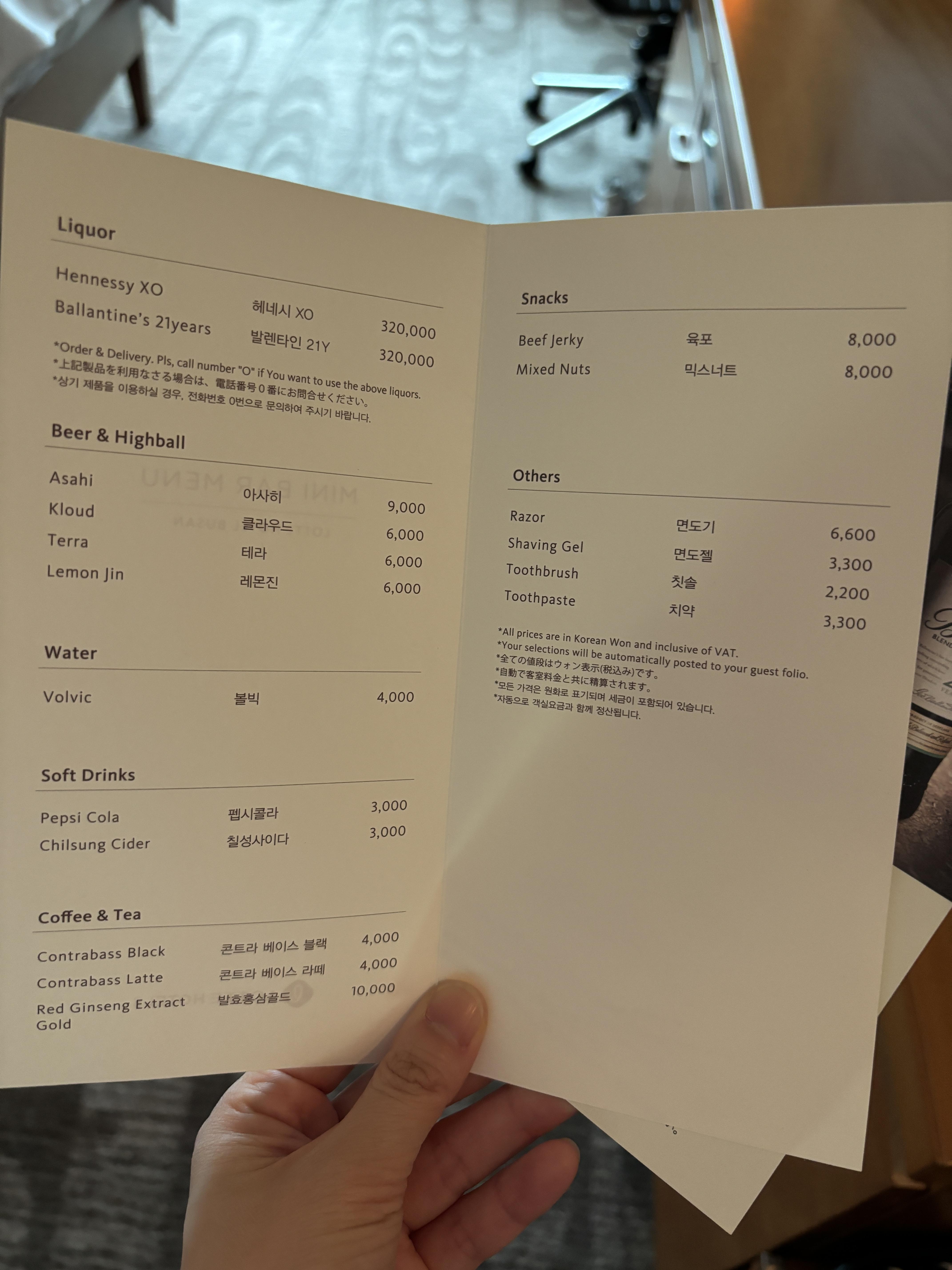 무료로 제공되는 생수와 미니바 메뉴도 서랍장 위에 올려져 있더라구요.