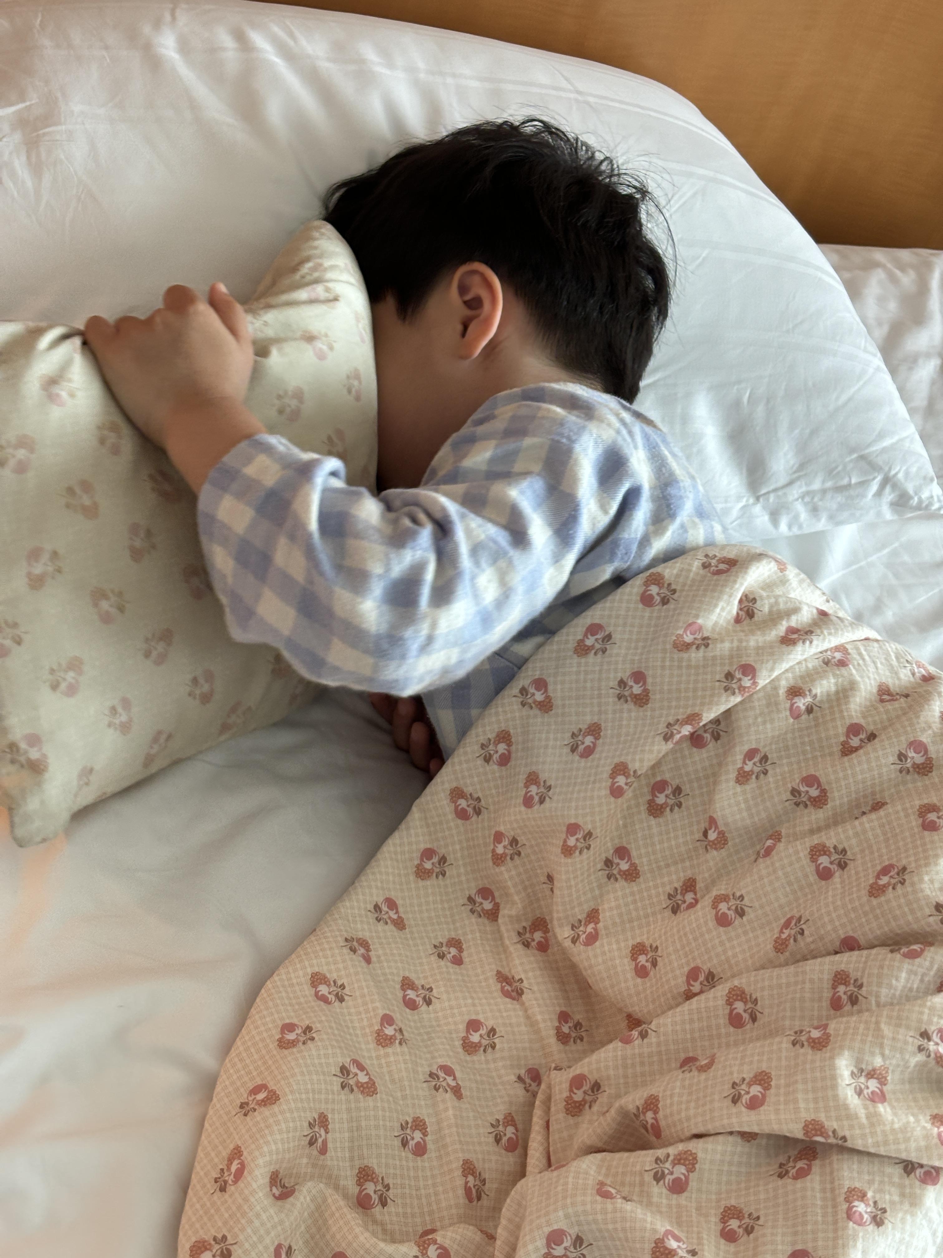 애착 베개와 블랭킷 챙겨와서 꿀잠 잔 아들