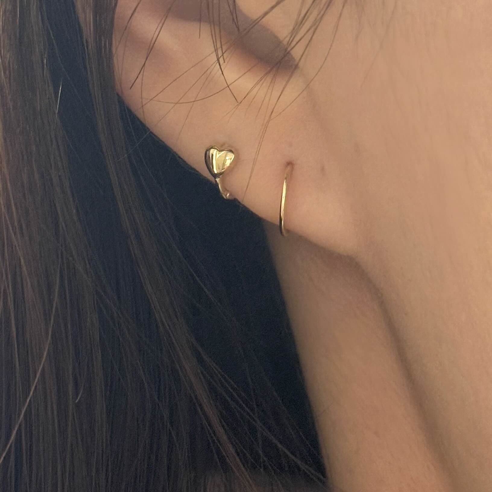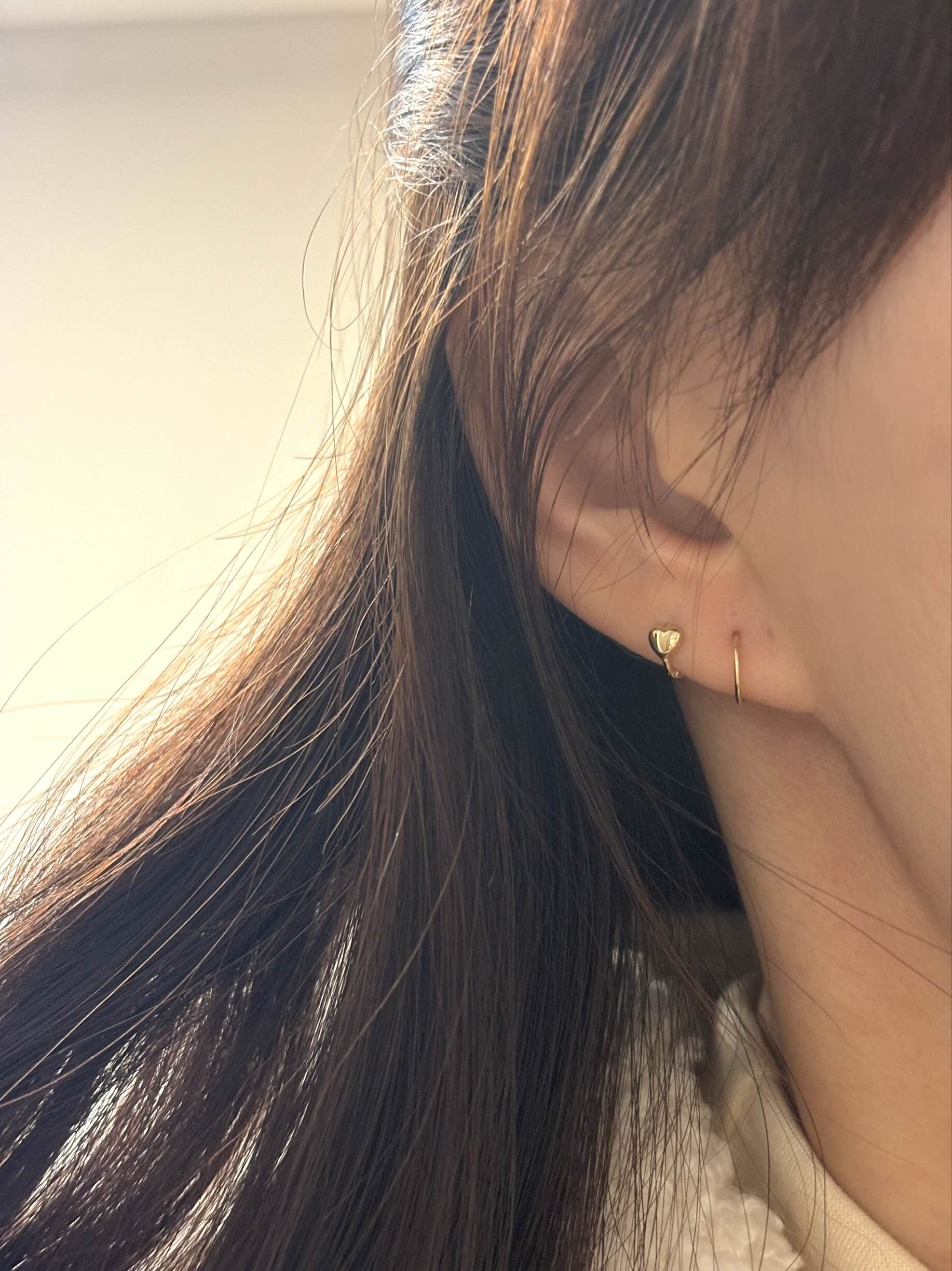 오른쪽 귀에는 룬느 14k 데일리 원터치 링 귀걸이와 미니 하트 6mm 원터치 귀걸이를 함께 착용했어요. 하트 귀걸이가 포인트가 되어 너무 이쁘더라구요!