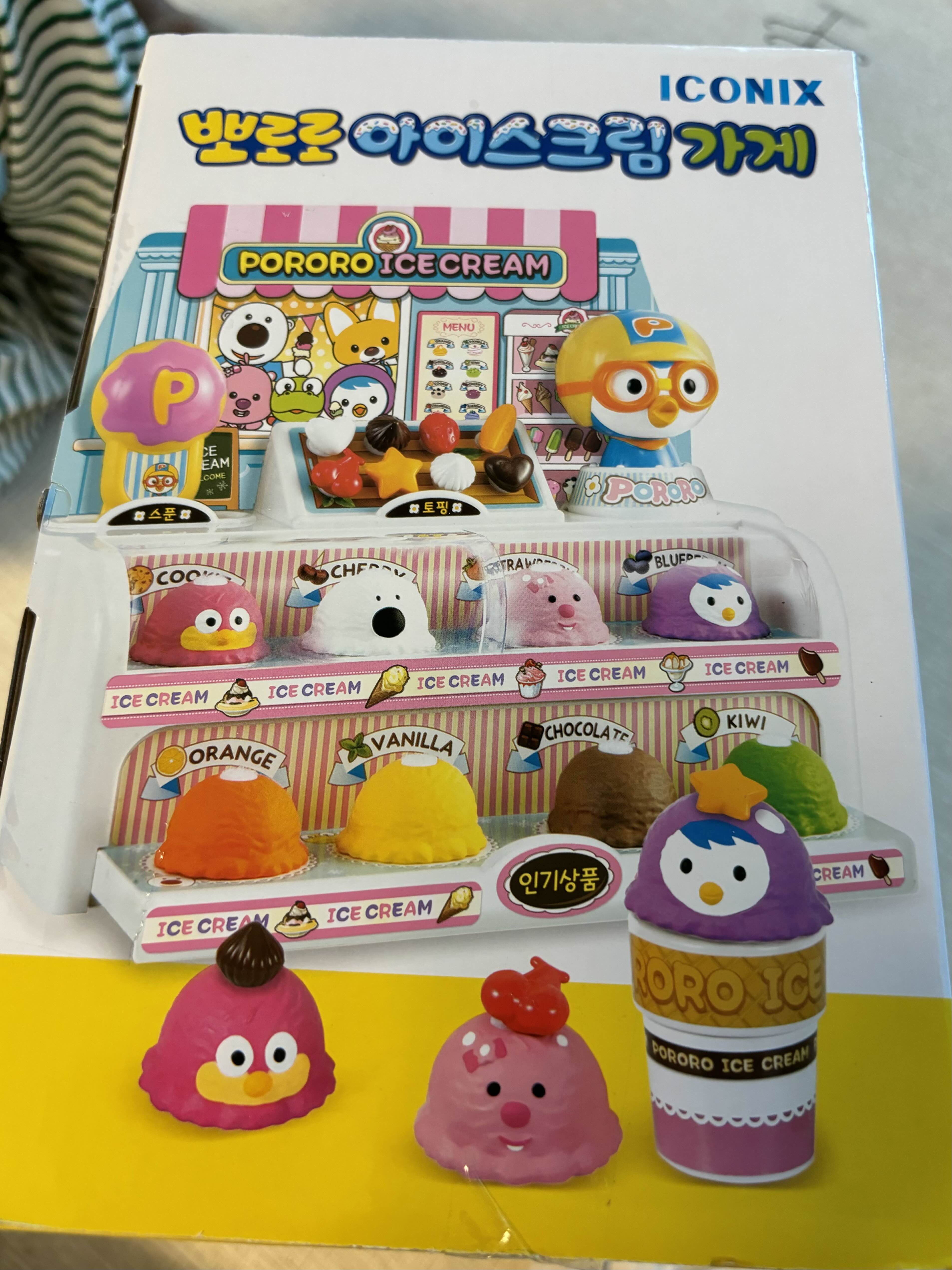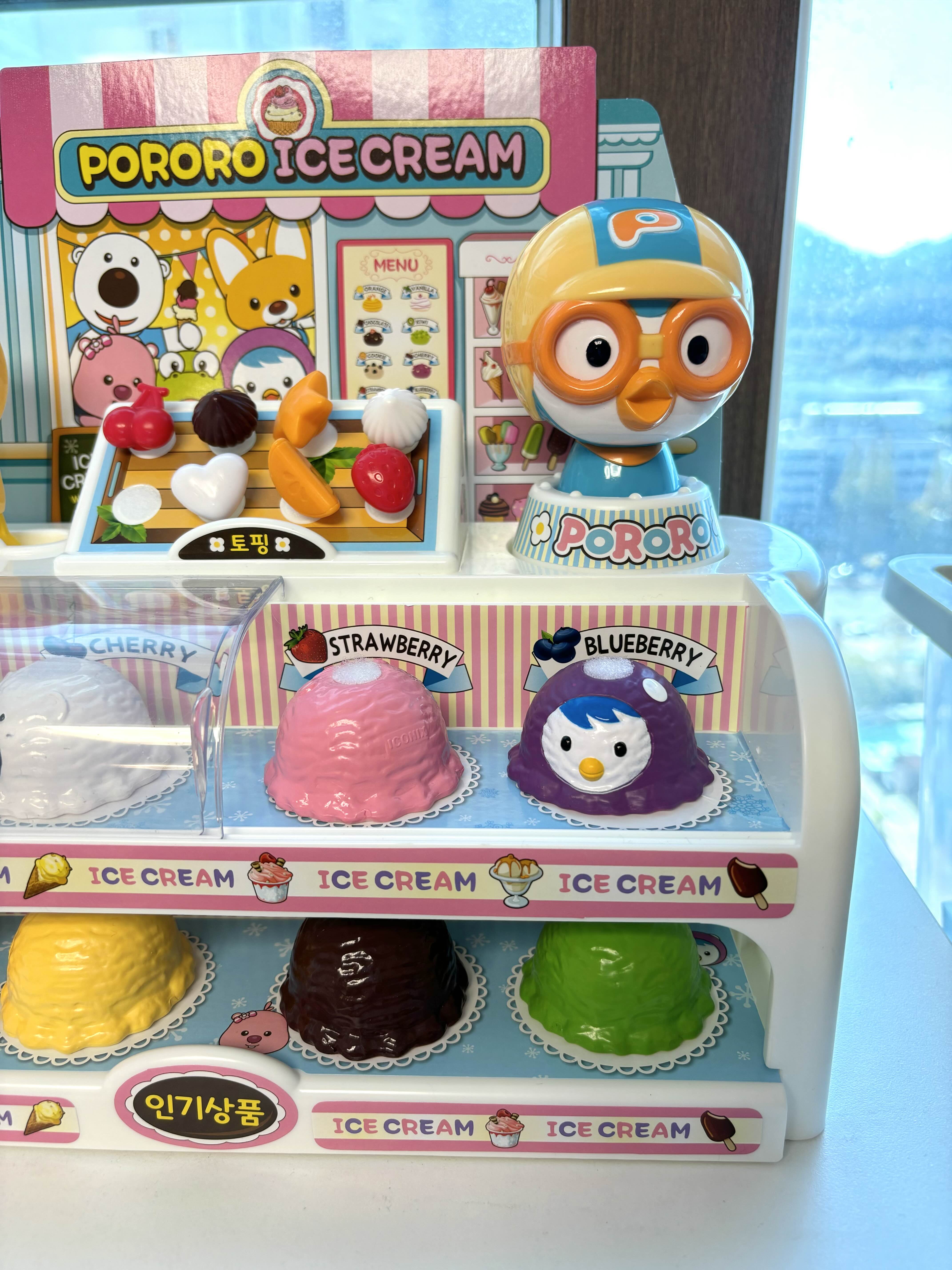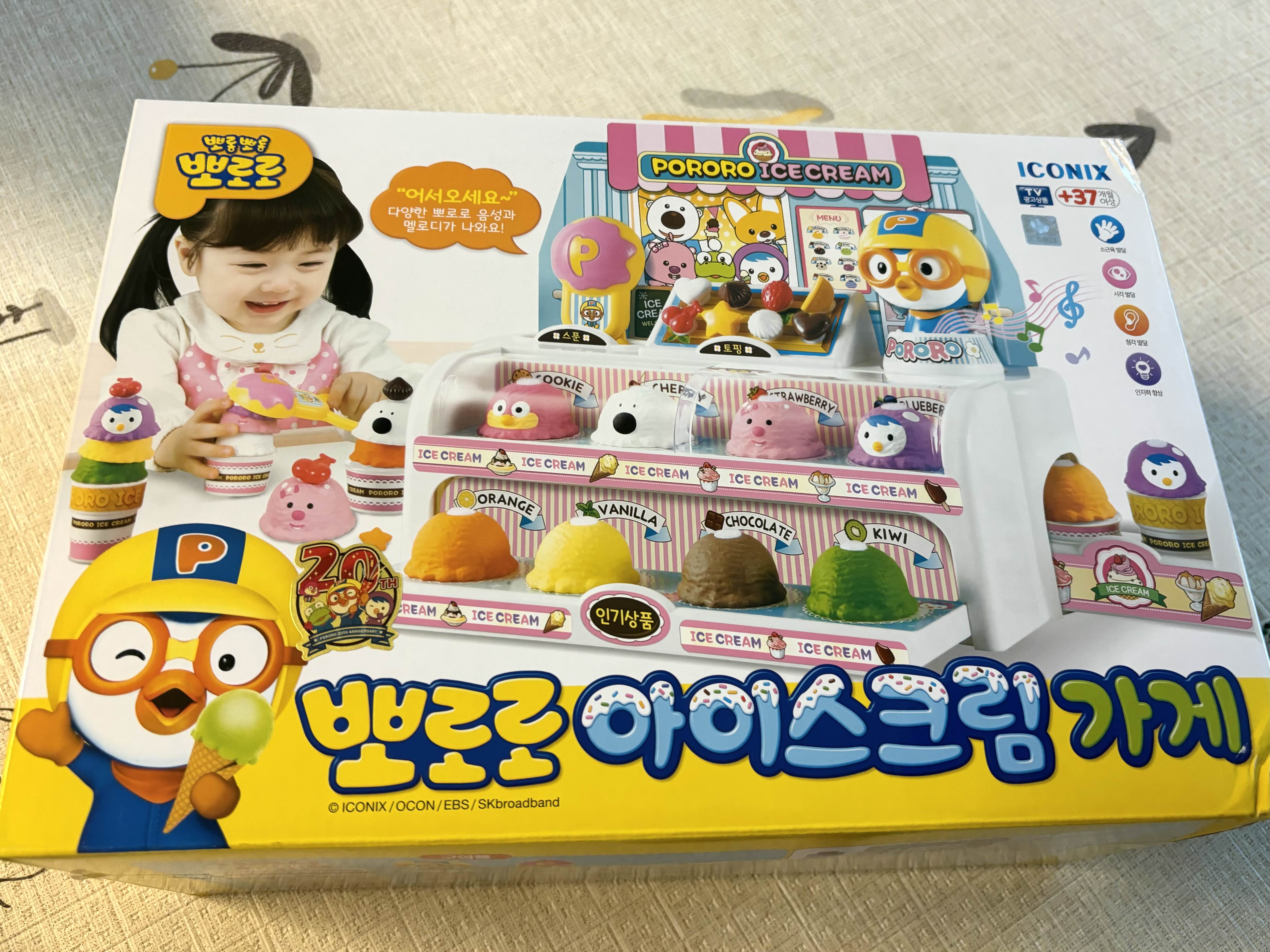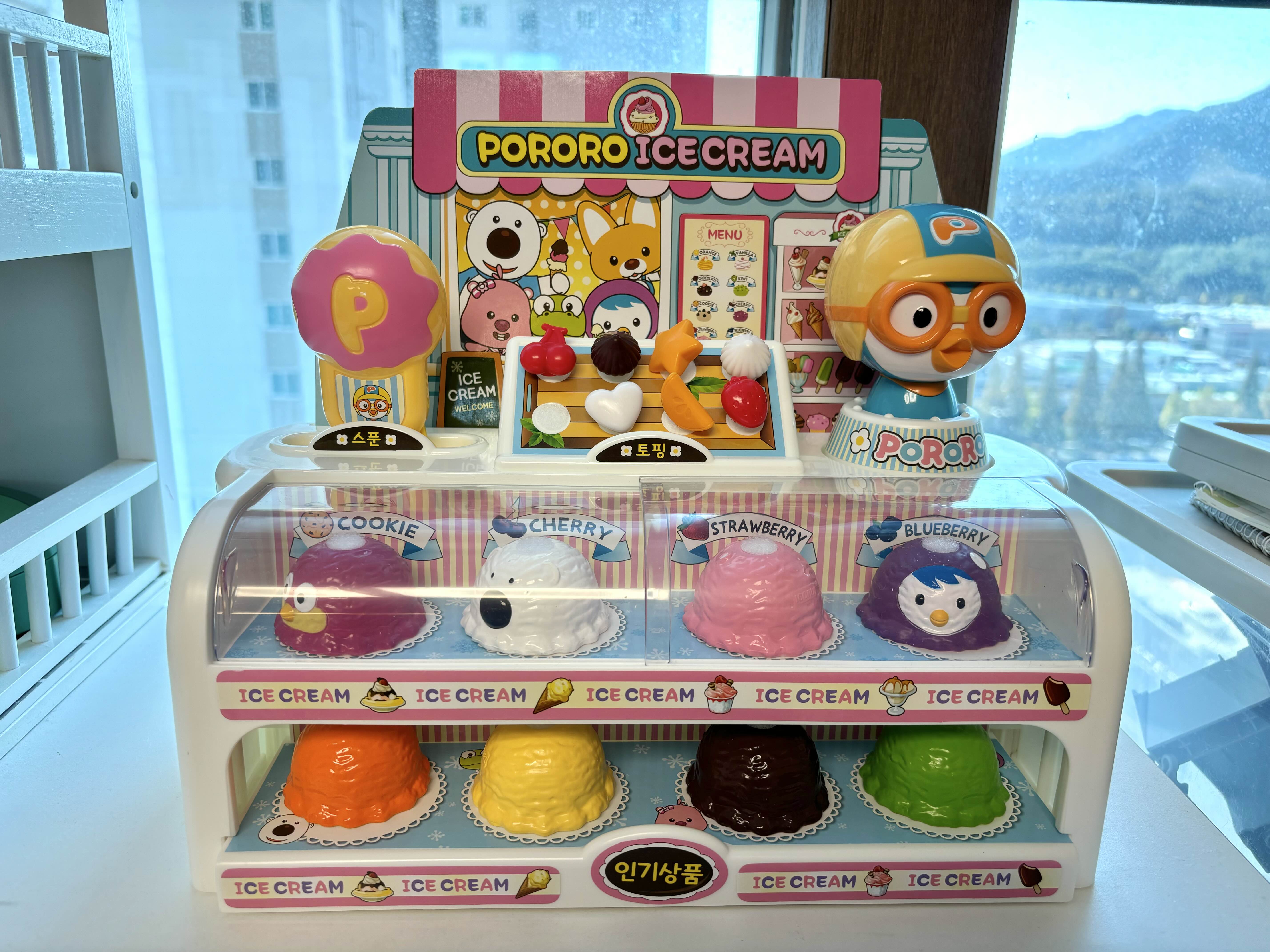 레고랑 기차 잘 가지고 놀다가 요즘 좀 시들해보여서 새로운 장난감을 고민하다가 부쩍 역할놀이 하는걸 좋아해서 뽀로로 아이스크림 가게 장난감을 구입해봤어요 🙂