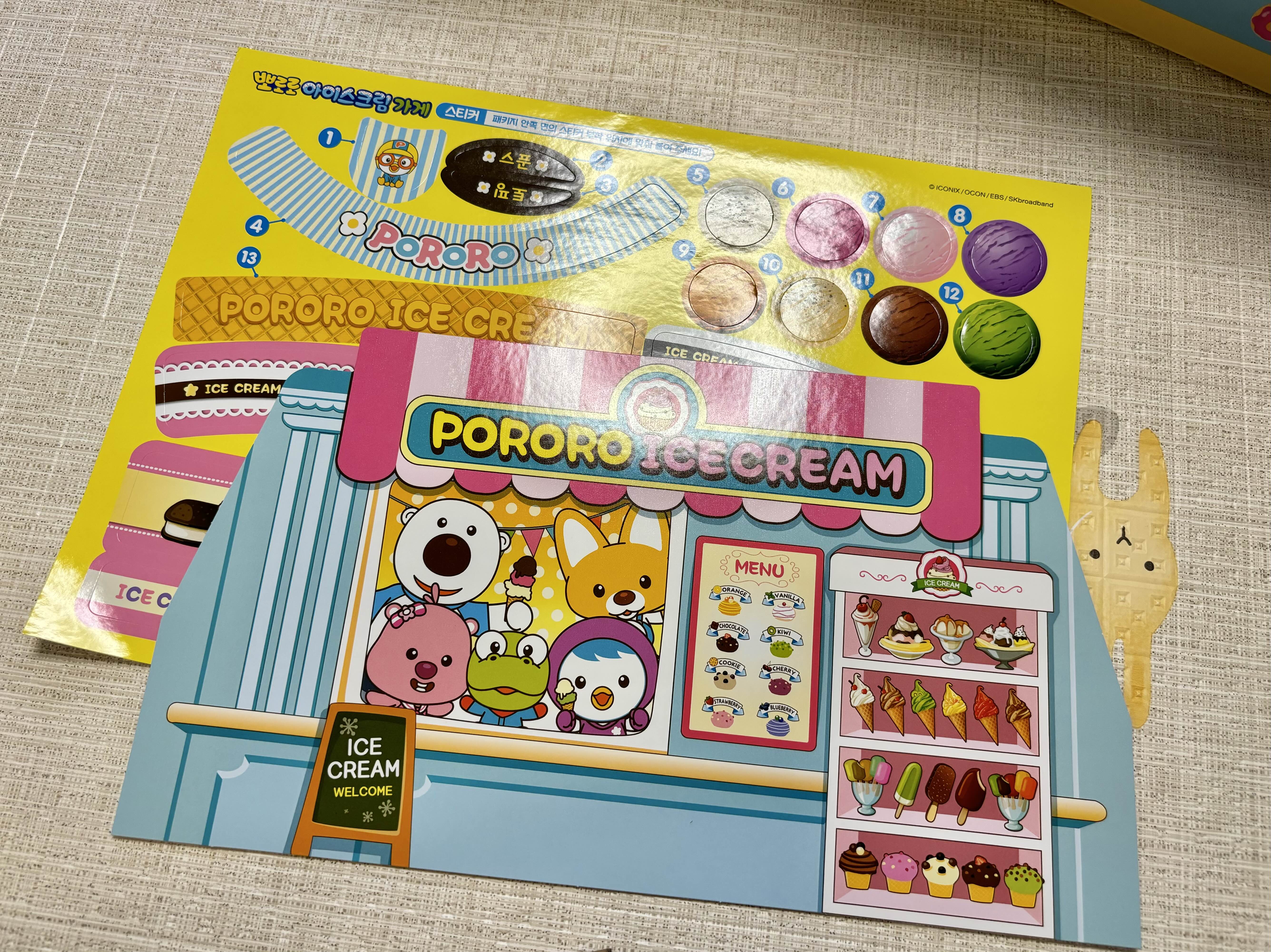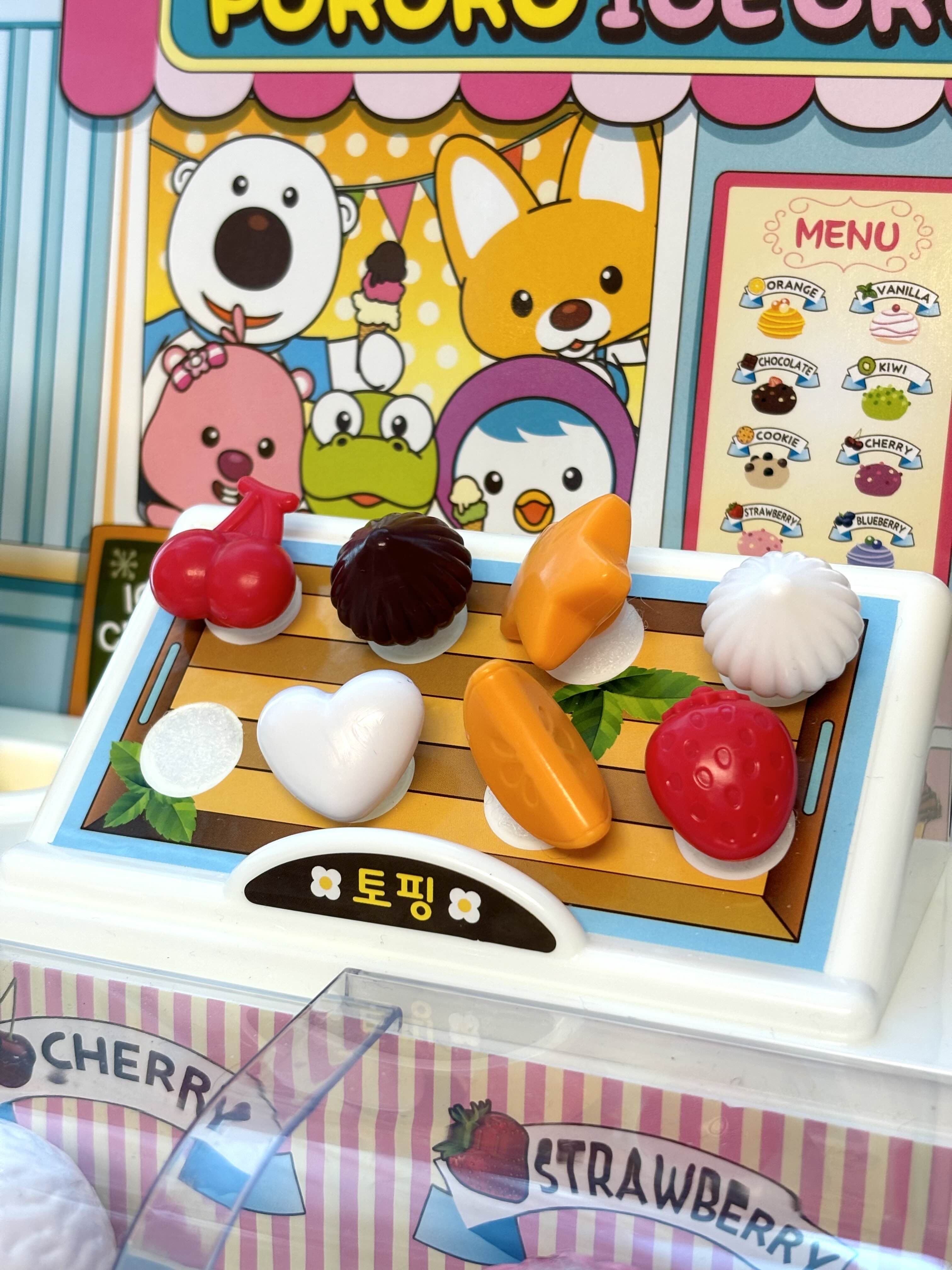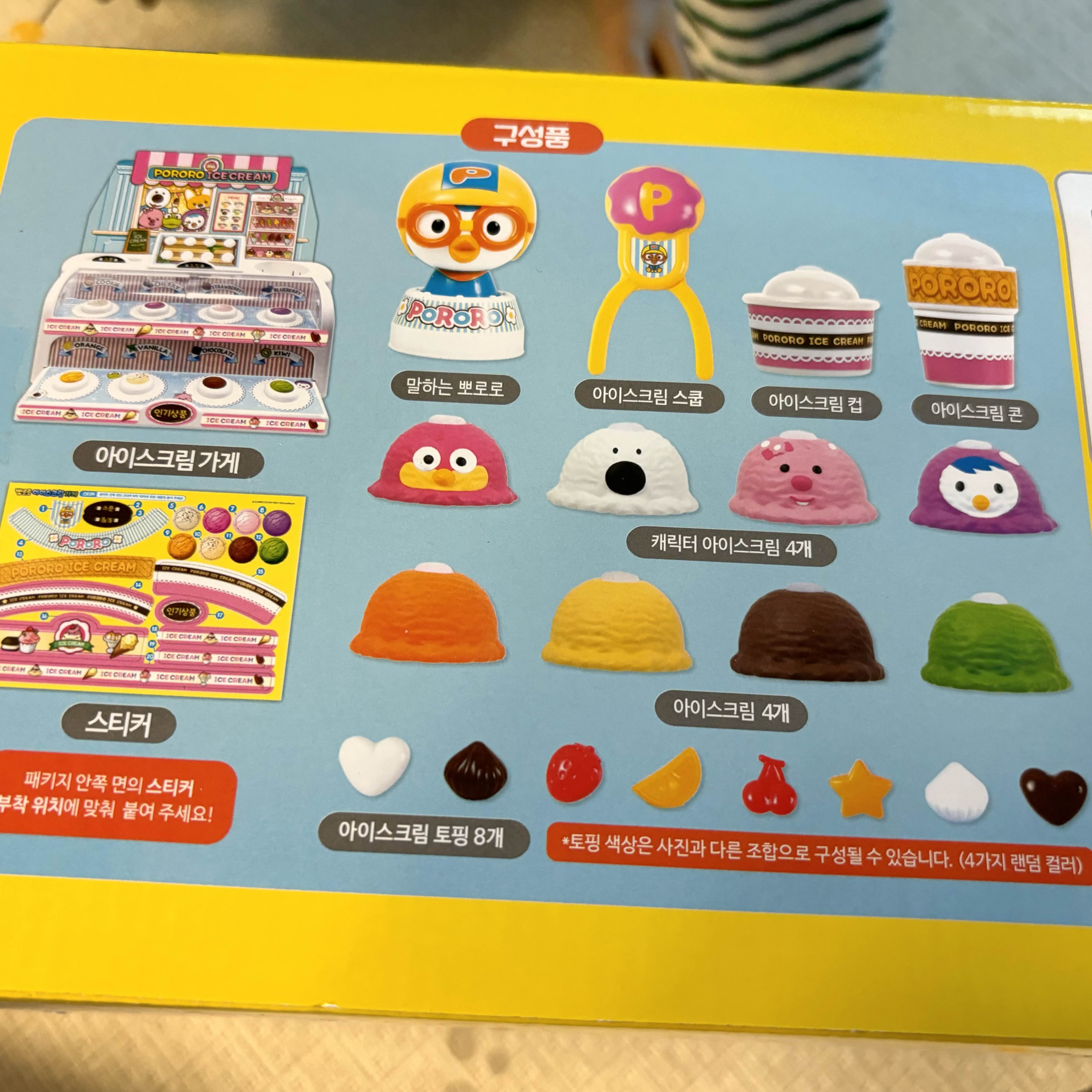 뽀로로 아이스크림 가게 구성품은 아이스크림, 아이스크림 컵 및 콘, 스쿱, 아이스크림 토핑, 스티커 등으로 구성되어 있어요.