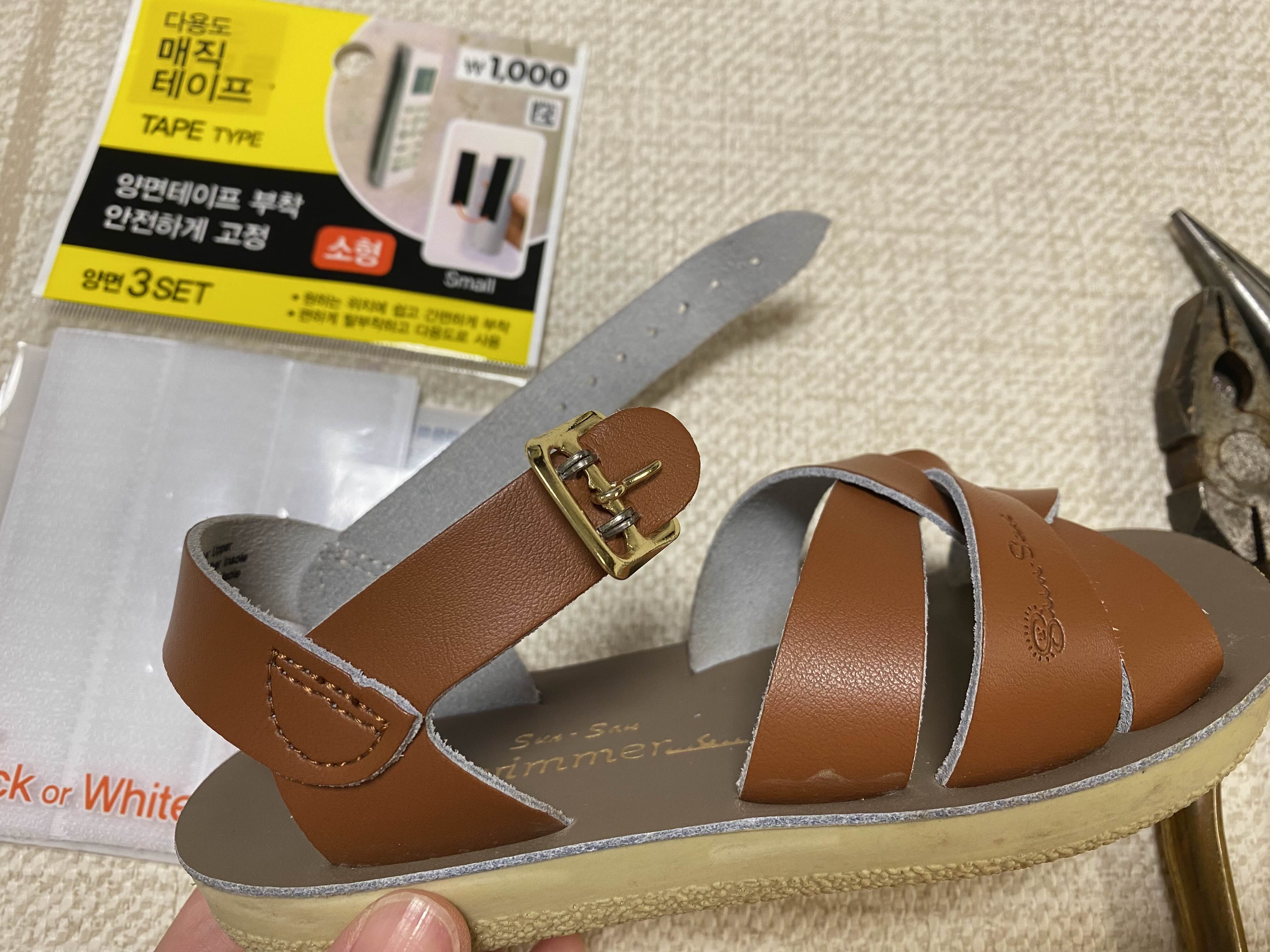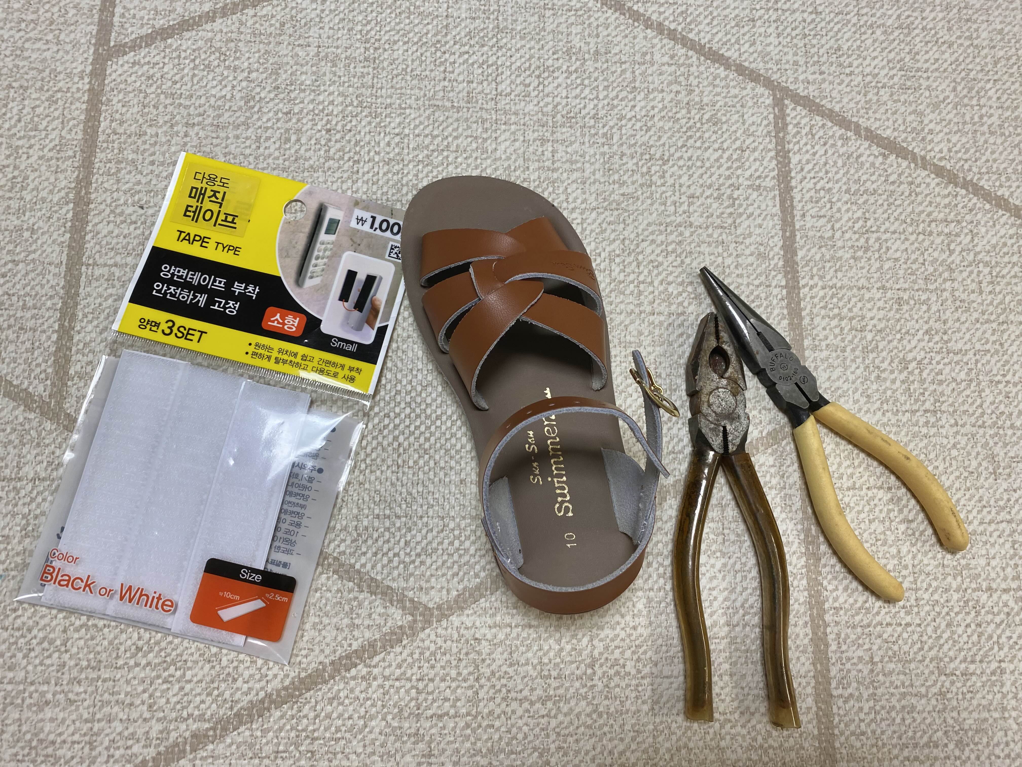 아이 발 사이즈에 맞게 찍찍이를 붙인 후 남은 자리에 버클을 끼워주면 끝!