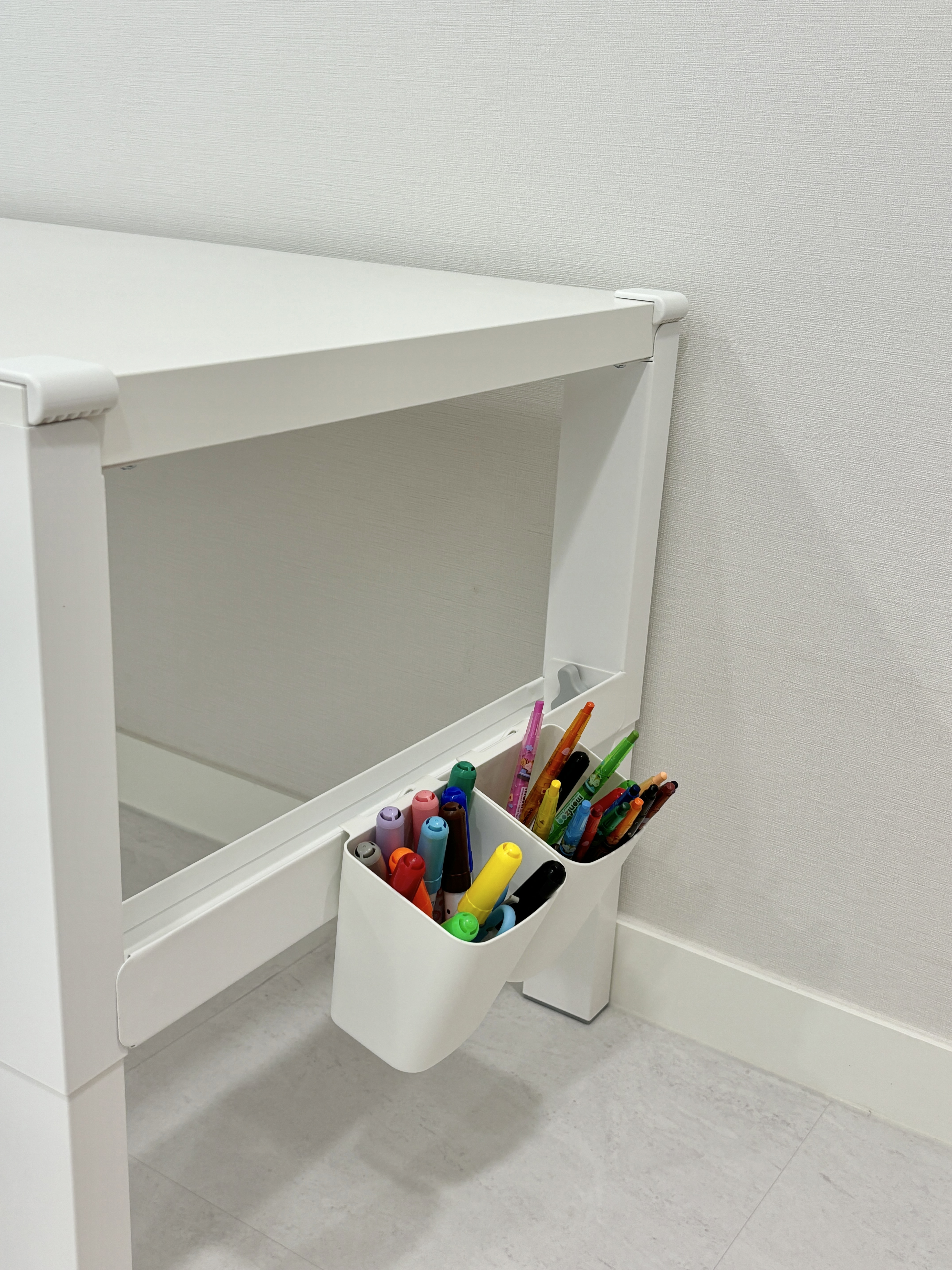 책상 옆에는 이케아 순네르스타(1000원) 용기를 2개 구입하여 색연필 및 마카 보관함으로 사용하고 있어요.