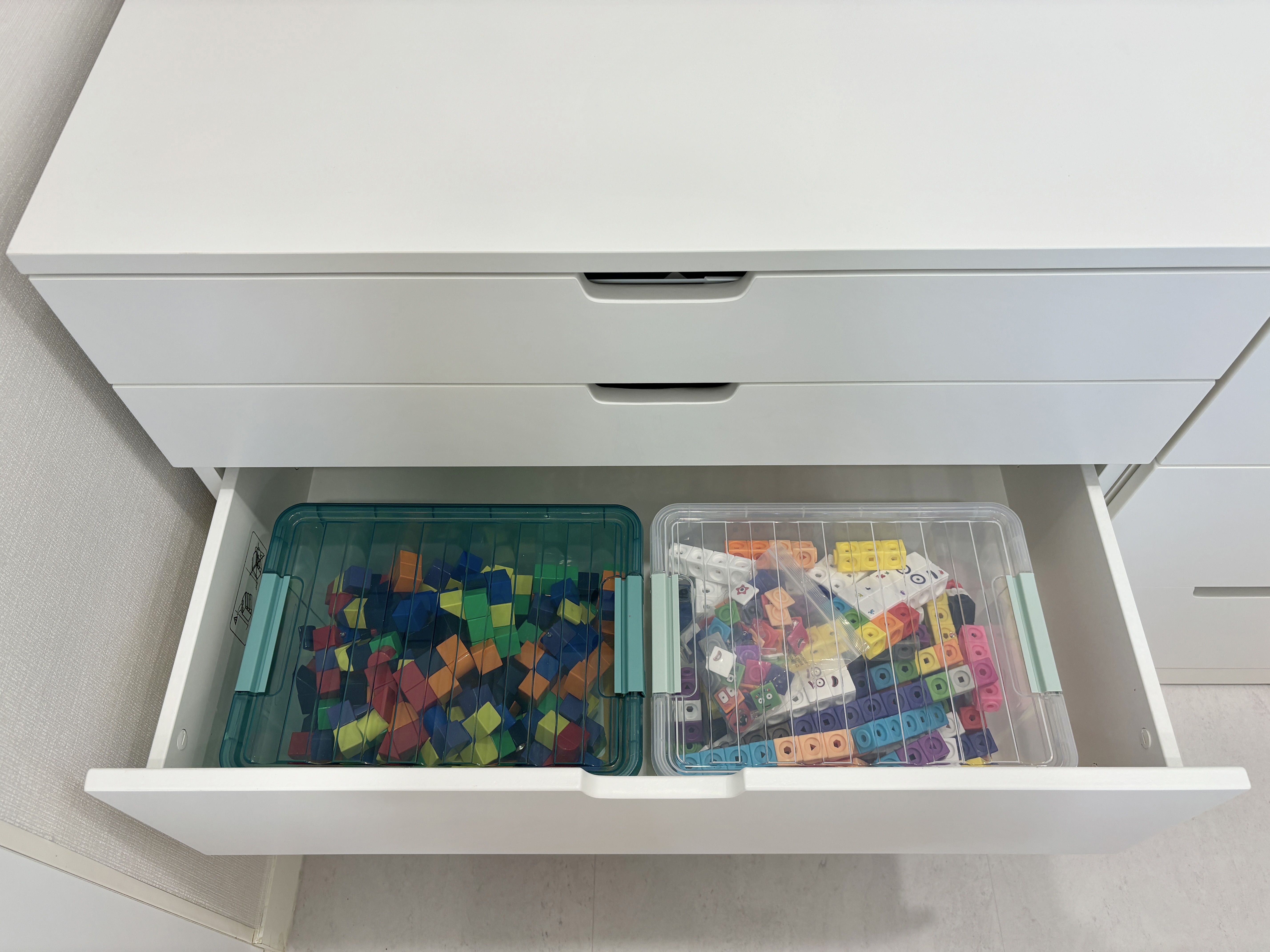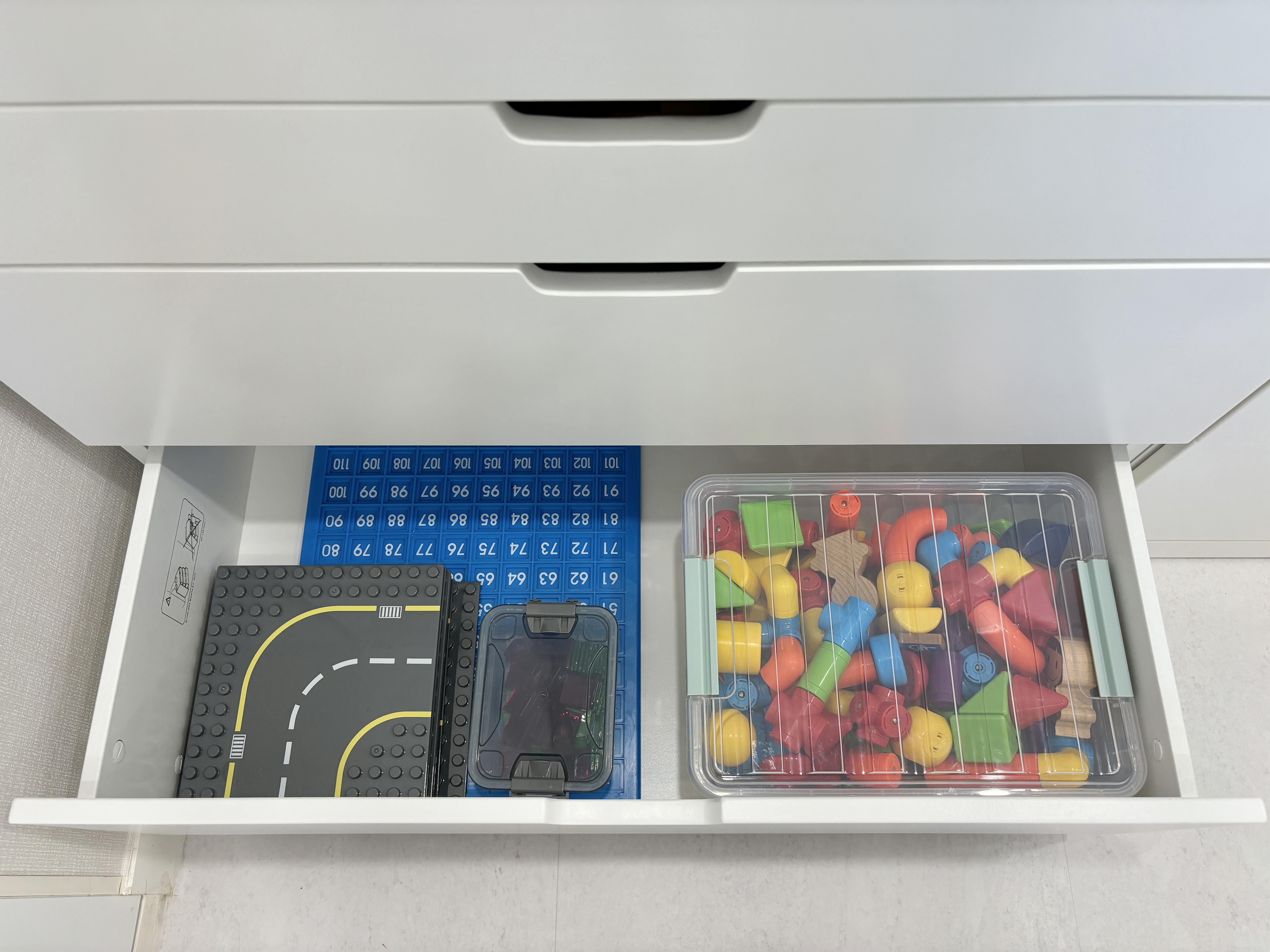 아래 두 칸에는 아이가 자주 가지고 노는 큐블로 자석블럭과 넘버블럭스 매쓰링크, 에드토이 자석블럭과 수120판 교구 등을 정리하여 넣었어요. 투명 플라스틱 정리함은 플레이조이에서 구입했어요.