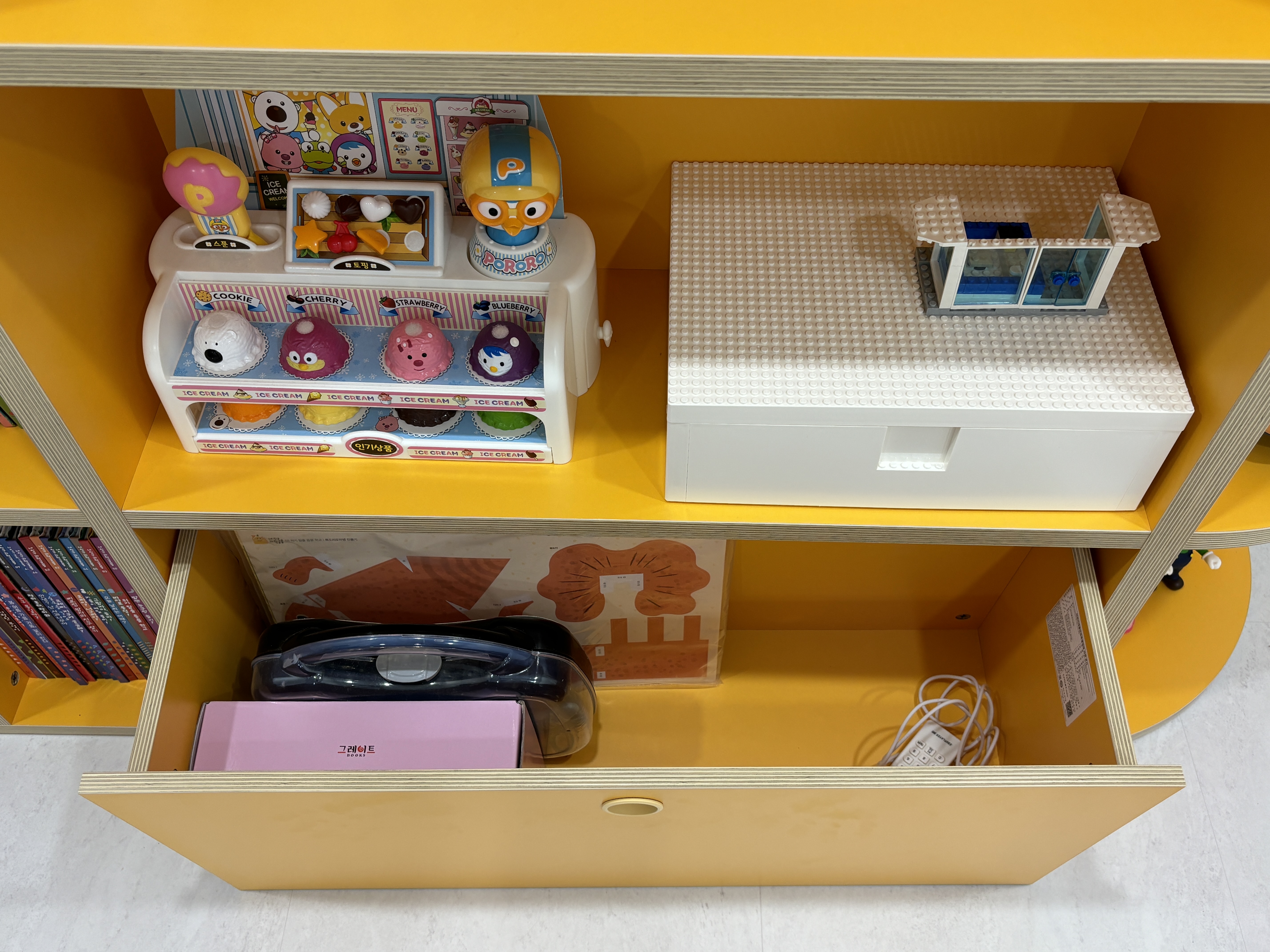 리바트 꼼므 키즈 책장을 모두 설치한 후 책과 장난감을 넣어보았어요.