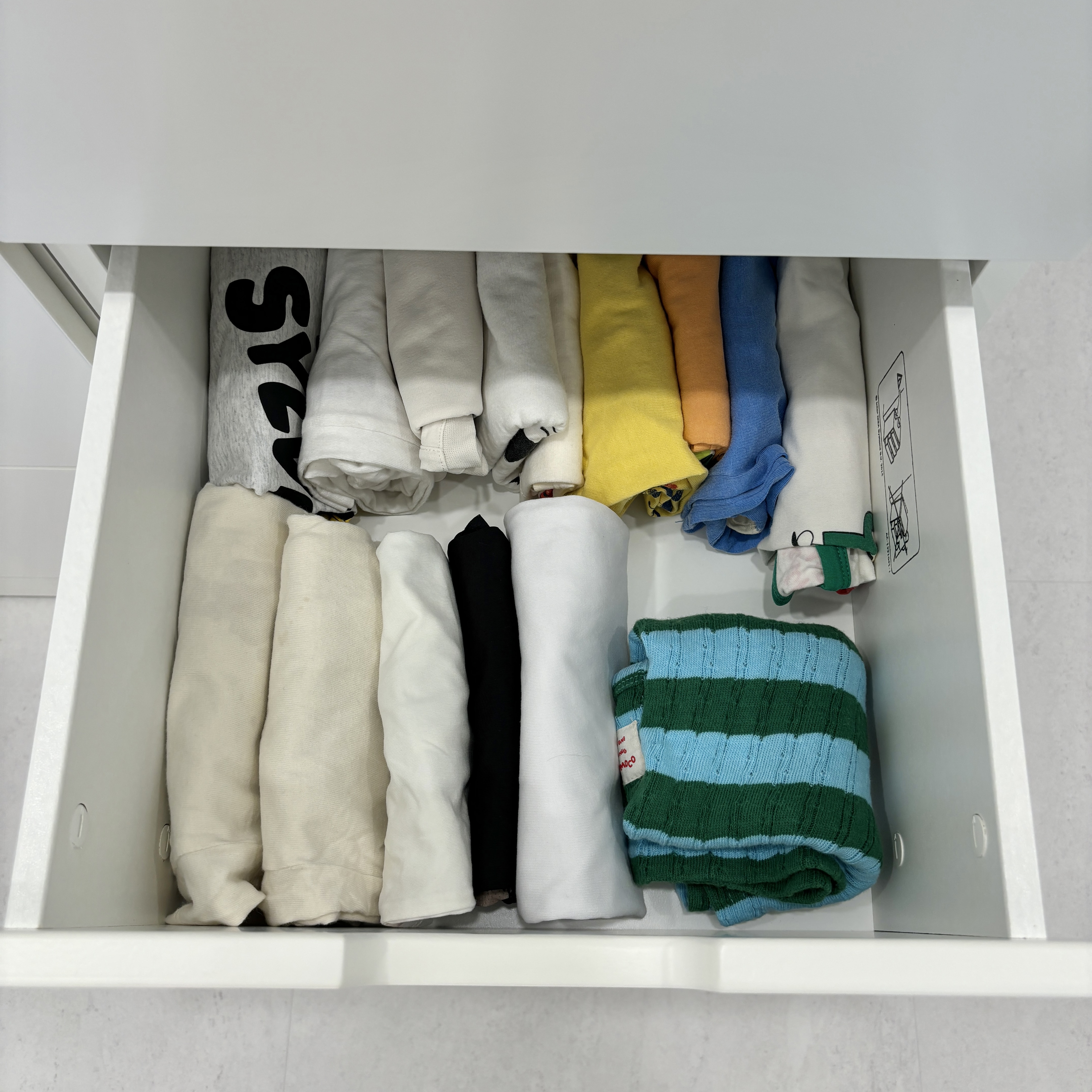 계절마다 맞는 옷으로 해당 서랍장에 넣어놓고, 아이가 직접 꺼내 입을 수 있도록 할 예정이에요 :)