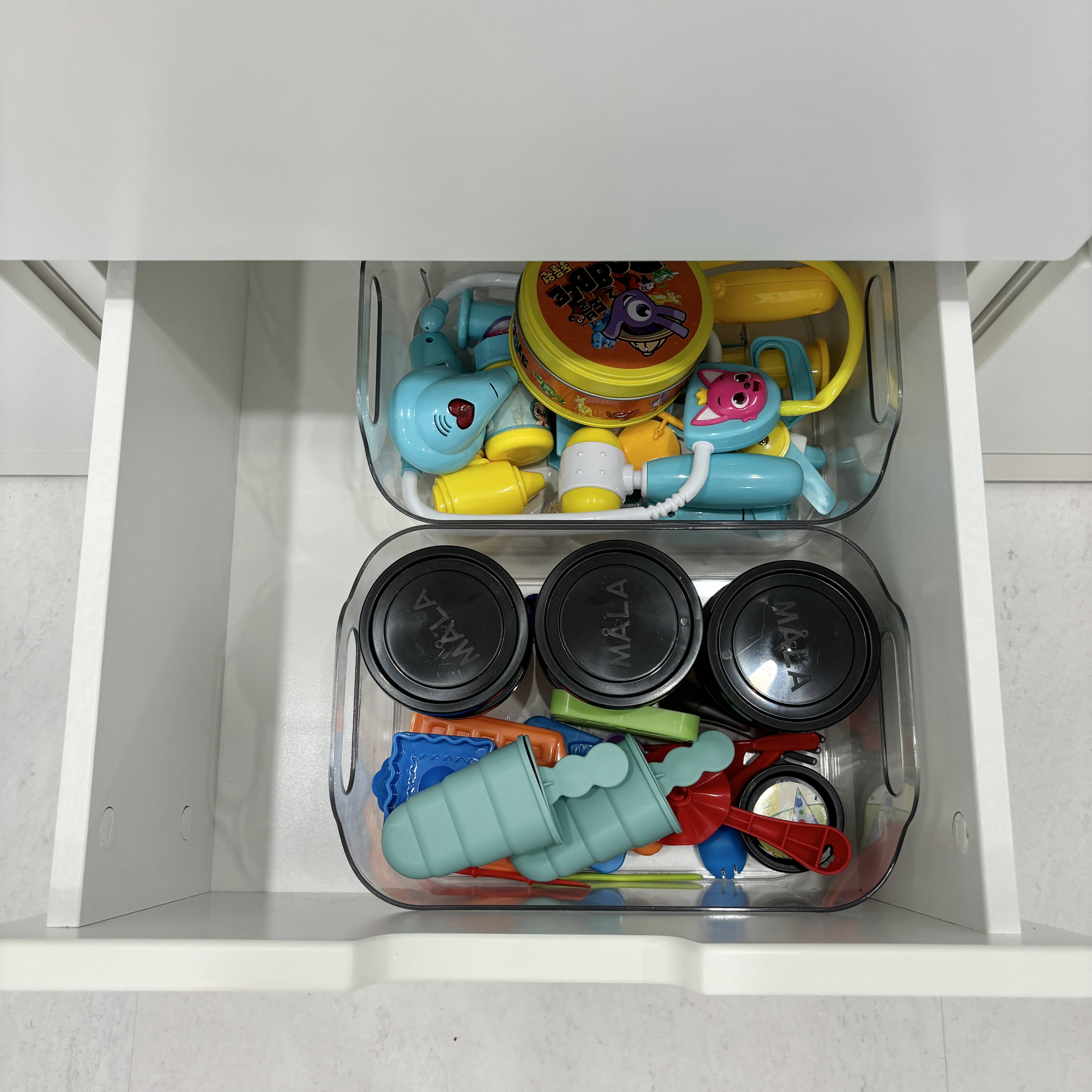서랍장 중 작은 칸에는 보드게임들과 퍼즐류, 클레이, 병원놀이 등 부피와 크기가 작은 장난감들을 넣었어요.