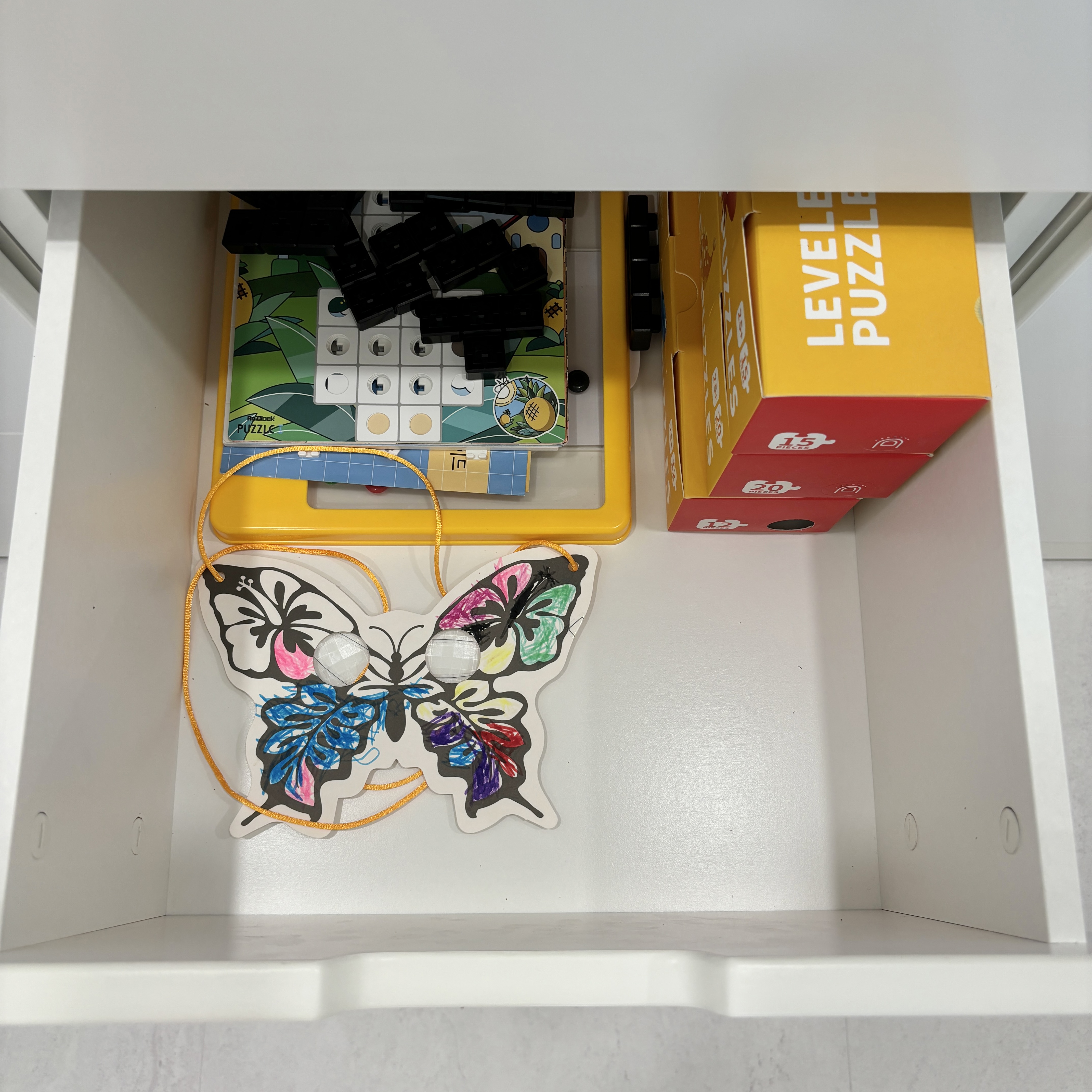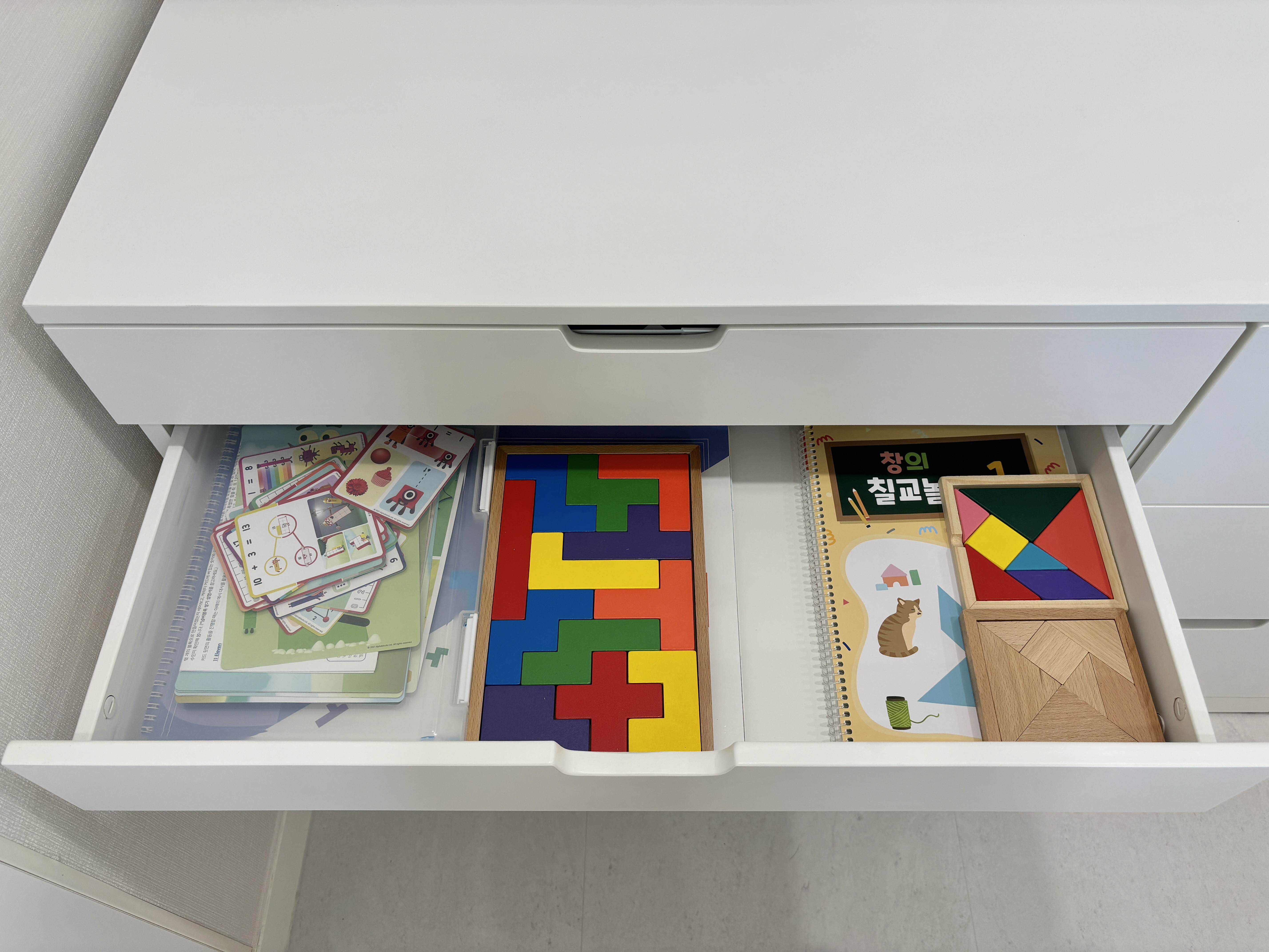 저는 처음부터 7단 서랍장 중 제일 얕은 두 칸은 펜토미노/칠교 교재와 교구, 미술용품(스케치북, 색연필 등)을 수납하려고 생각하고 7칸 서랍장을 구입했어요. 높이가 얕아서 종이나 워크지, 퍼즐 같은 교구들을 수납하기 딱 좋아요!
