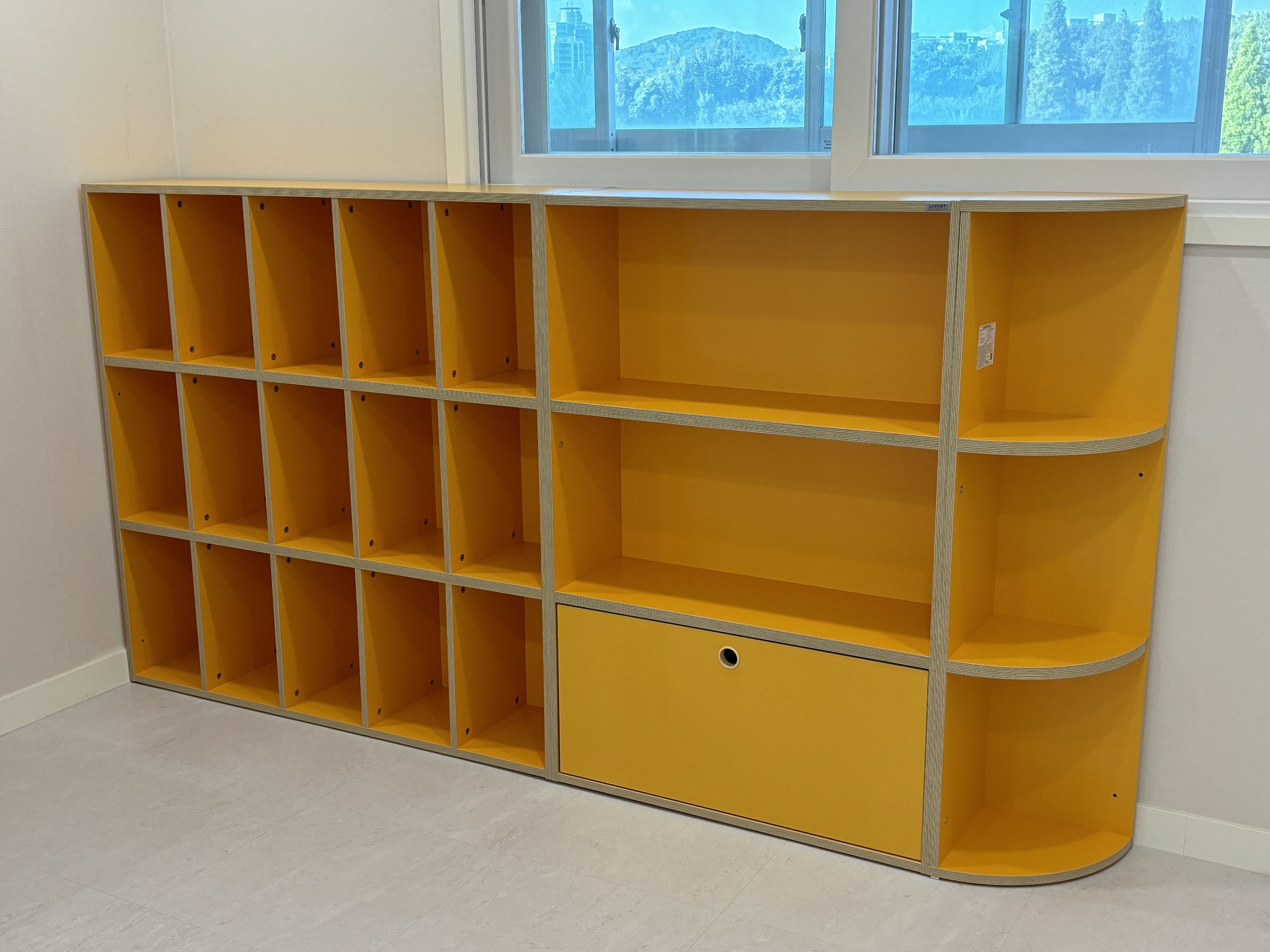 아이가 지나다니면서 모서리에 부딪힐 수 있는데, 반원 책장은 모서리가 둥근 디자인이라 아이가 실수로 책장 모서리에 부딪힐 위험을 방지해주는 역할을 할 수 있겠더라구요 :)