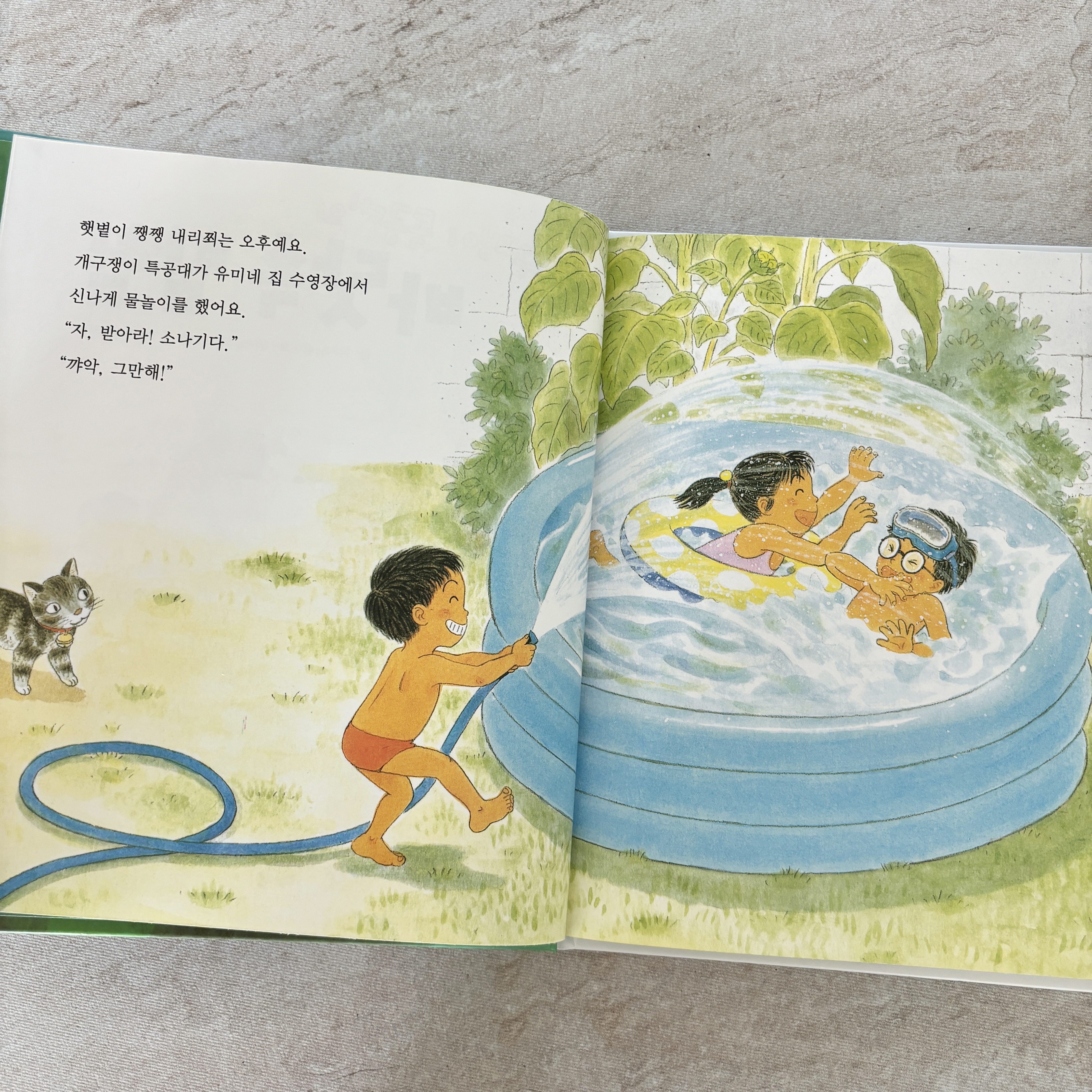 이야기는 세 친구가 수영장에서 물놀이를 하는 장면으로 시작되어요.