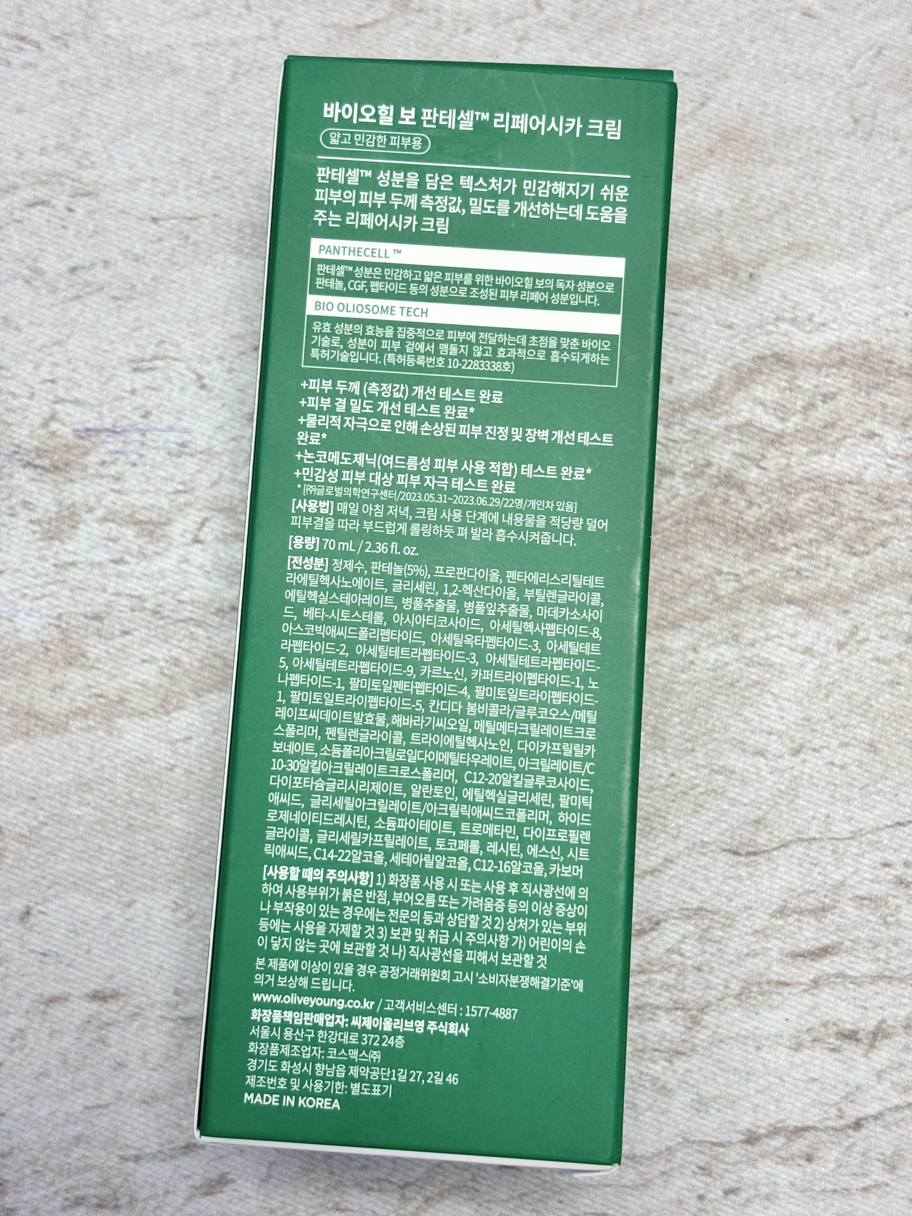 바이오힐보 판테셀 리페어 시카 크림은 판테셀 성분을 담은 크림으로 민감해지기 쉬운 피부의 두께, 밀도 등을 개선하는데 도움을 준다고 해요.