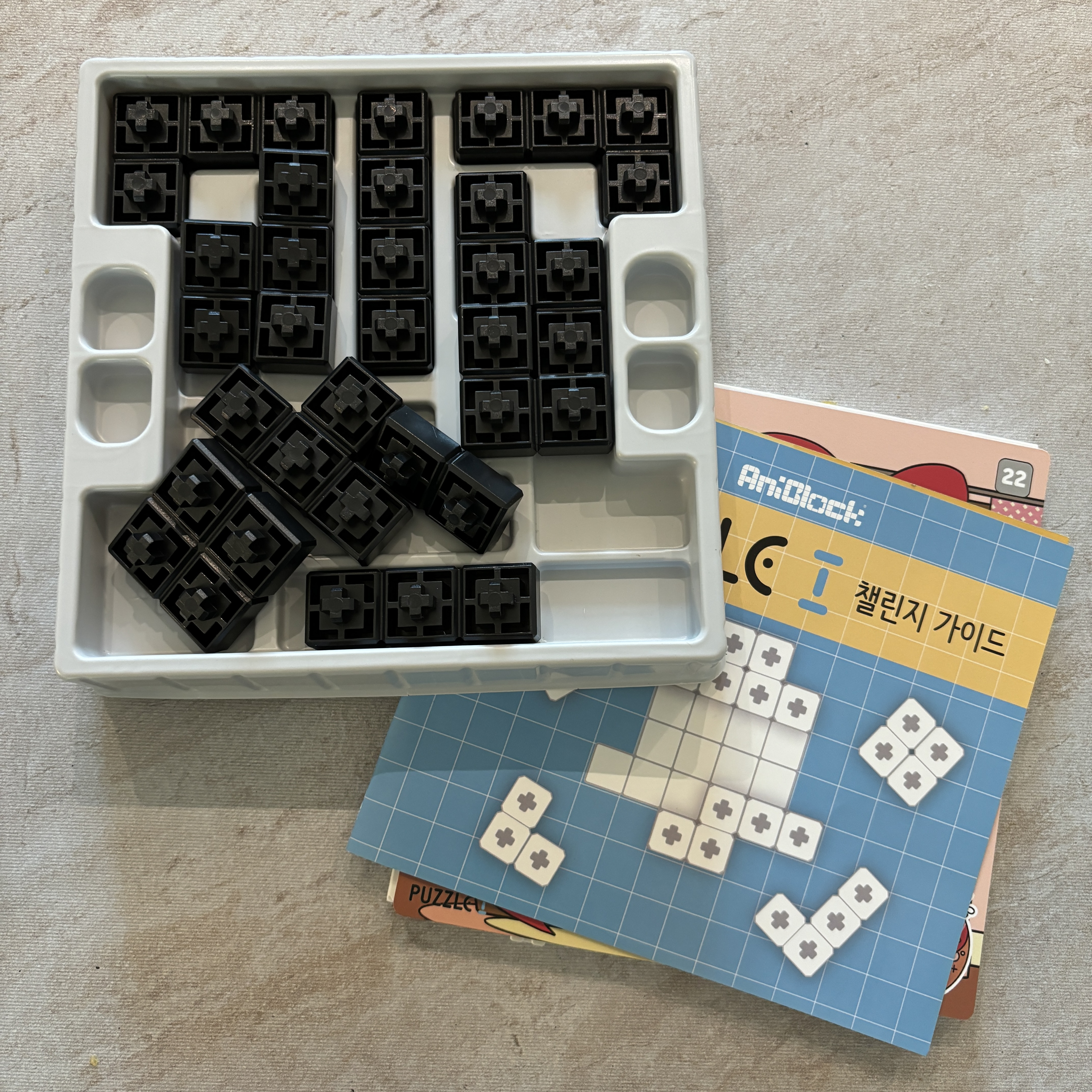 폴리오미노 블록 11개, 블록판, 퍼즐도안 8개, 그리고 챌린지 가이드로 구성되어 있어요.