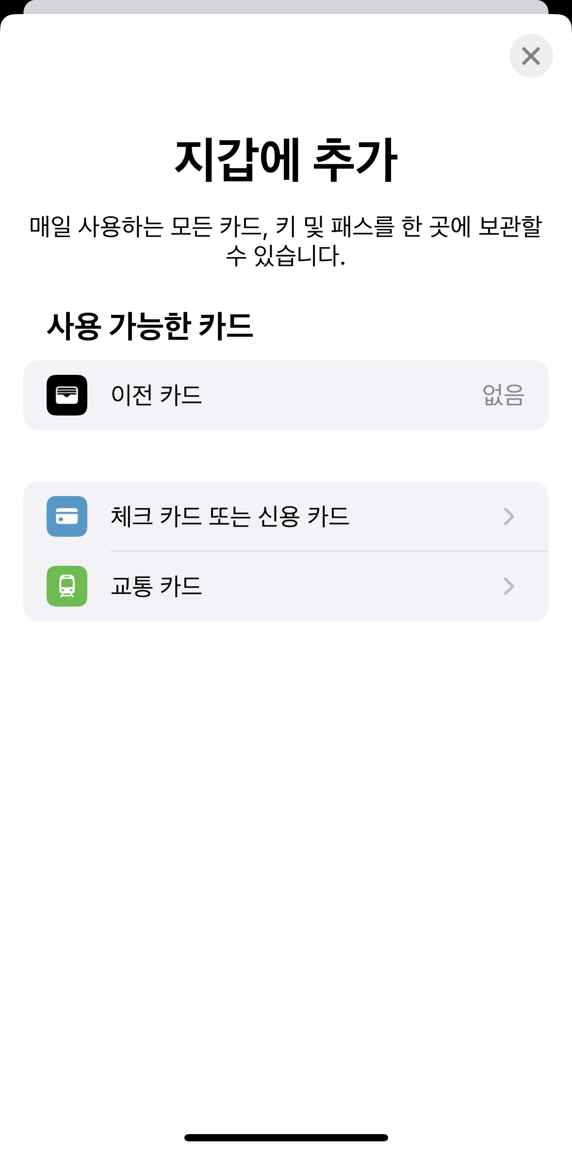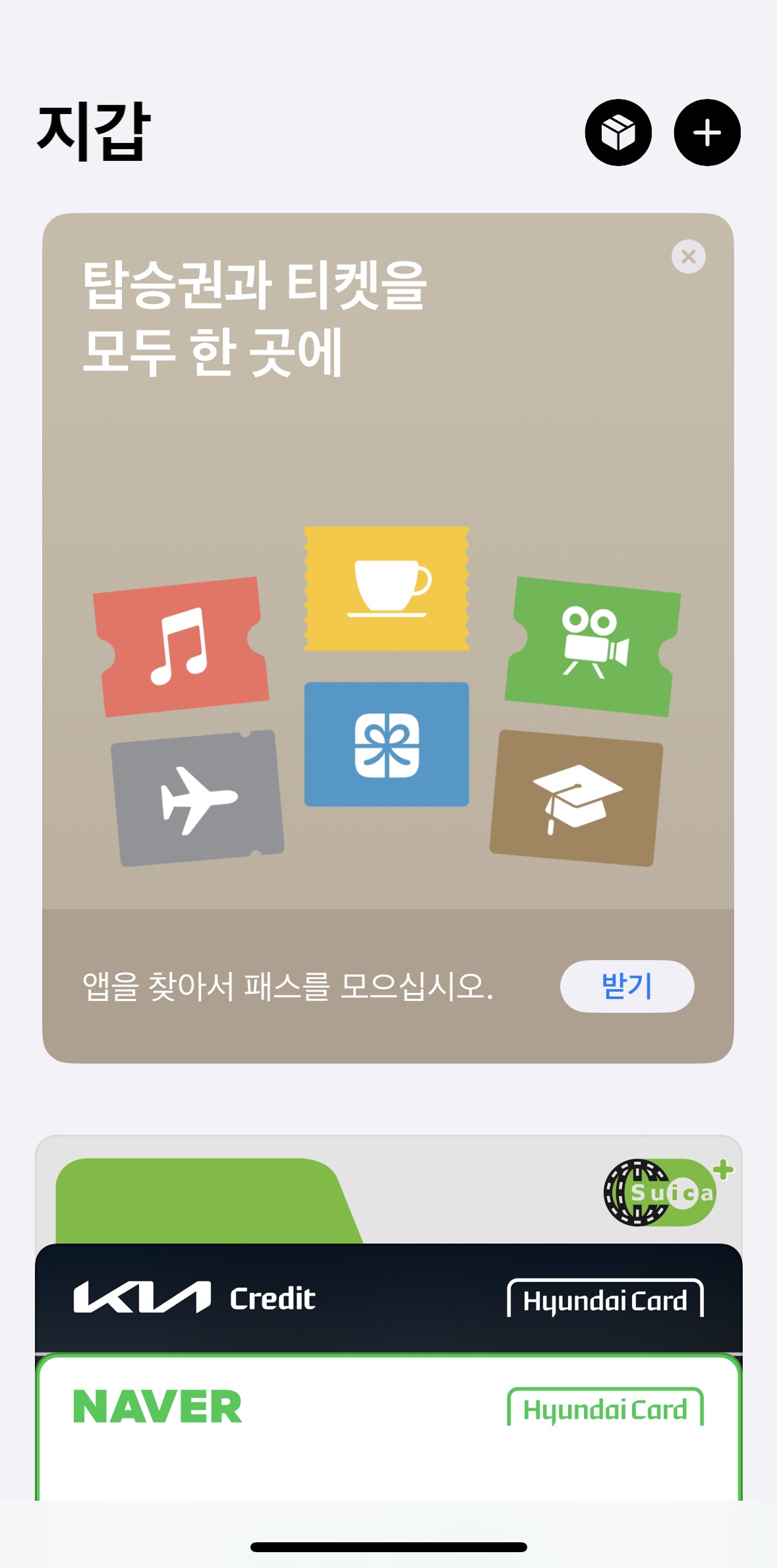 지갑 어플을 실행한 후 우측 상단에 + 버튼을 눌러주면 [지갑에 추가] 라는 화면이 뜹니다.