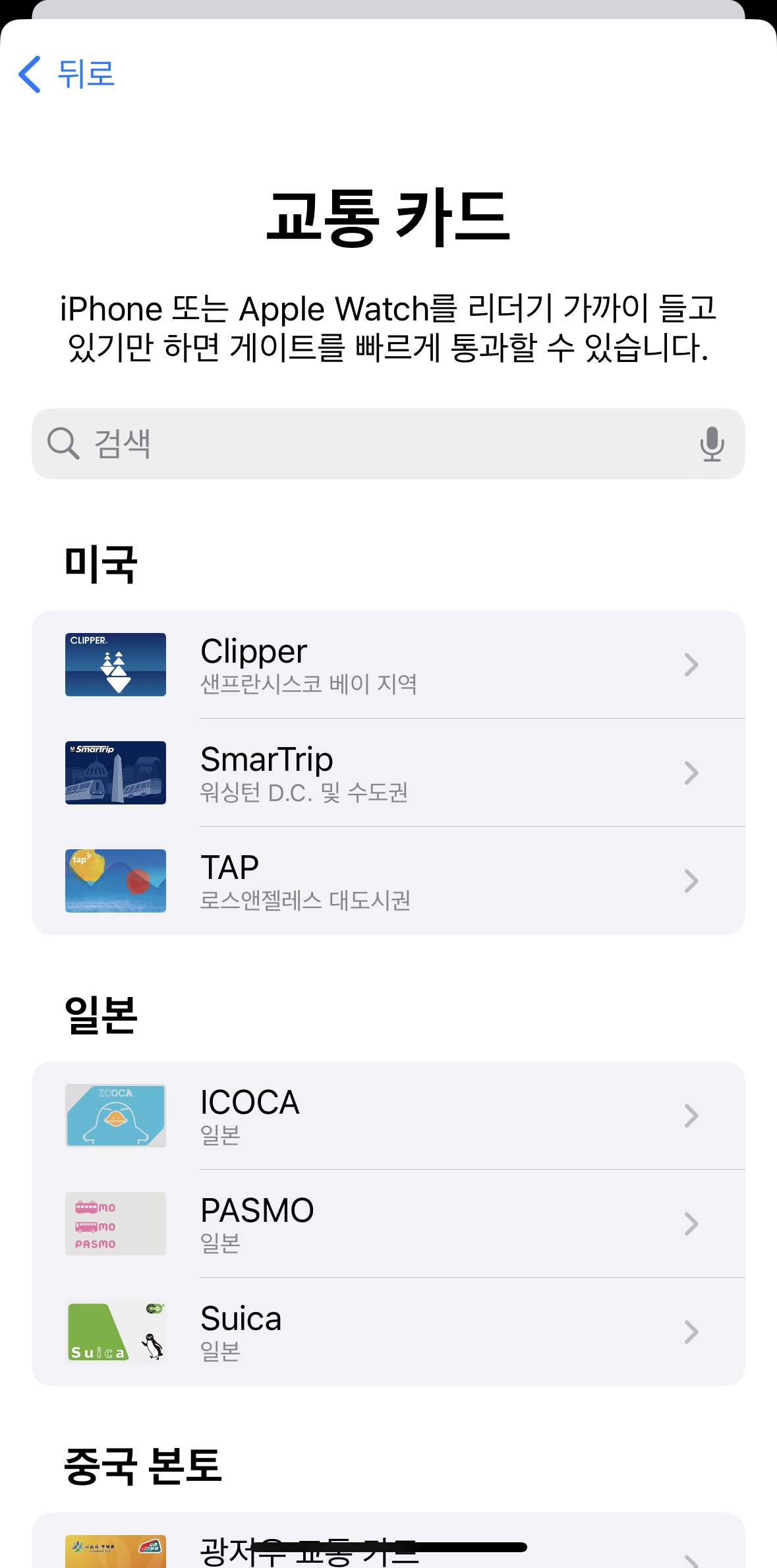 그러면 미국, 일본, 중국 등 국가별로 애플페이 등록 가능한 카드가 나옵니다.