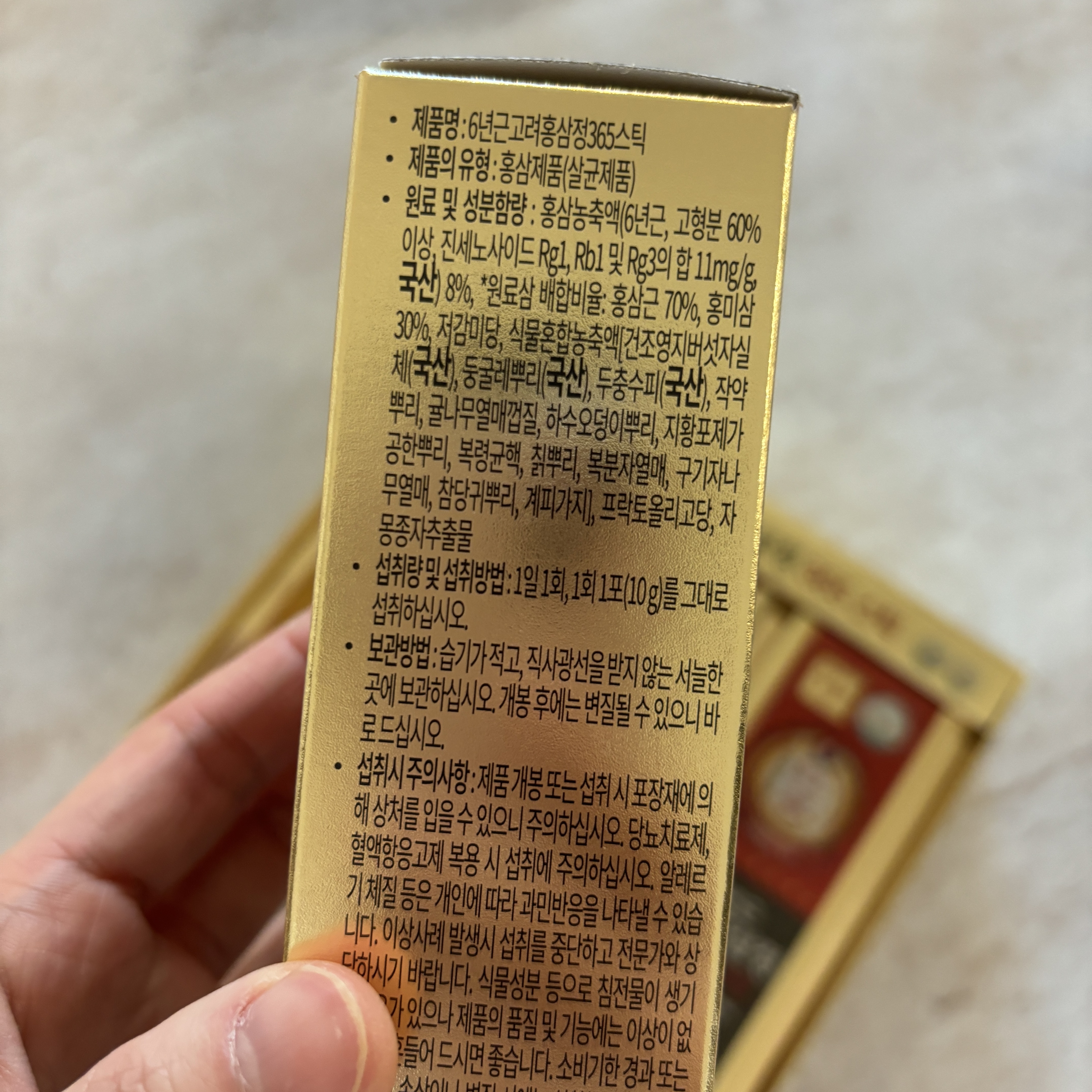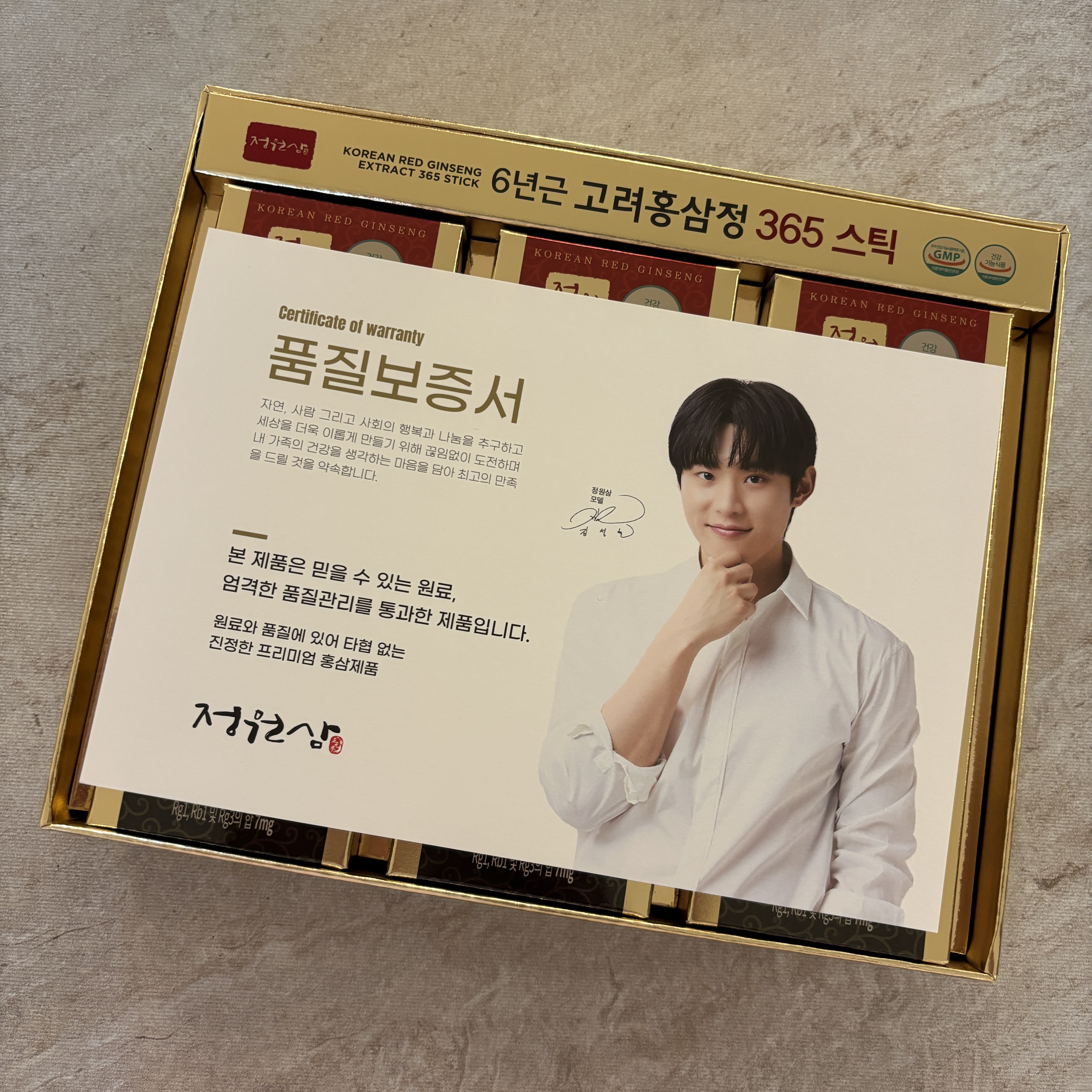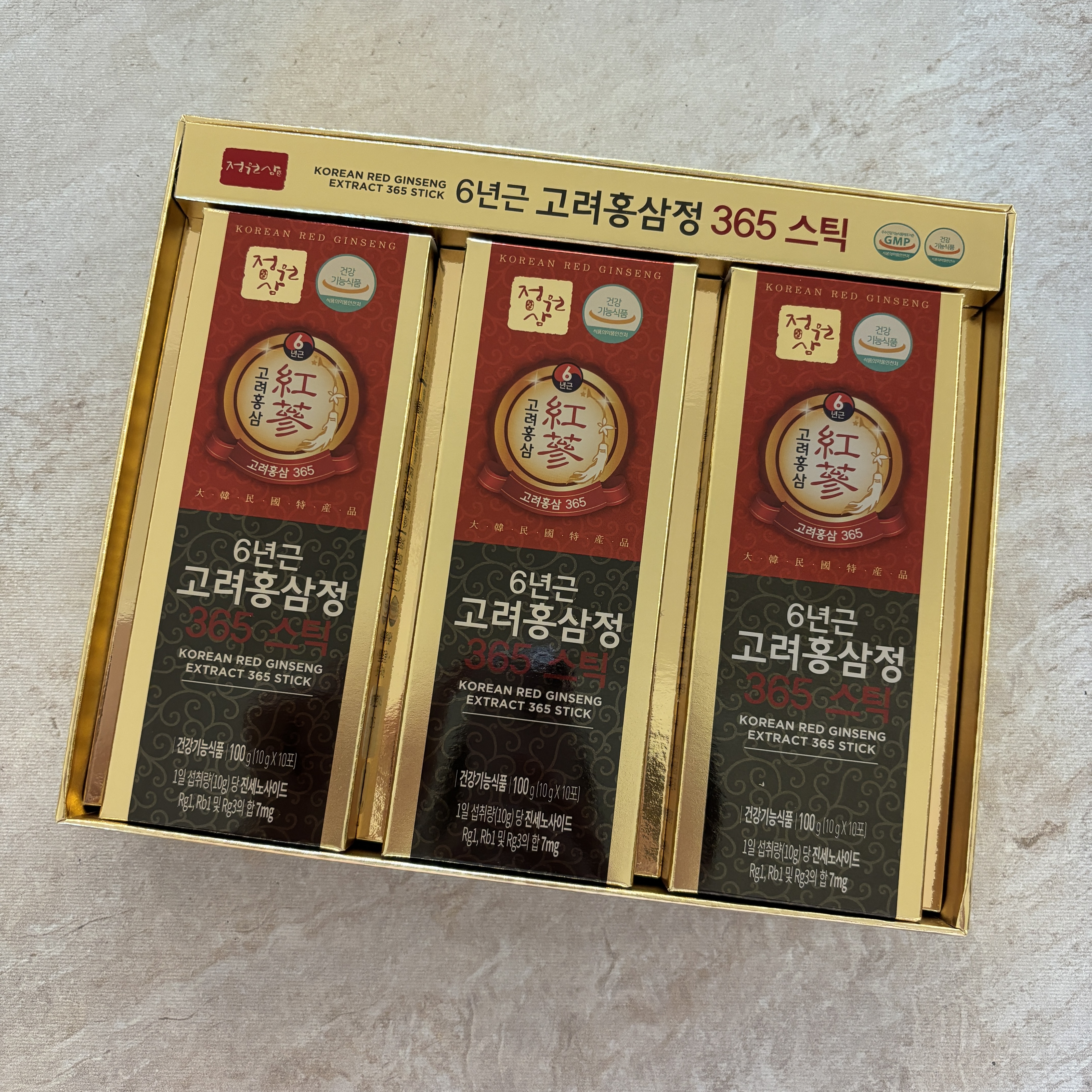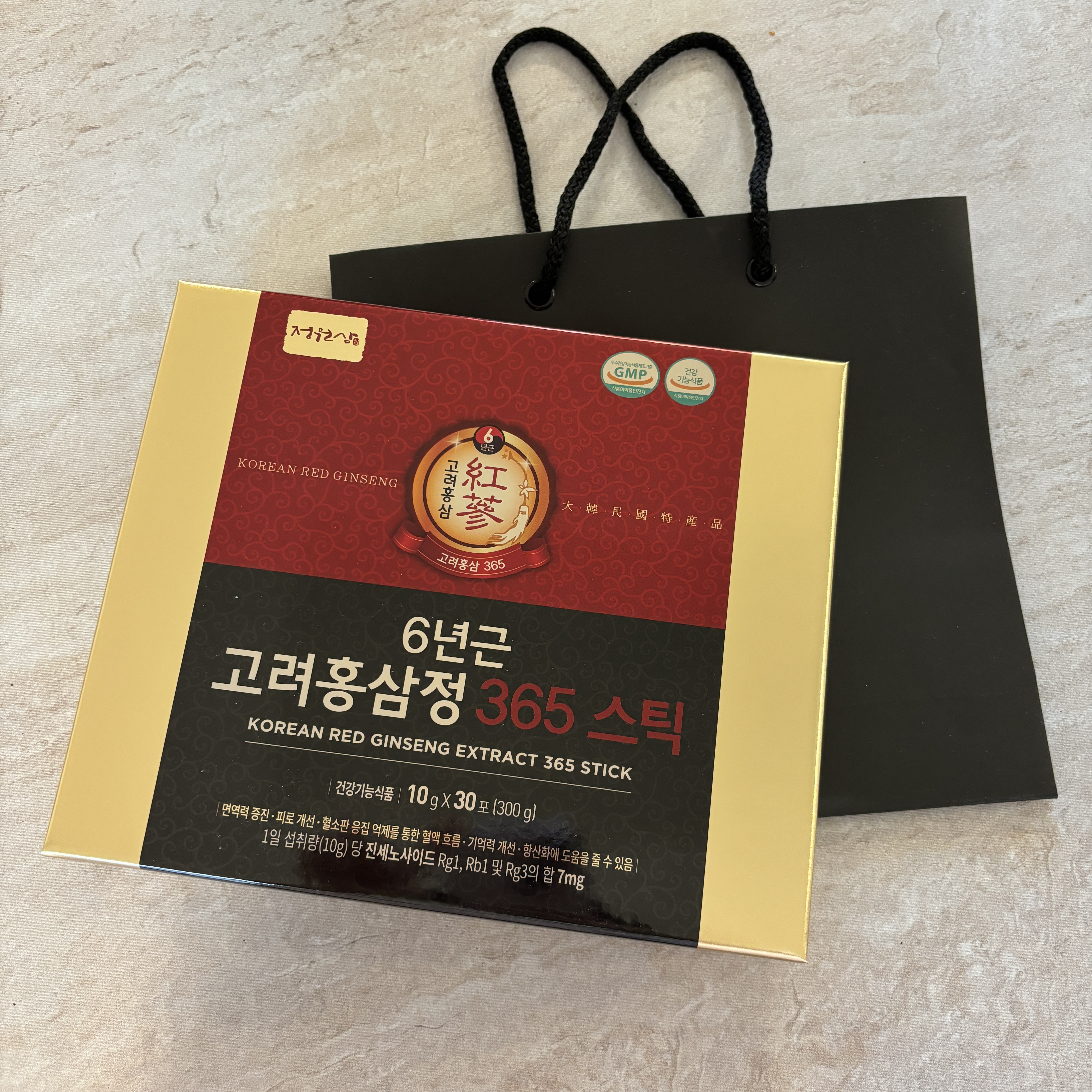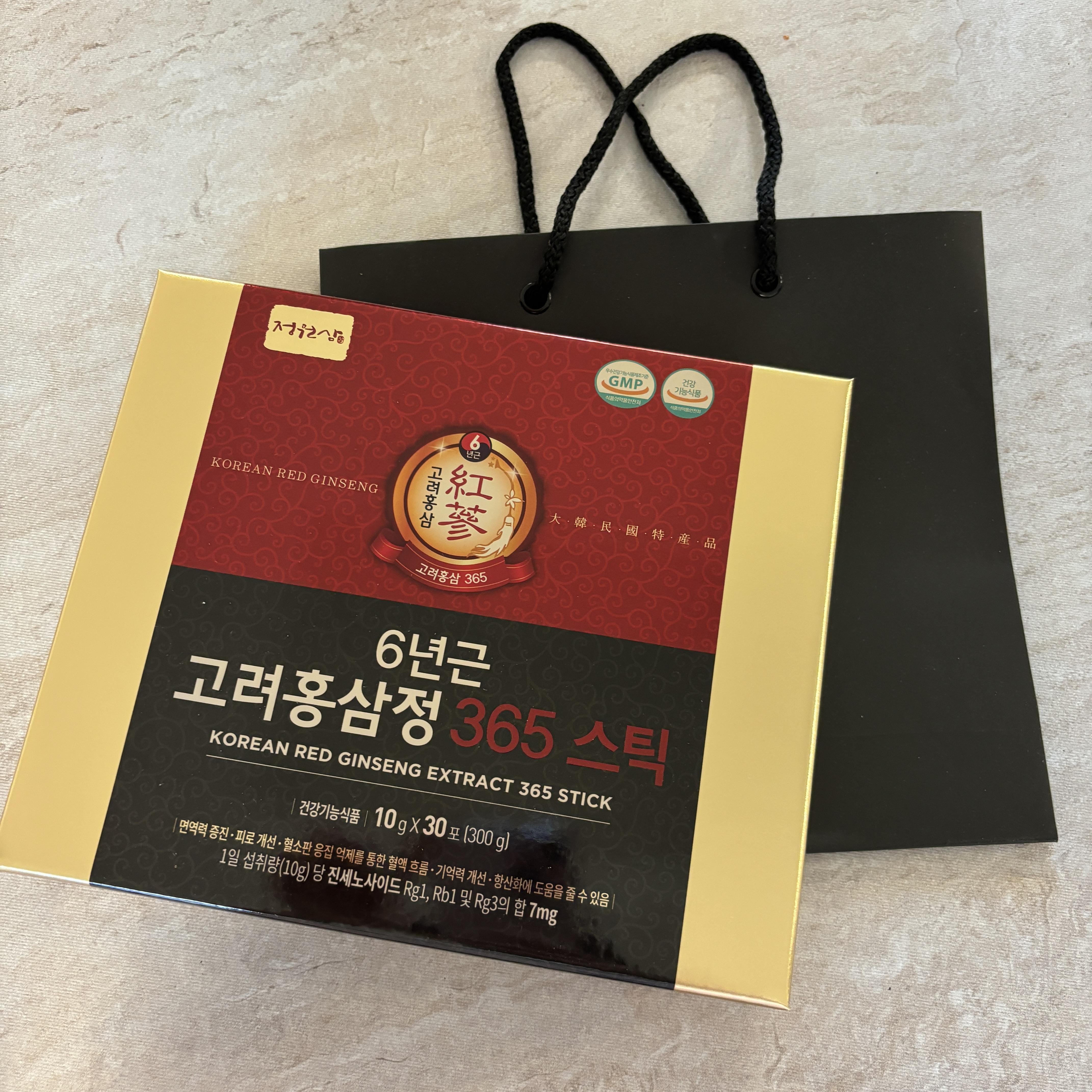 이번에 받은 정원삼 6년근 고려홍삼정 365스틱 매일 한포씩 먹어보려고 합니다 :)