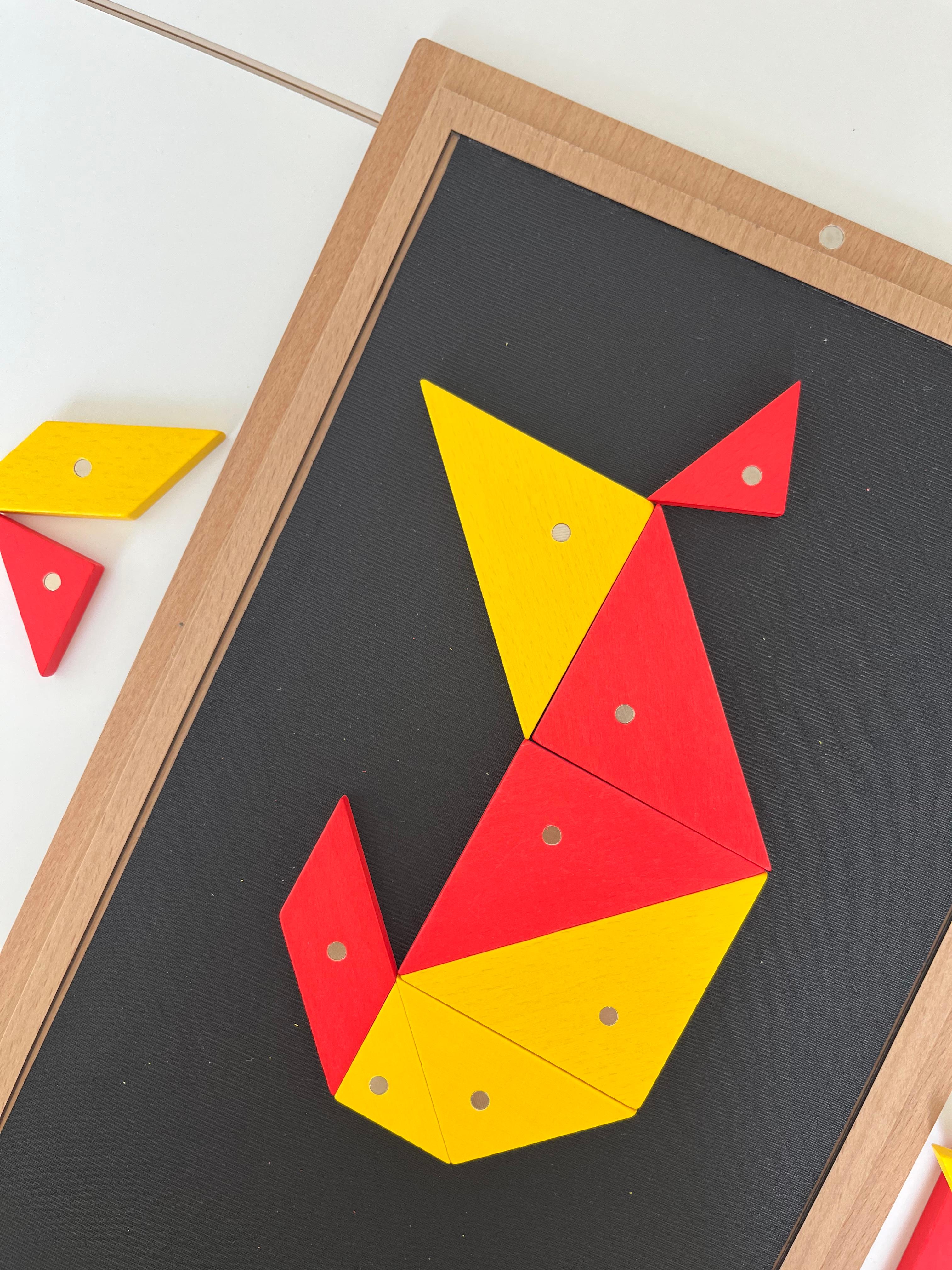 칠교(탱그램)의 경우 일곱 개의 기하 도형 조각으로 다양한 형태를 만드는 퍼즐 교구인데요!