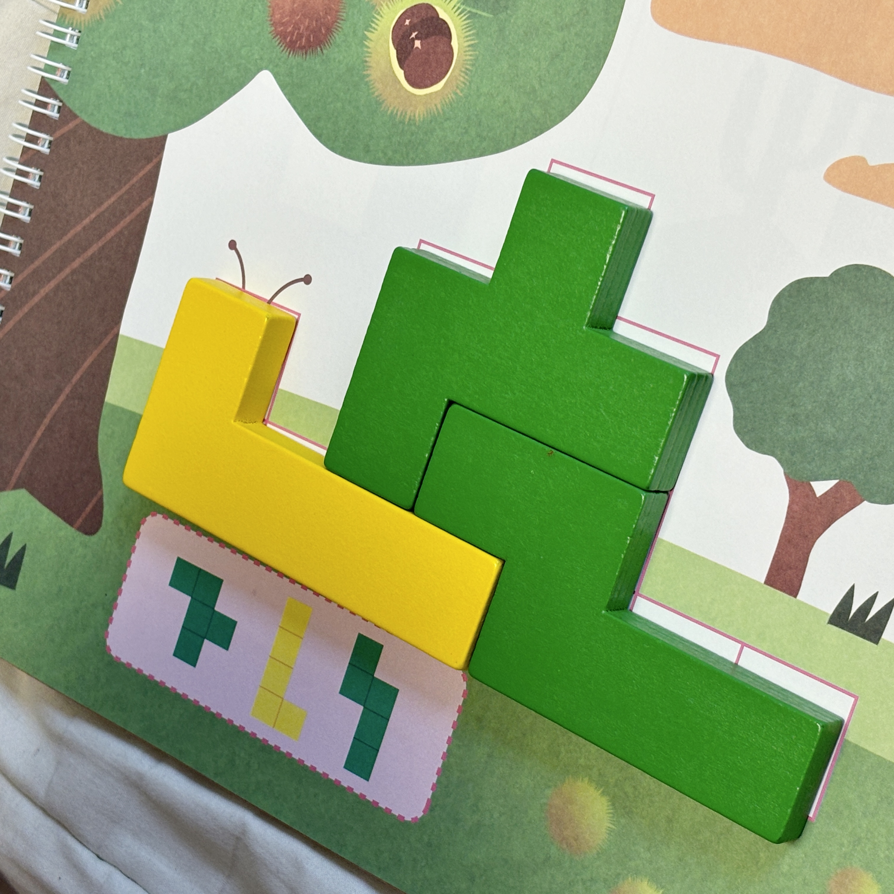 펜토미노의 경우 생각보다는 쉽지 않은 교구인데요. 단순히 블록을 맞추면 되는 교구 아니야? 라고 생각하실 수 있는데, 제가 아이와 집에서 함께 해보니 복잡한 도형을 조합하고 배치하는 것이 꽤 고난이도 작업이더라구요. 특히나 너무 어려운 과제면 아이가 금방 흥미를 잃게 되기 때문에, 적절히 난이도 조절을 통해 아이가 도전할 수 있도록 제대로 가이드를 해줘야 하는 교구라는 생각이 들었어요.