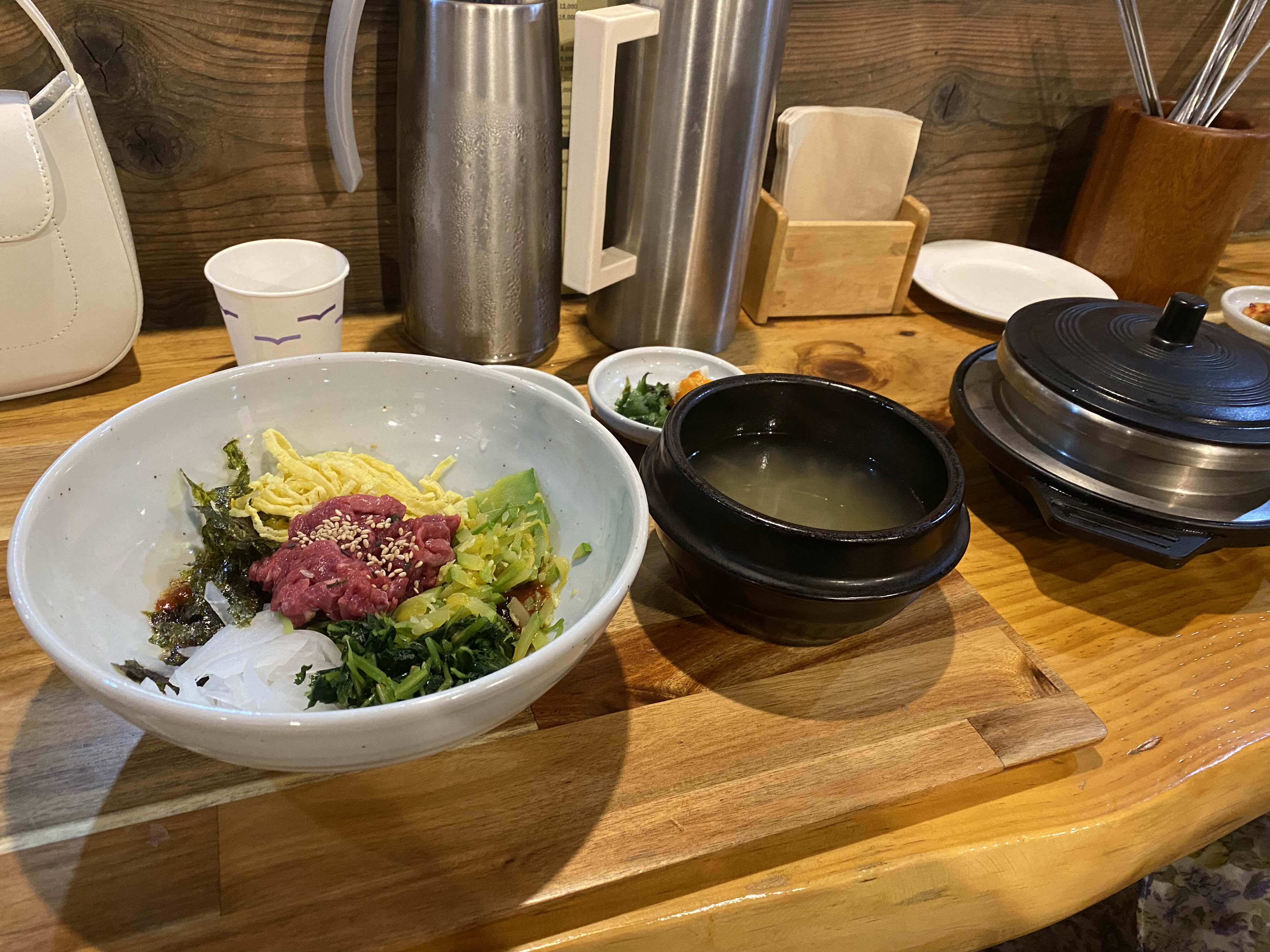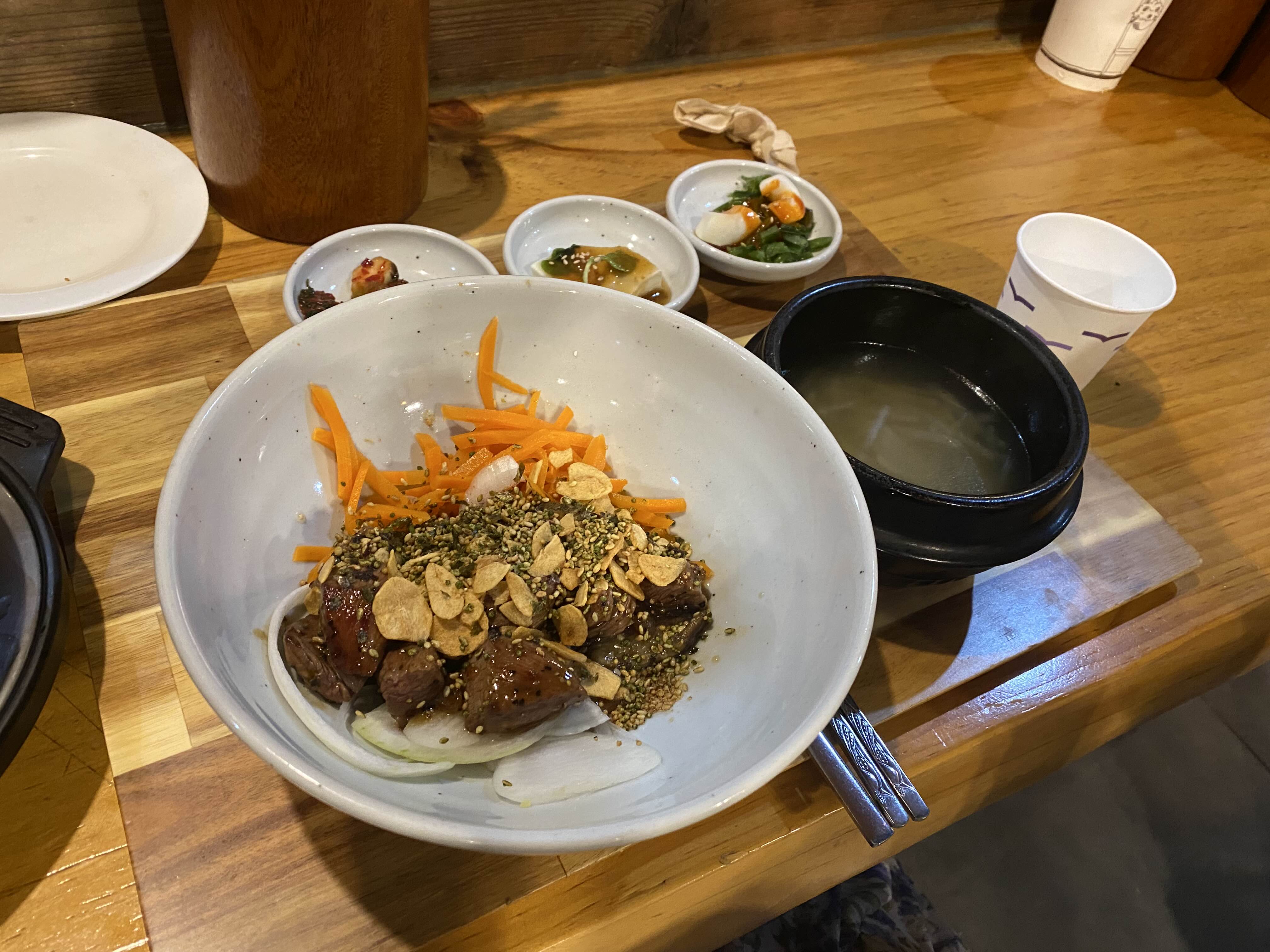 육회비빔밥과 스테크이 솥밥을 시켰는데 두가지 모두 솥밥 형태로 나와 후식으로 누룽지를 먹을 수 있더라구요.