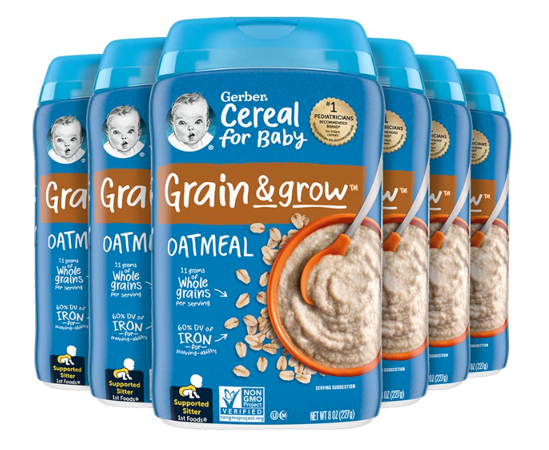 우리나라는 쌀을 베이스로 하는 이유식을 아이에게 먹이는데, 이 때 철분 섭취를 위해 소고기가 들어간 이유식을 만든다. 하지만 소고기가 들어간 이유식도 아기들이 하루에 섭취해야하는 철분 섭취 권장량을 충족시키지 못한다고 한다. 이 때 오트밀의 도움을 받아 부족한 철분 일일 섭취 권장량을 채워줄 수 있다. 거버오트밀은 하루 권장량인 15g을 섭취했을 때 철분 일일 권장량의 60% 충족이 가능하다고 한다. 또한 칼슘, 아연, 비타민 C, 비타민 E, 비타민 B1(티아민), 비타민 B2(리보플라빈), 비타민 B3(나이아신), 비타민 B6, 폴산, 콜린 등 아이 성장 발달에 좋은 성분들이 많이 함유되어 있다. 거버오트밀은 파란색 통인 오리지널, 초록색 통인 유기농 두 가지가 기본이고, 이외에 딸기, 바나나, 당근 등 야채 및 과일이 함유되어 있는 버전도 있다. 나는 우리 아이가 6개월 때 오리지널 한 통을 먼저 주문해서 먹여보았고, 거부 없이 잘 먹는 걸 확인한 후 유기농으로 여섯 통을 주문하여 본격적으로 먹이기 시작했다. 6개월 아가였기에 1단계(Supported sitter)로 주문했고, 그 후 개월수가 많아졌을 때도 1단계로 먹였다. 거버오트밀 유기농 1단계의 경우 15g 섭취 시 60칼로리이고, 칼슘은 65mg이다.