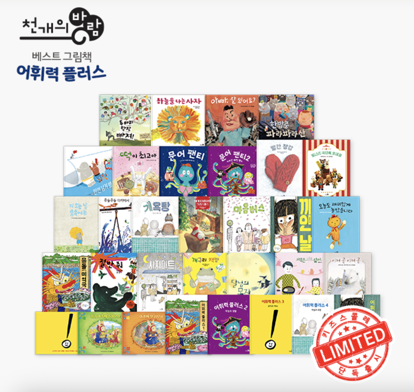 그동안 도레미곰 전집을 다회 읽인 이후 여러 창작 소전집 + 바바파파 어드벤처를 보다가 제대로 된 창작 전집을 들여주고 싶은 마음에, 이번 어린이날에 <키즈스콜레 천개의바람 베스트 그림책 어휘력 플러스>를 구입했어요.