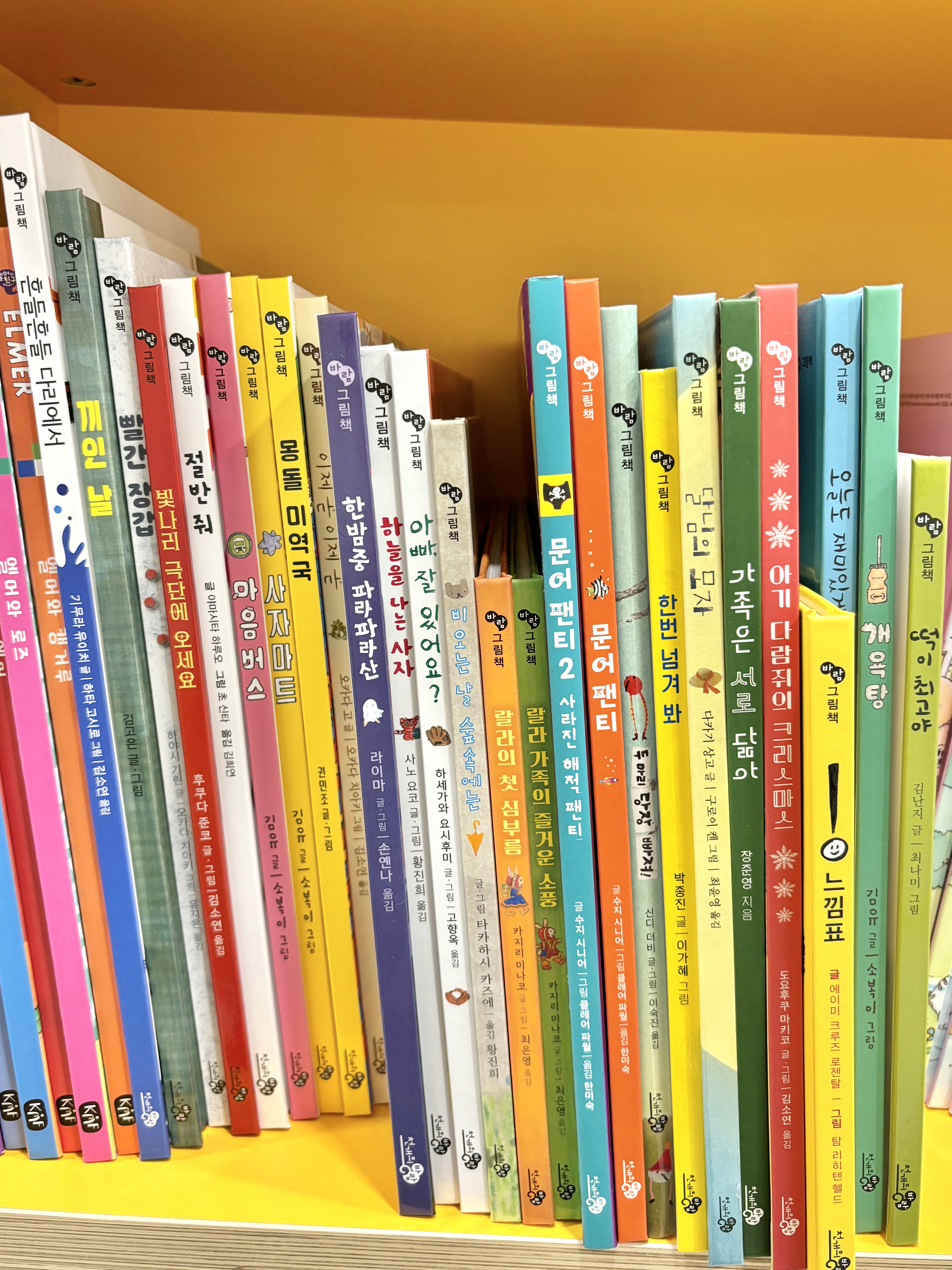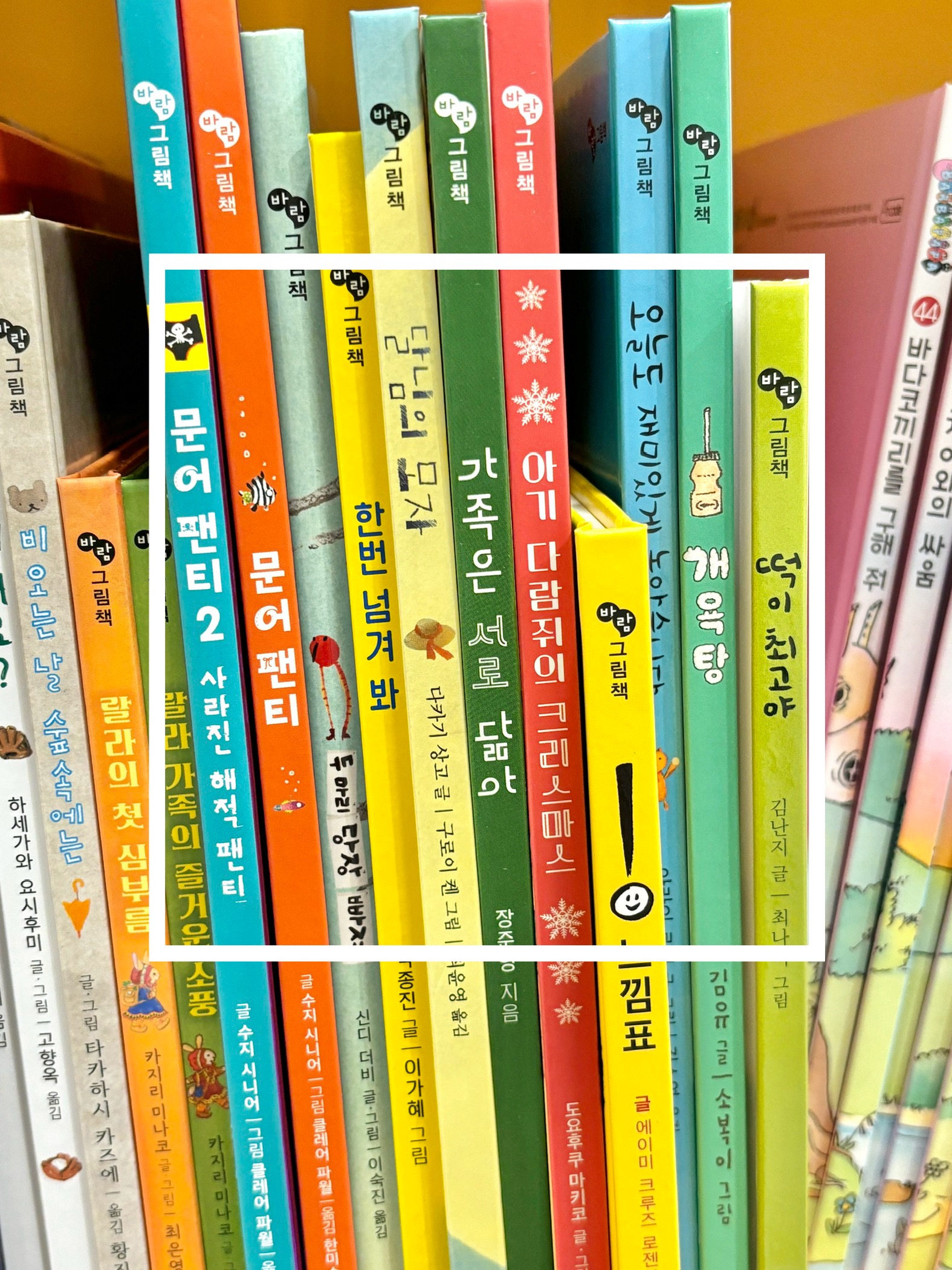 오른쪽 사진 흰색 박스로 표시해둔 책이 비교적 글밥이 적고 가볍게 읽어주기 좋은 책들이에요!