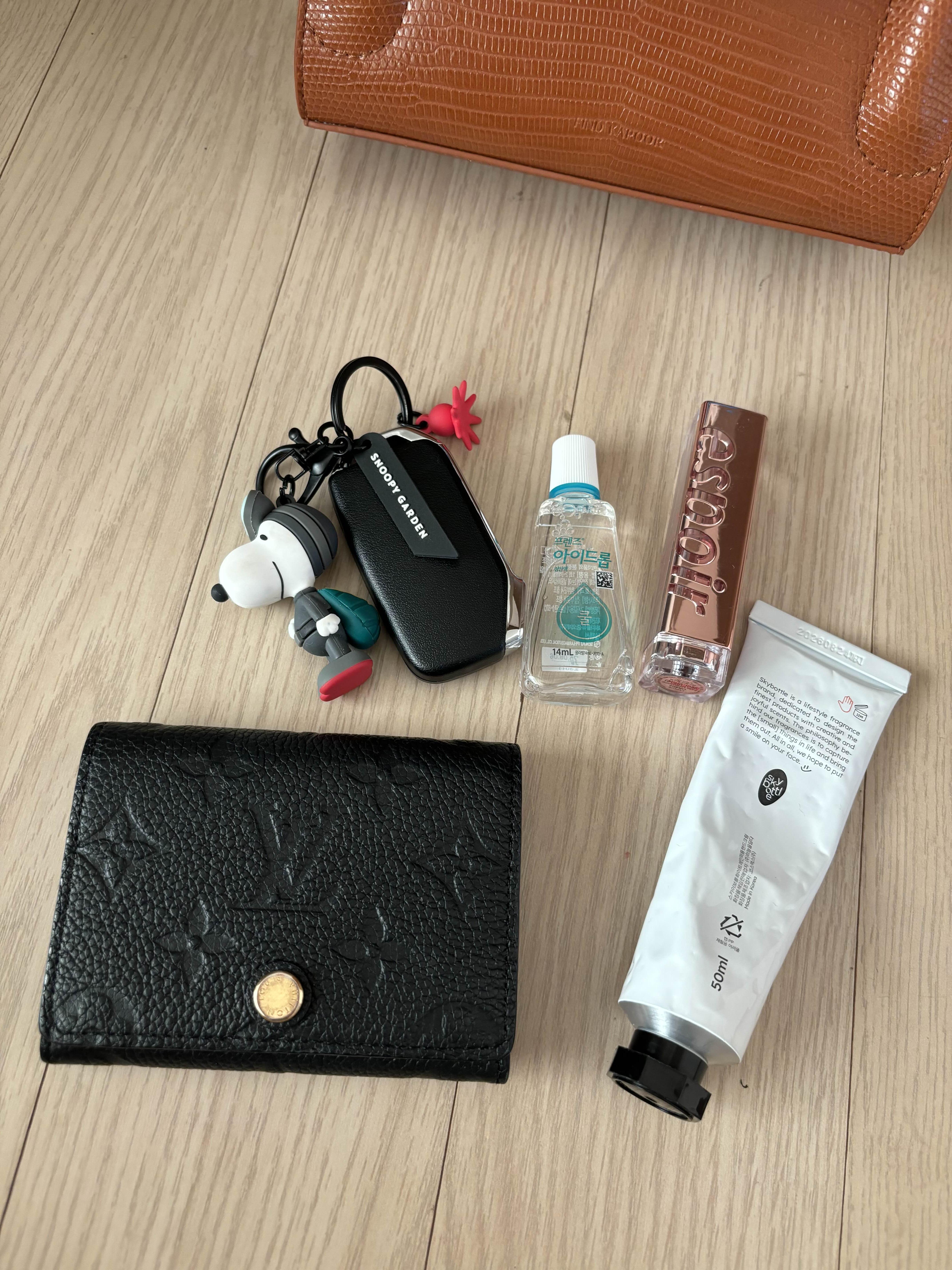 저는 보통 카드명함지갑, 차키, 인공눈물, 립밤 그리고 겨울이라 핸드크림까지 간단하게 들고다니는 편이에요.