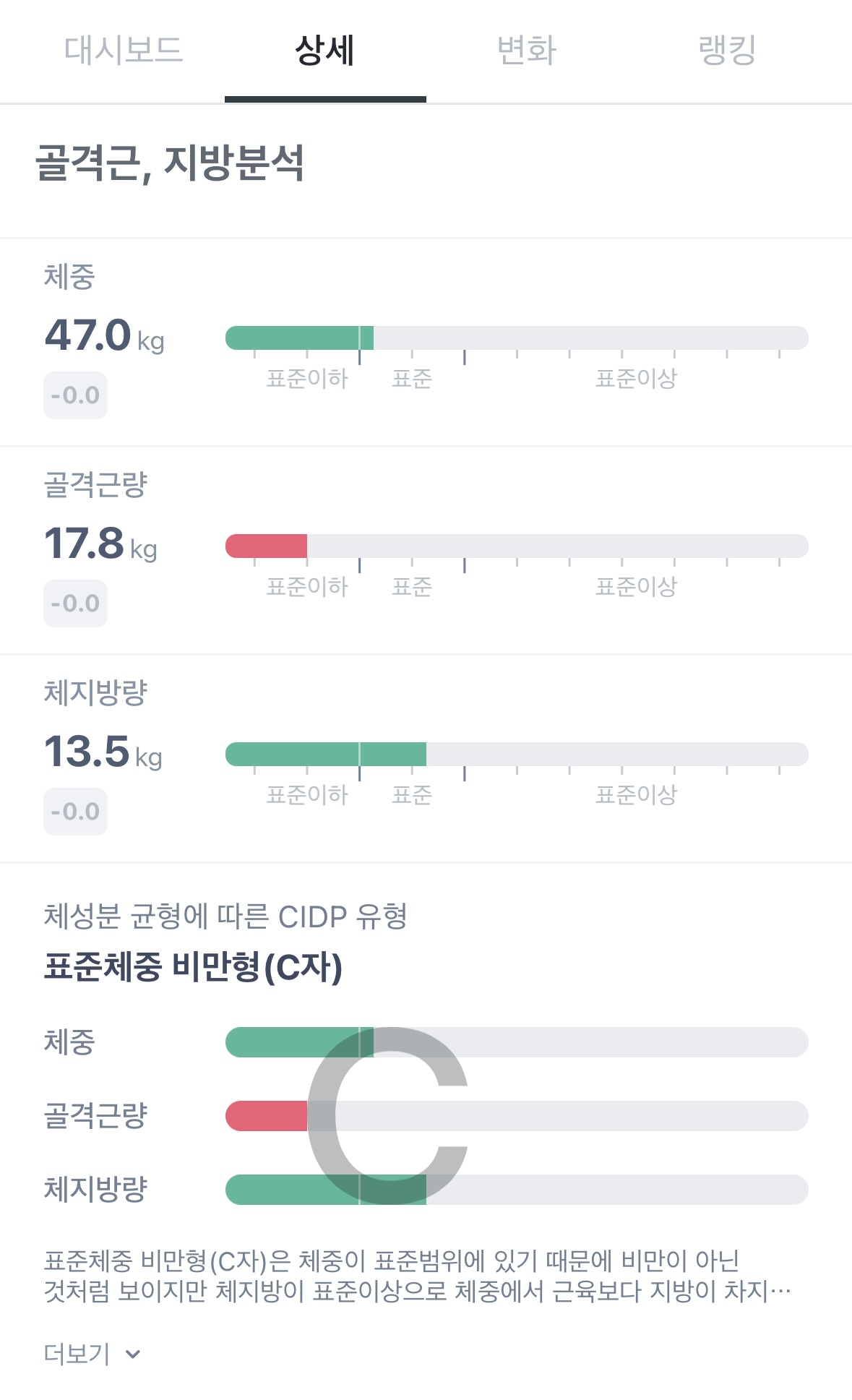 저는 현재 표준체중 허약형(C자)으로 단백질 섭취와 더 많은 운동이 필요한 상황이네요!
