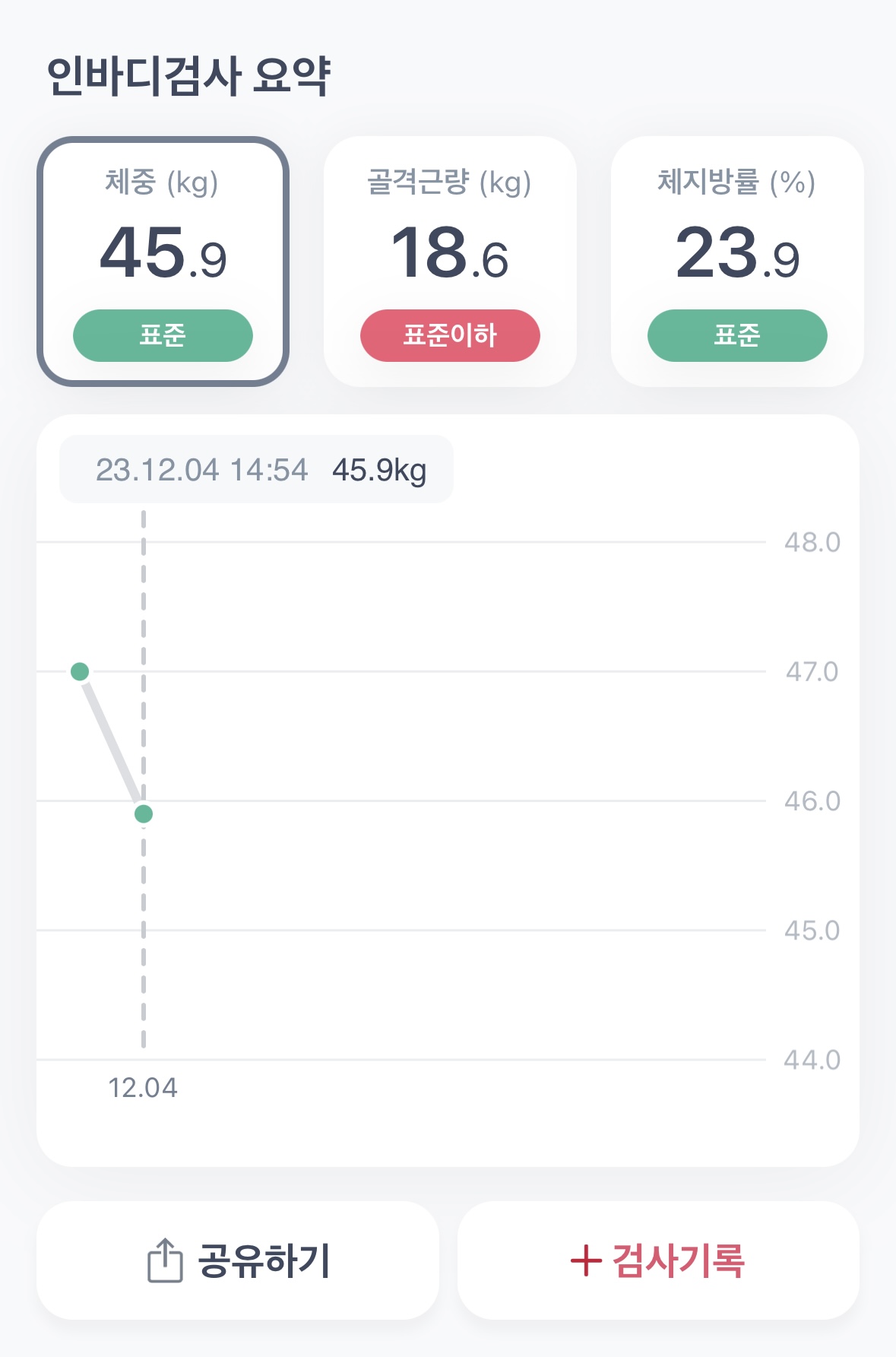 약 1년만인 2023년 12월에 측정한 인바디는 체중 45.9kg(표준), 골격근량 18.6kg(표준이하), 체지방률 23.9%(표준)으로 체중과 체지방률은 표준이지만 여전히 근력은 약한 수치에요.