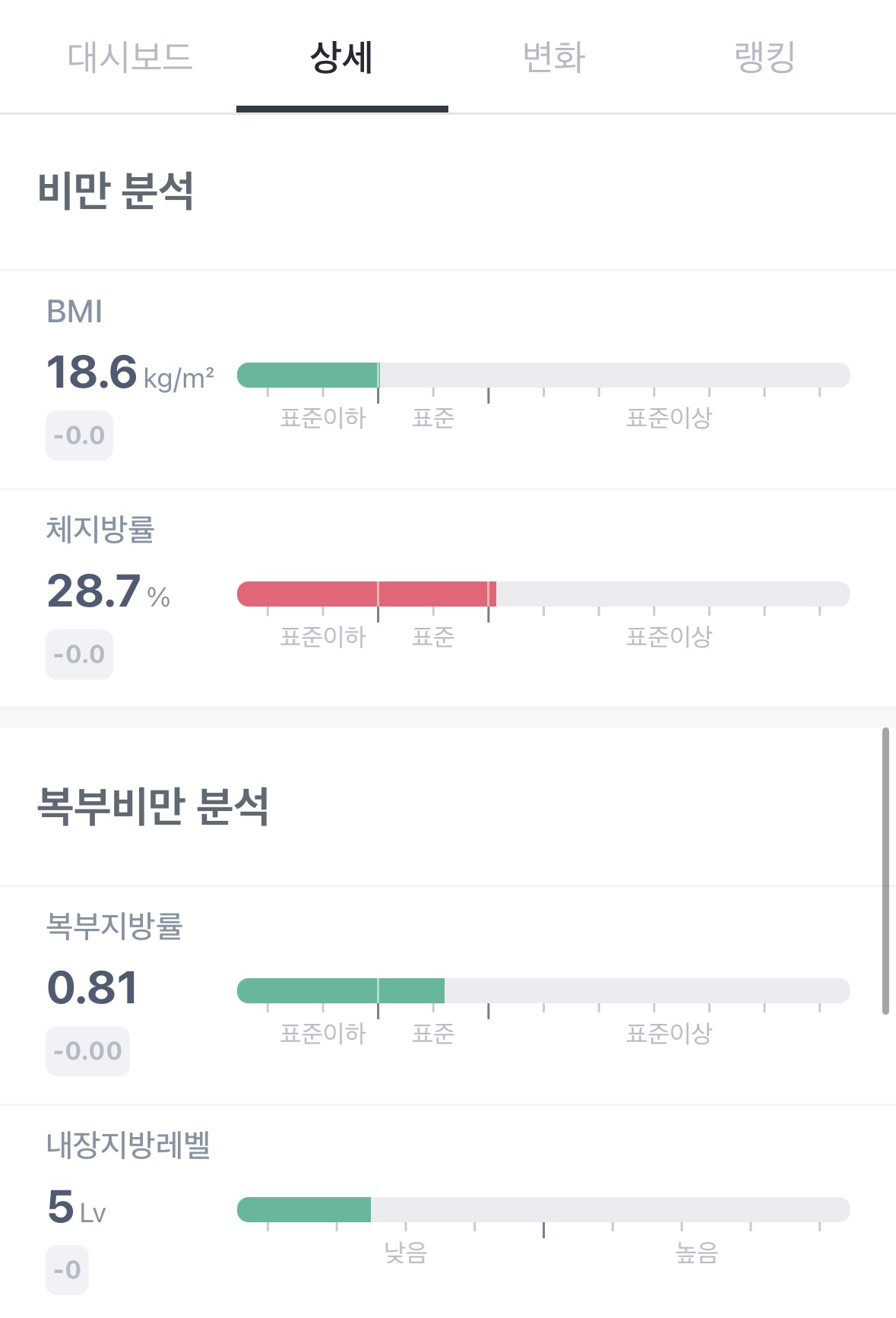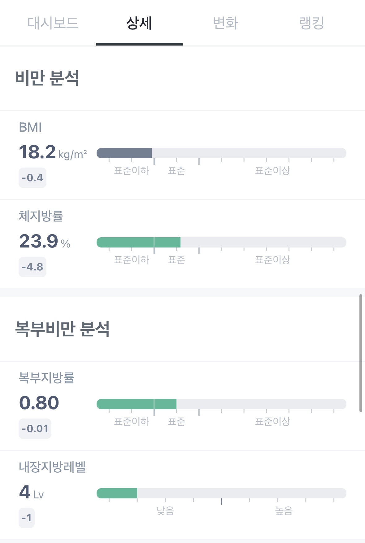 체지방률이 -4.8% 감소하여 표준이상에서 표준 범위로 들어왔구요.