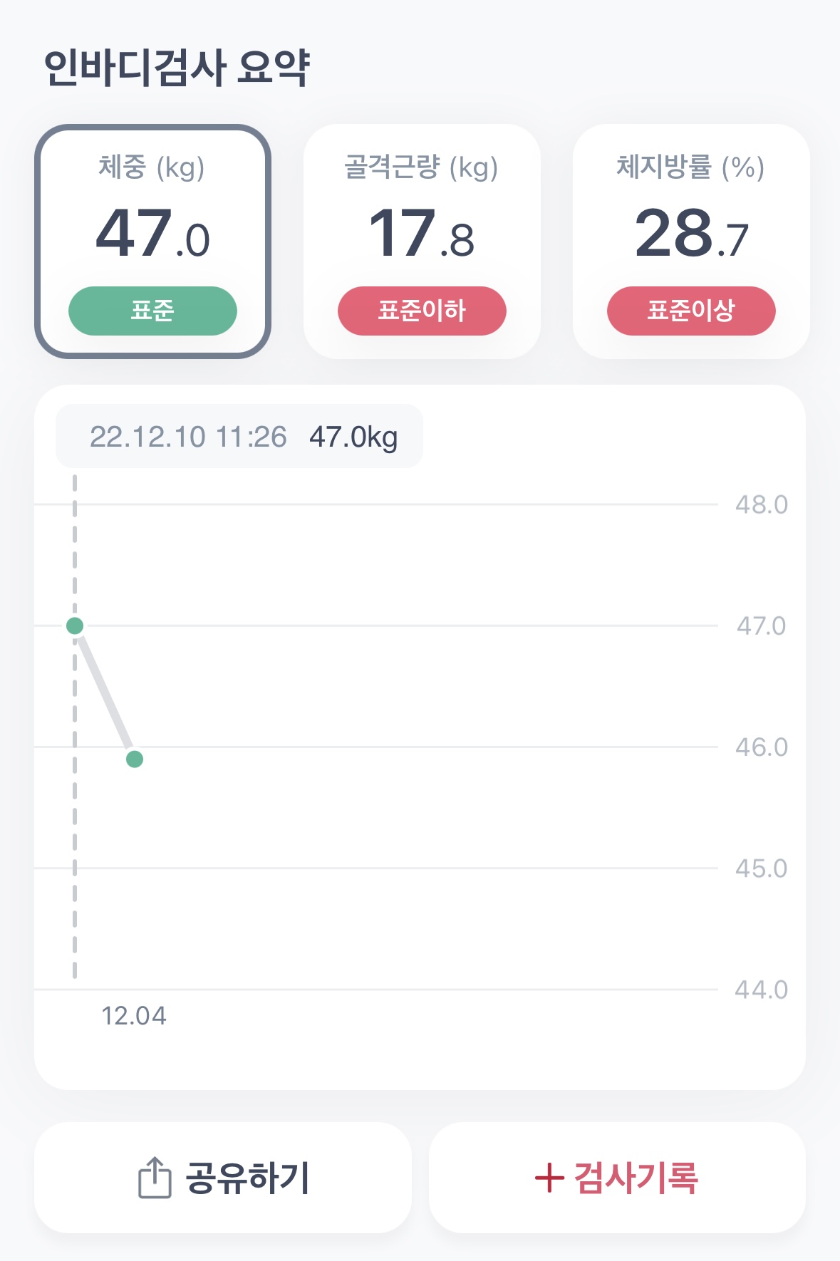 2022년 12월에 측정한 인바디는 체중 47kg(표준), 골격근량 17.8kg(표준이하), 체지방률 28.7%(표준이상) 으로 키 159cm 기준으로 체중은 표준이지만 근력은 약하고 체지방은 몸무게에 비해 약간 높은 수치였어요.