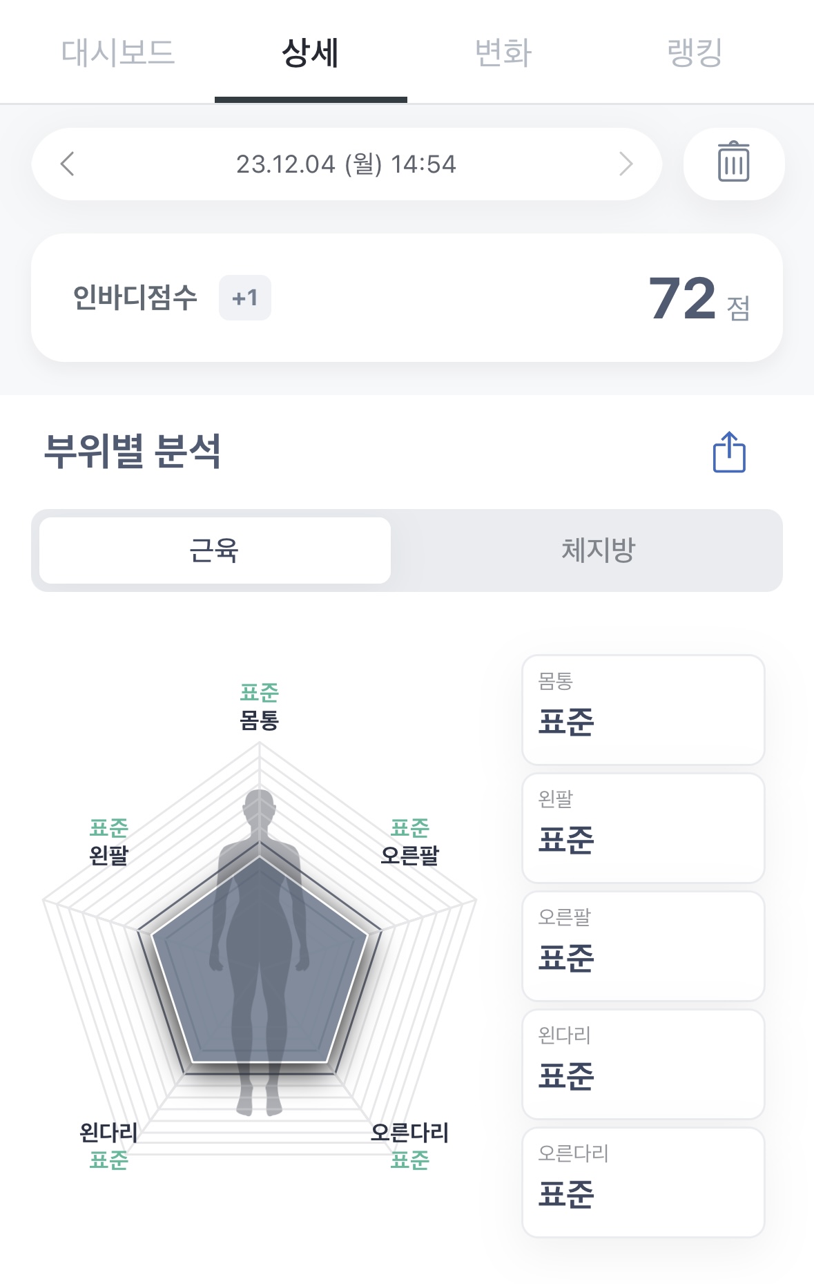 1년후인 오늘 재본 인바디 부위별 분석에서는 모든 부위의 근육이 표준으로 측정되었답니다 :)