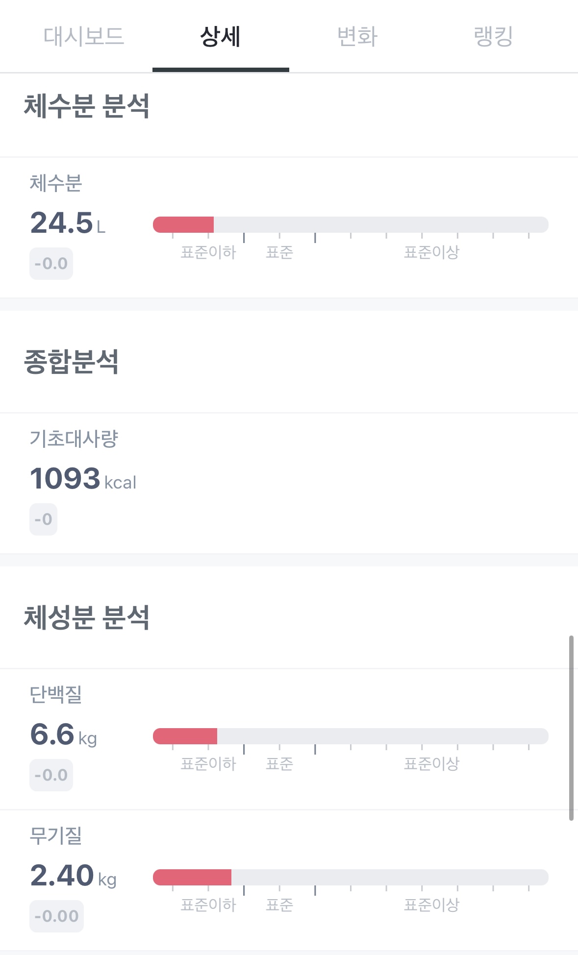 골격근량은 여전히 표준 이하이지만, 1년 전에 비해 0.8kg 증가했기 때문에, 근력이 정말 안붙는 제 몸에 이정도 근력이 증가한 것만으로도 전 너무 만족스러웠어요!