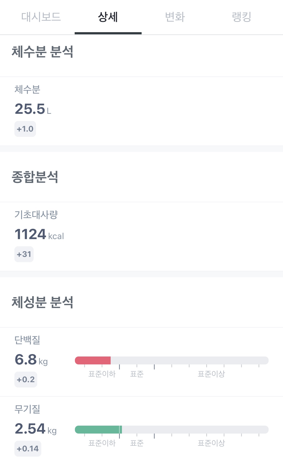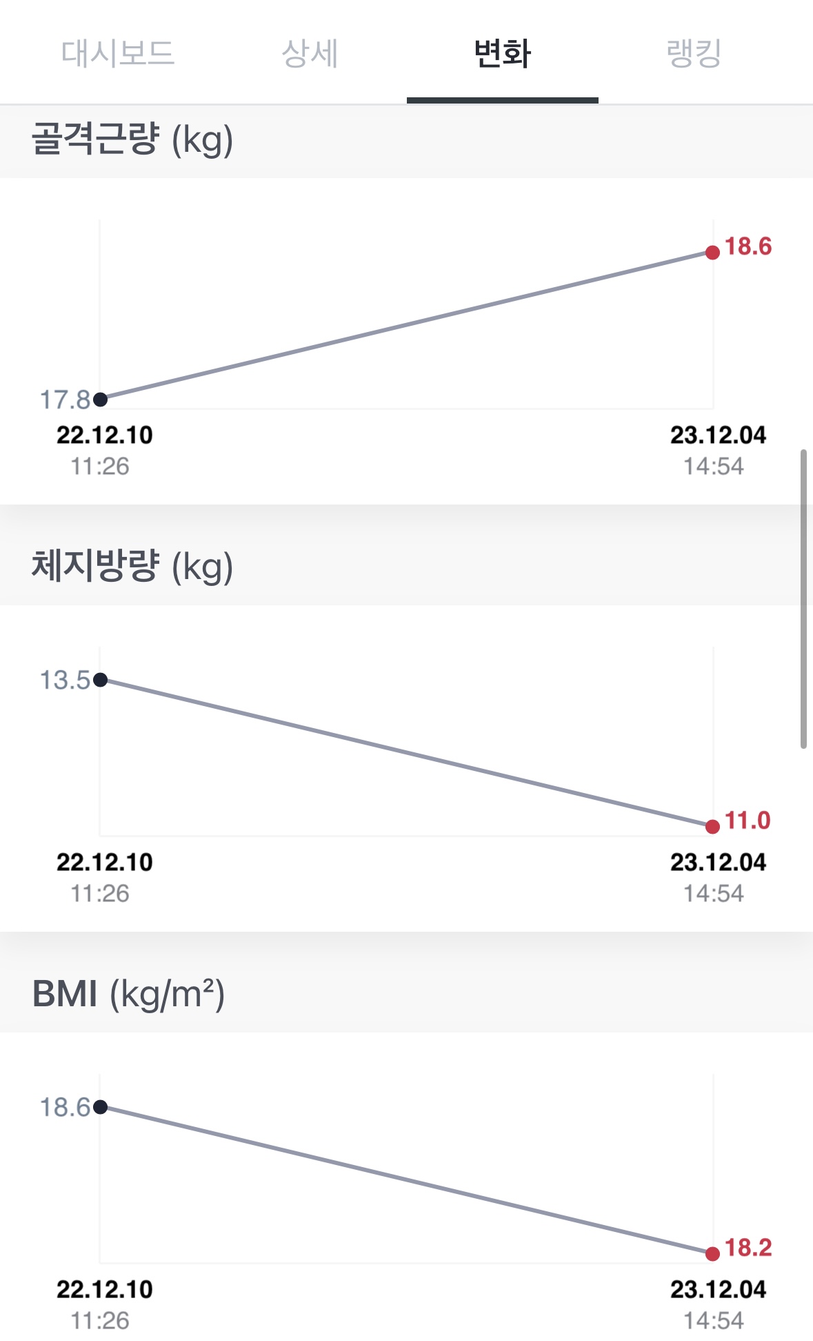 골격근량과 기초대사량의 증가, 체지방량의 감소가 가장 눈에 띄네요 :)