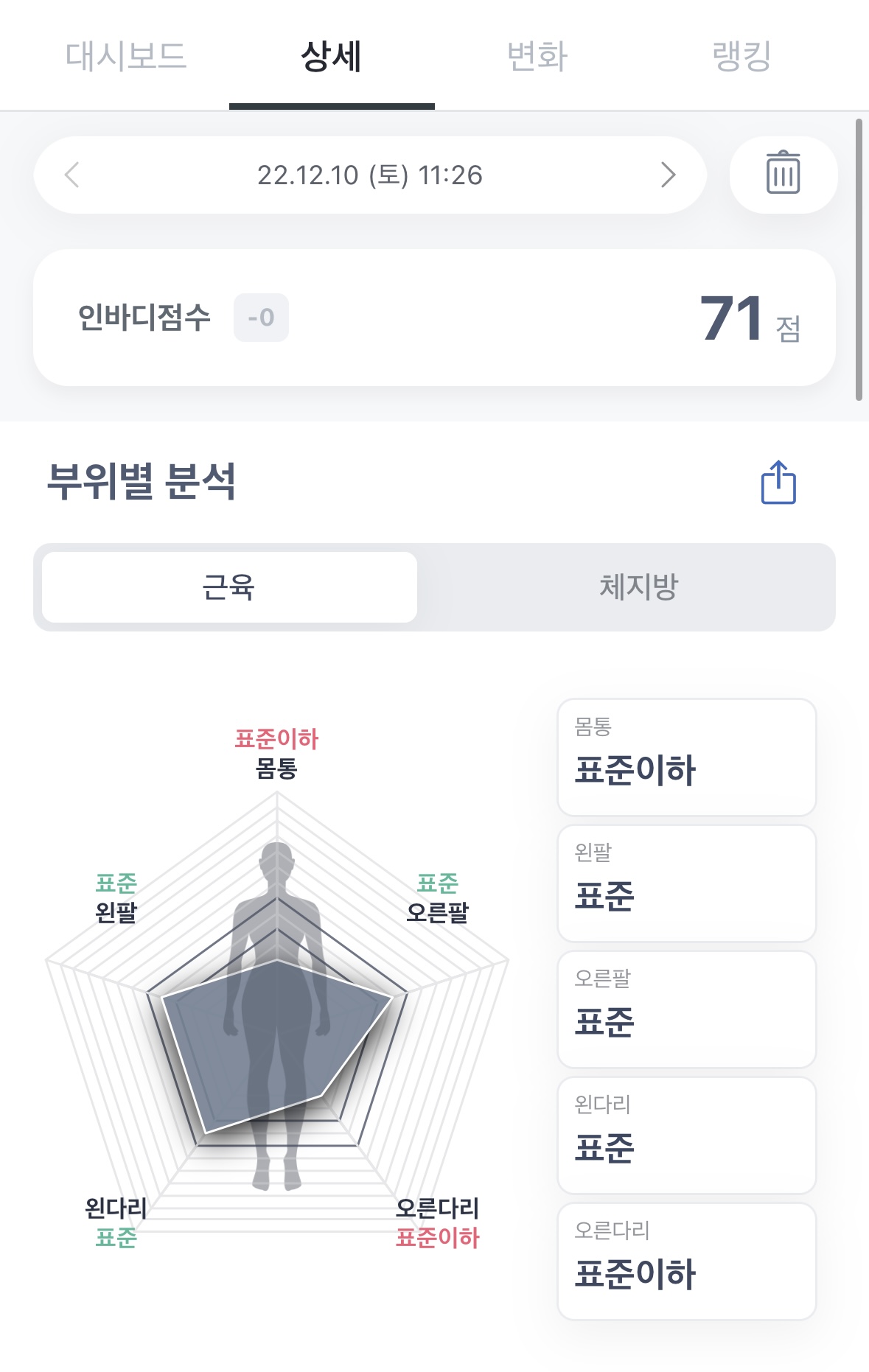 1년전 인바디 부위별 분석에서는 몸통과 오른다리 근육이 표준이하로 측정이 되었었는데요.