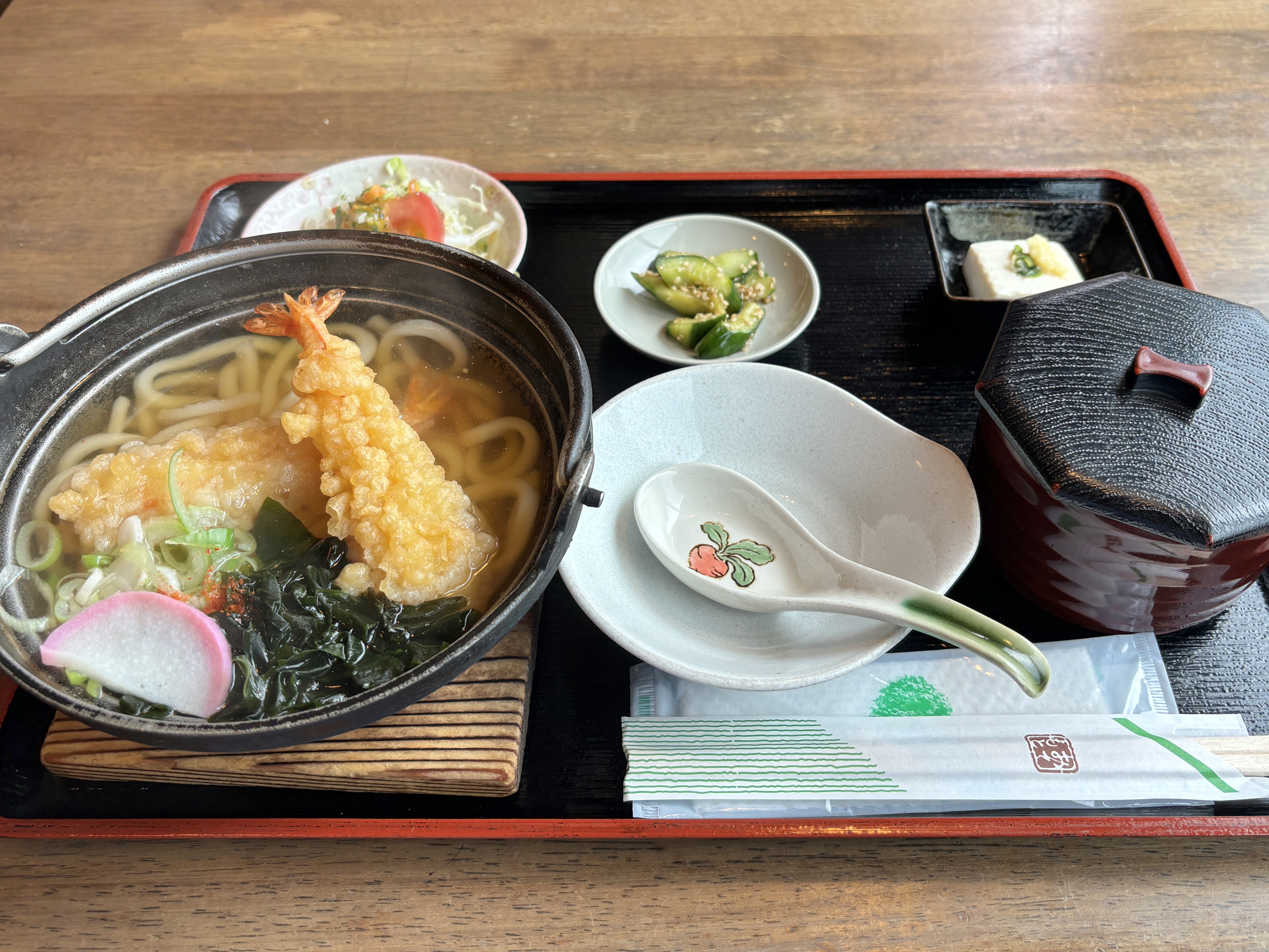저희는 새우튀김이 들어간 우동 정식과 데미그라스 함바그를 시켰습니다.