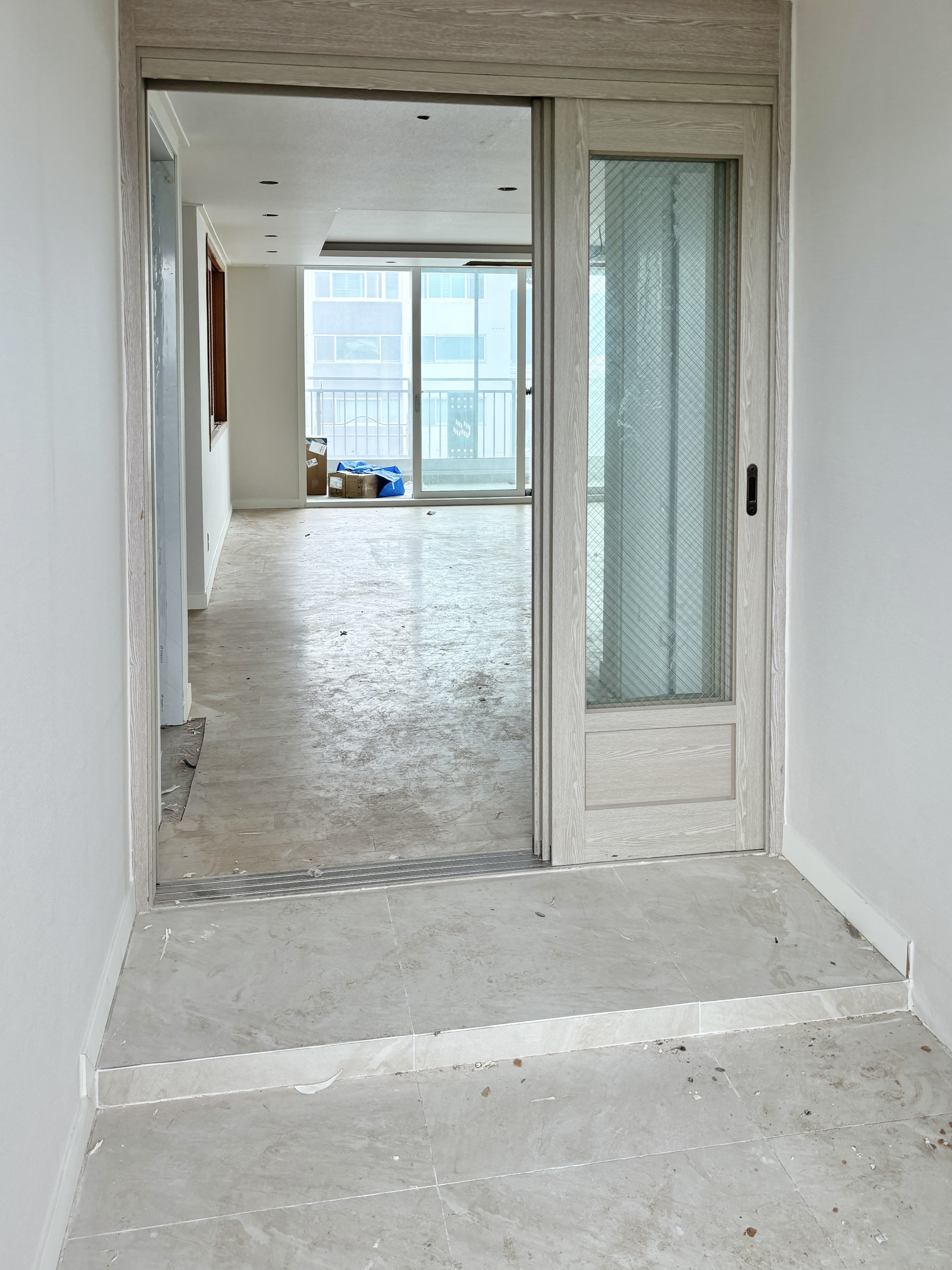 우선 바닥 타일을 전체 교체했고, 발코니에 있던 펜트리 공간을 모두 철거하고 다시 짜넣기로 했어요.