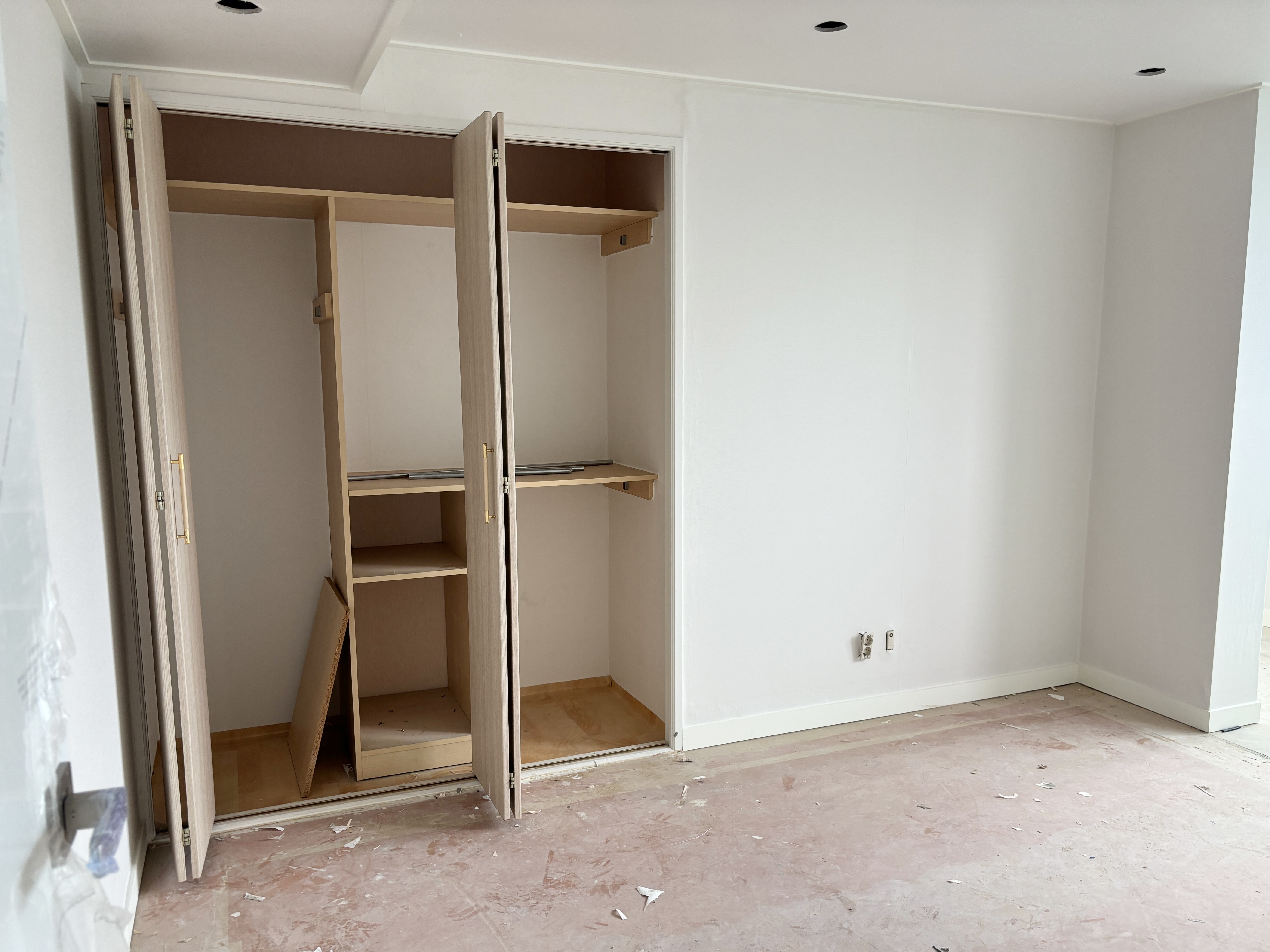 창 옆 한쪽 벽면은 붙박이장을 설치하기로 했고, 화장실 및 파우더룸 공간으로 들어가는 쪽에는 슬라이딩 도어를 설치할 예정입니다.