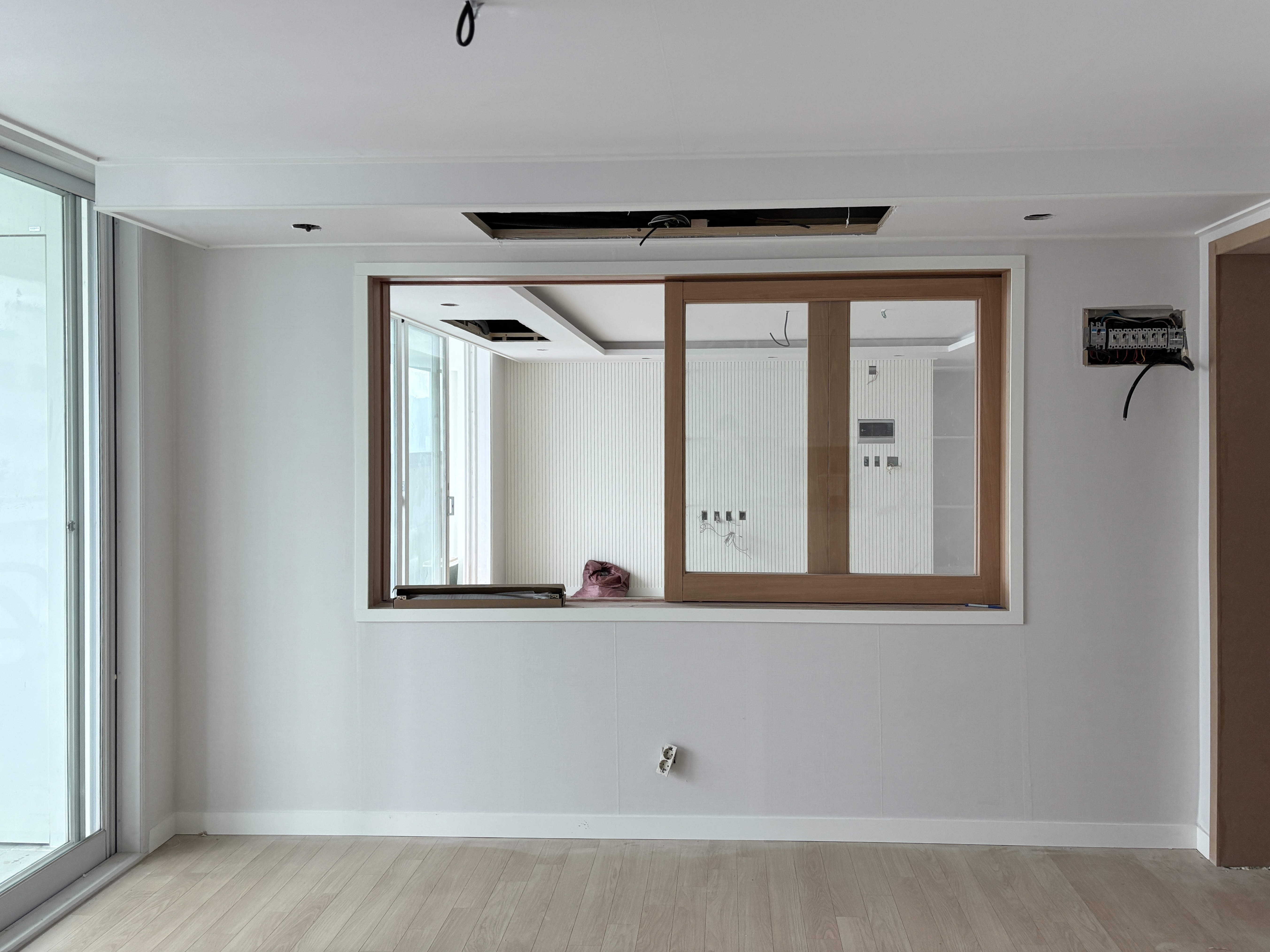 부엌과 거실 사이에 큰 창이 있는데, 안에 붙어있던 창 간살을 모두 떼어냈어요.